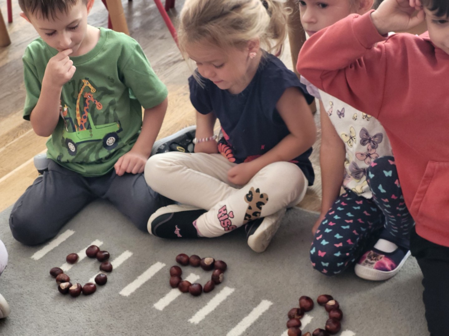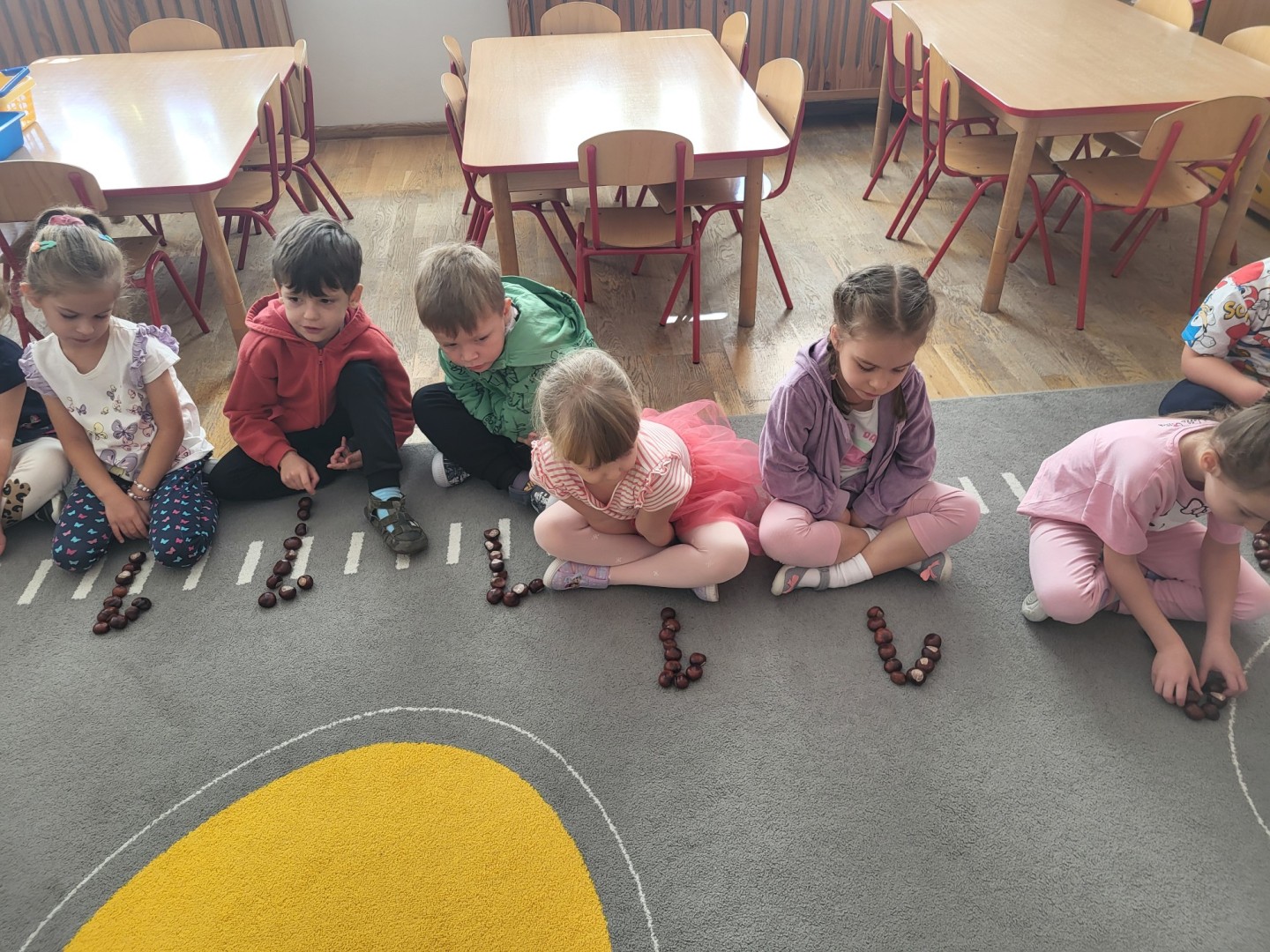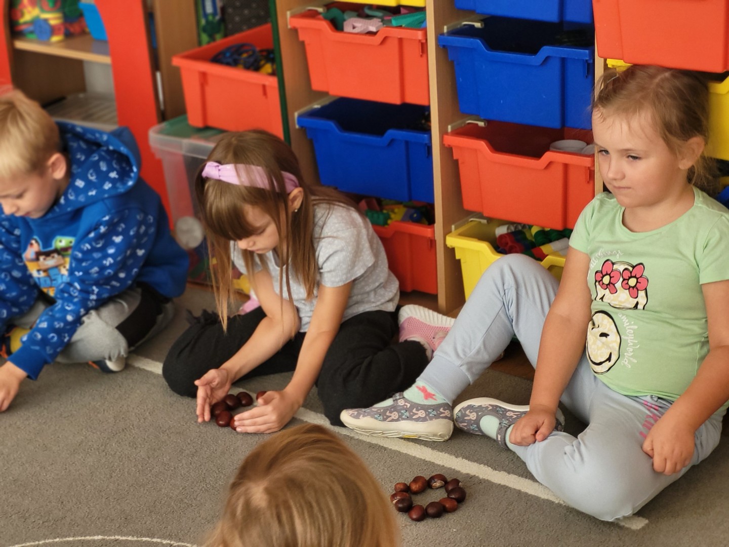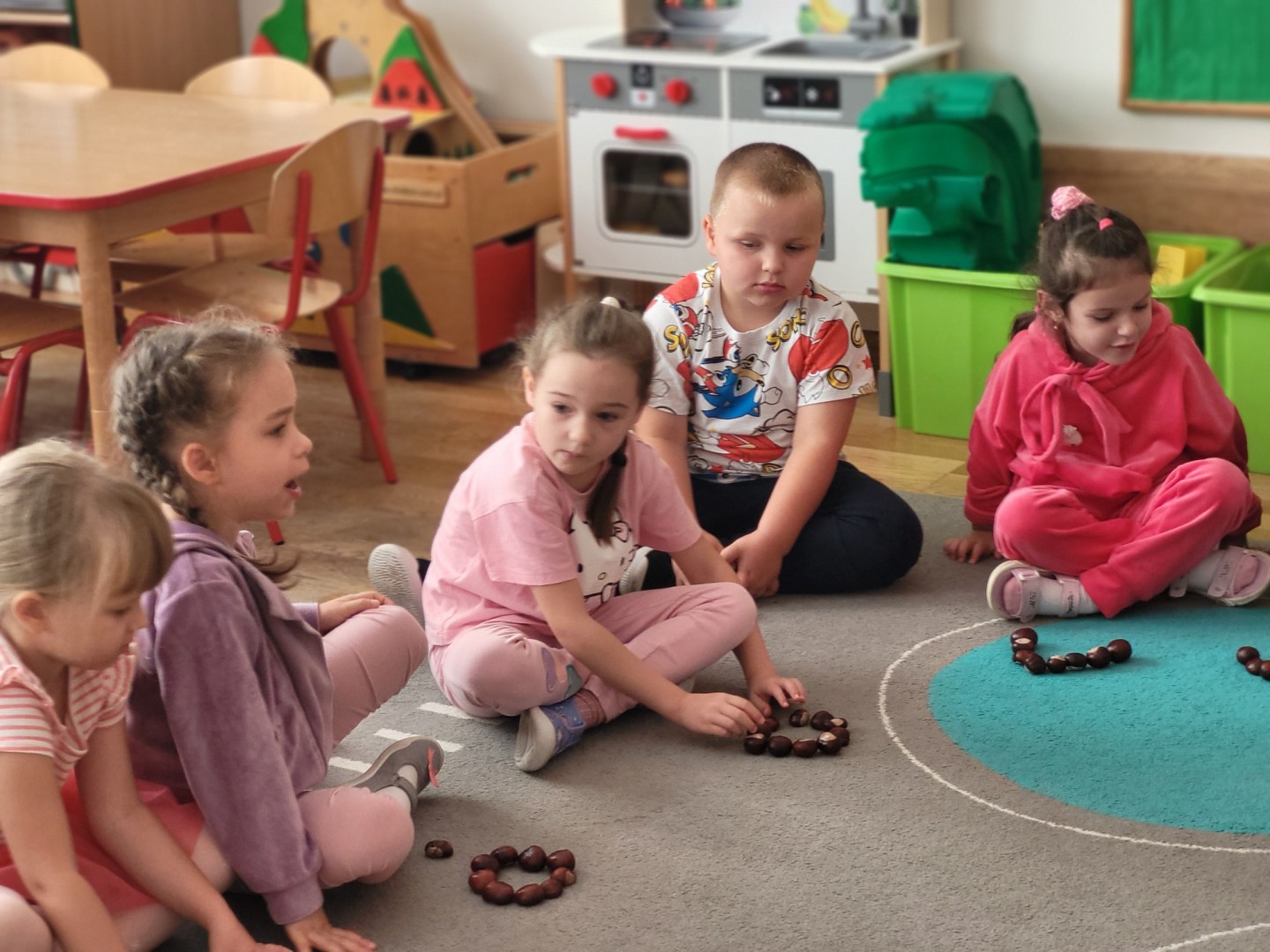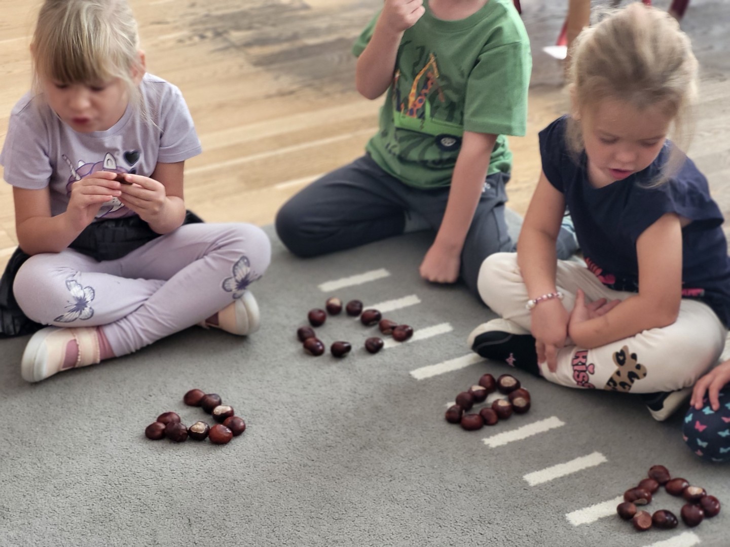 W dniach 20.10-24.10. 2025r. w grupie „Zajączki” realizowany był projekt edukacyjny pt. „Matematyka w jesiennej przyrodzie ukryta”. Przygotowaniem do zajęć było zgromadzenie jesiennych darów podczas spacerów po najbliższej okolicy przedszkola. W ramach zaproponowanych zajęć dzieci uczyły się liczyć ; mierzyć; ważyć; układać rytmy; klasyfikować przedmioty; określać: mniejszy/większy, dłuższy/ krótszy, mniej/więcej/ tyle samo; orientować się w przestrzeni poprzez odczytywanie wskazań strzałki. Wykonywały również proste działania matematyczne: dodawanie, odejmowanie. Zwieńczeniem realizowanego projektu było wykonanie „ Drzewa Matematycznego”.
