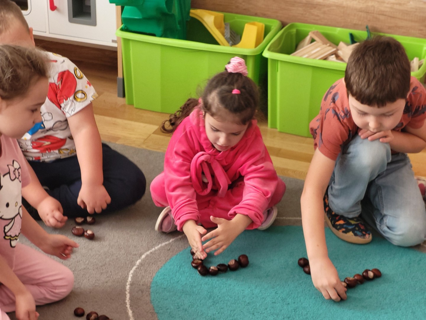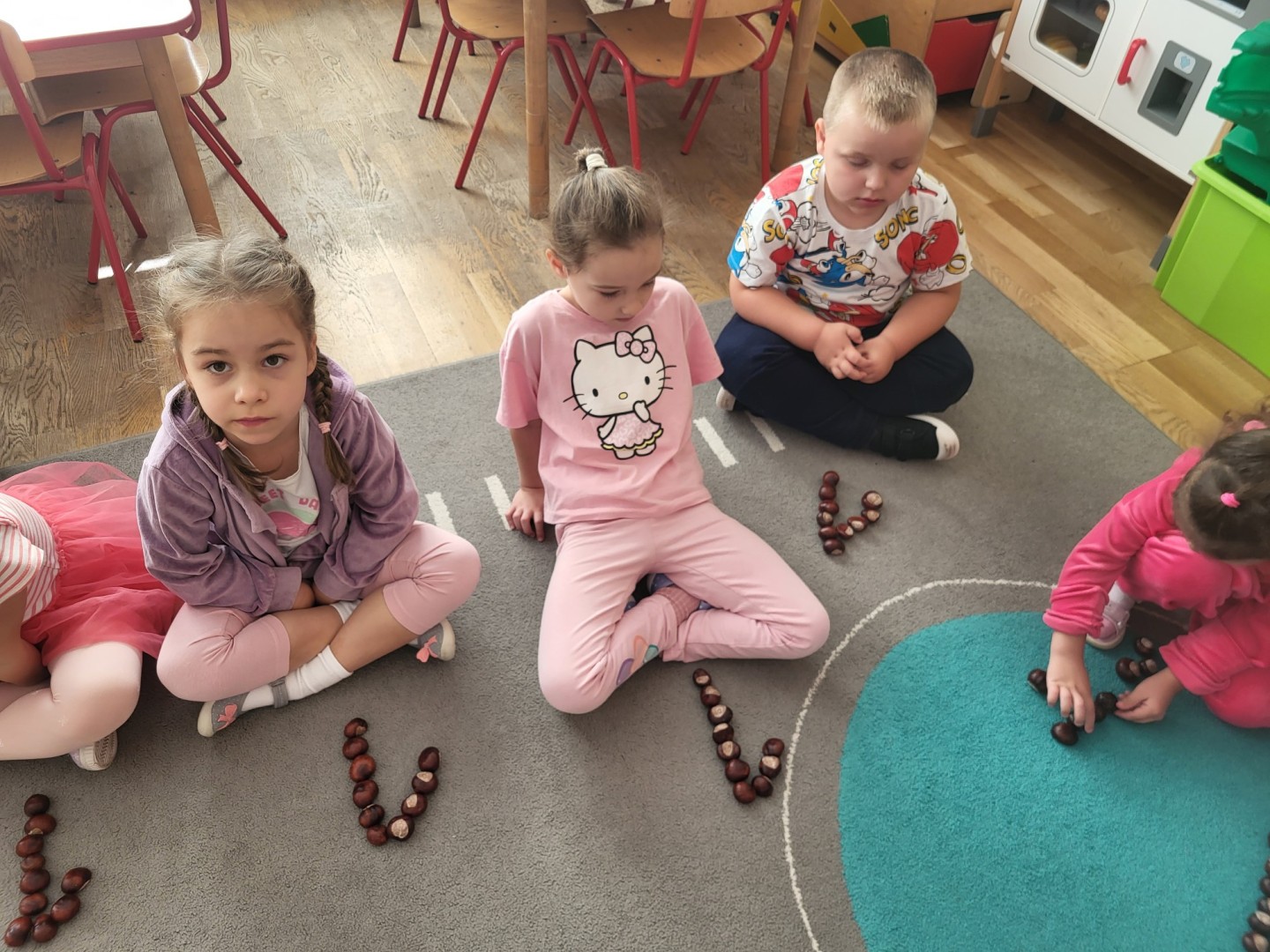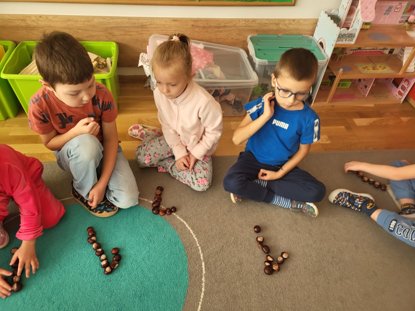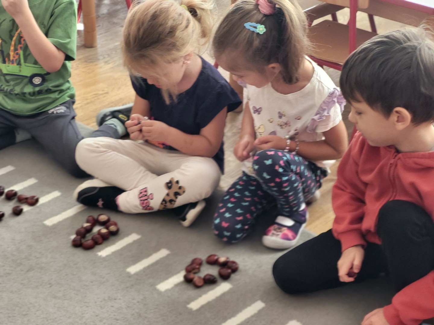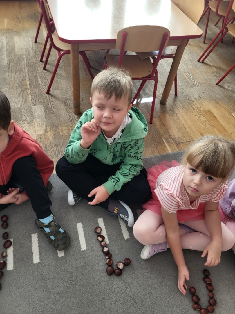W dniach 20.10-24.10. 2025r. w grupie „Zajączki” realizowany był projekt edukacyjny pt. „Matematyka w jesiennej przyrodzie ukryta”. Przygotowaniem do zajęć było zgromadzenie jesiennych darów podczas spacerów po najbliższej okolicy przedszkola. W ramach zaproponowanych zajęć dzieci uczyły się liczyć ; mierzyć; ważyć; układać rytmy; klasyfikować przedmioty; określać: mniejszy/większy, dłuższy/ krótszy, mniej/więcej/ tyle samo; orientować się w przestrzeni poprzez odczytywanie wskazań strzałki. Wykonywały również proste działania matematyczne: dodawanie, odejmowanie. Zwieńczeniem realizowanego projektu było wykonanie „ Drzewa Matematycznego”.