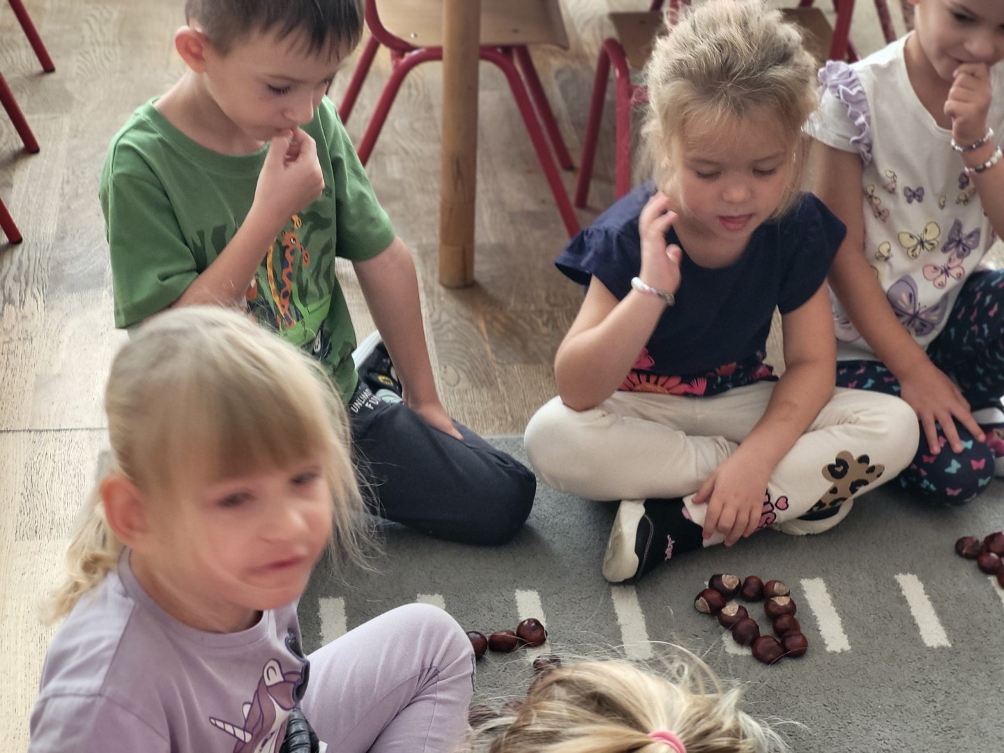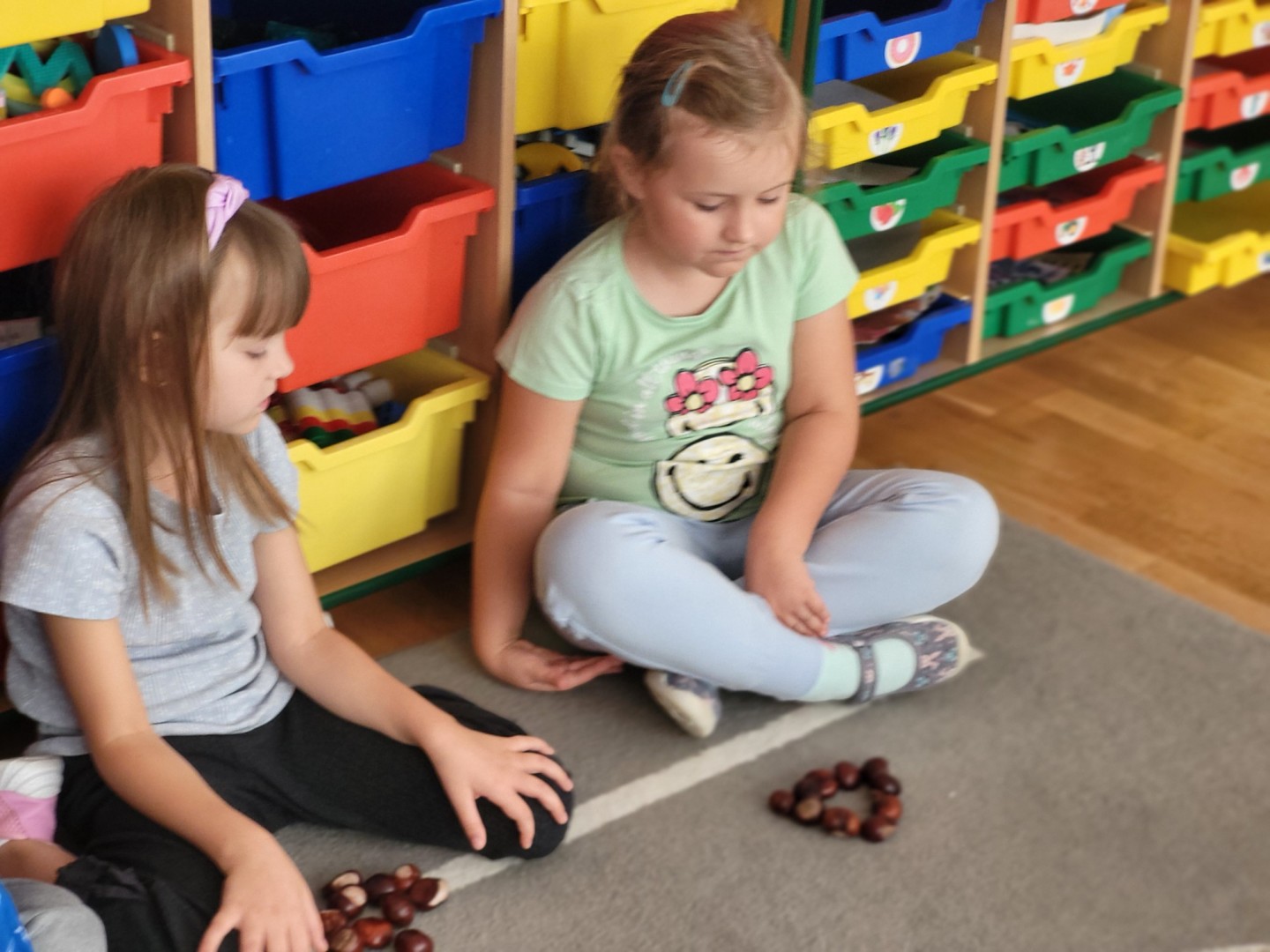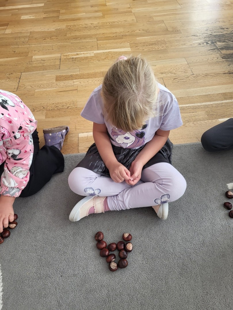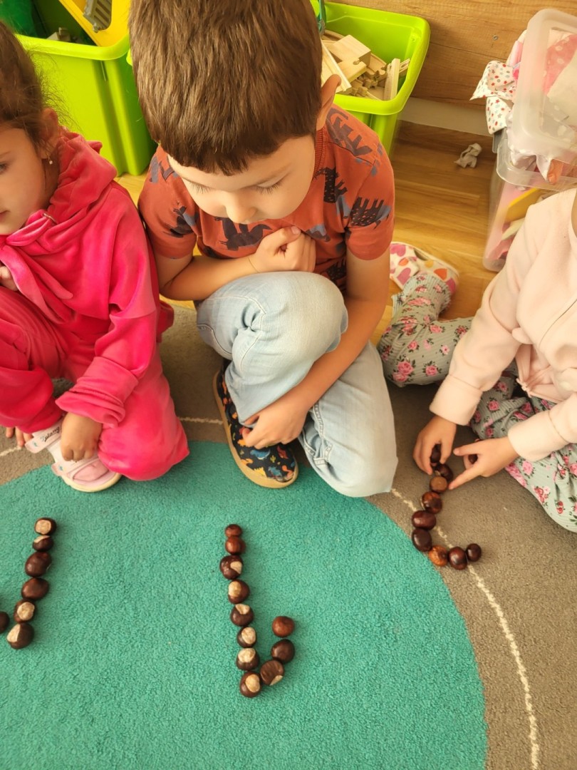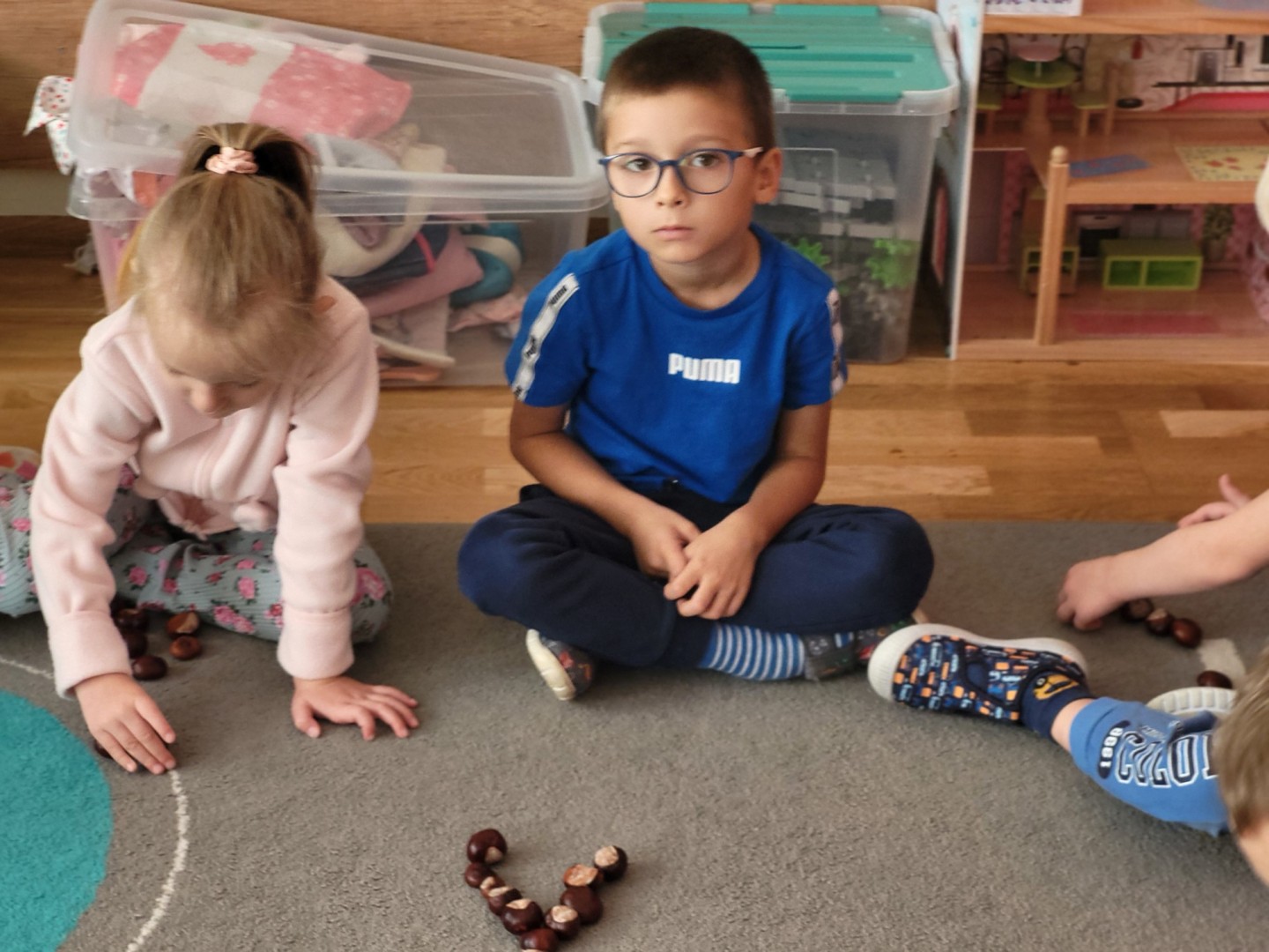 W dniach 20.10-24.10. 2025r. w grupie „Zajączki” realizowany był projekt edukacyjny pt. „Matematyka w jesiennej przyrodzie ukryta”. Przygotowaniem do zajęć było zgromadzenie jesiennych darów podczas spacerów po najbliższej okolicy przedszkola. W ramach zaproponowanych zajęć dzieci uczyły się liczyć ; mierzyć; ważyć; układać rytmy; klasyfikować przedmioty; określać: mniejszy/większy, dłuższy/ krótszy, mniej/więcej/ tyle samo; orientować się w przestrzeni poprzez odczytywanie wskazań strzałki. Wykonywały również proste działania matematyczne: dodawanie, odejmowanie. Zwieńczeniem realizowanego projektu było wykonanie „ Drzewa Matematycznego”.