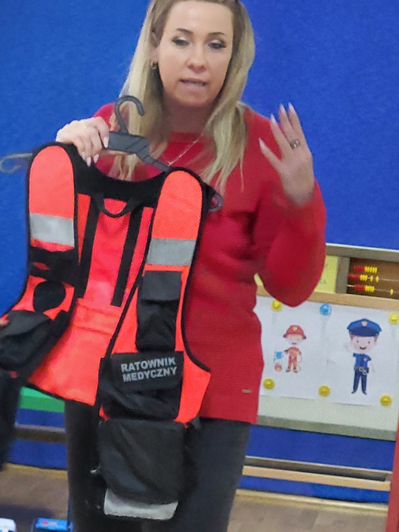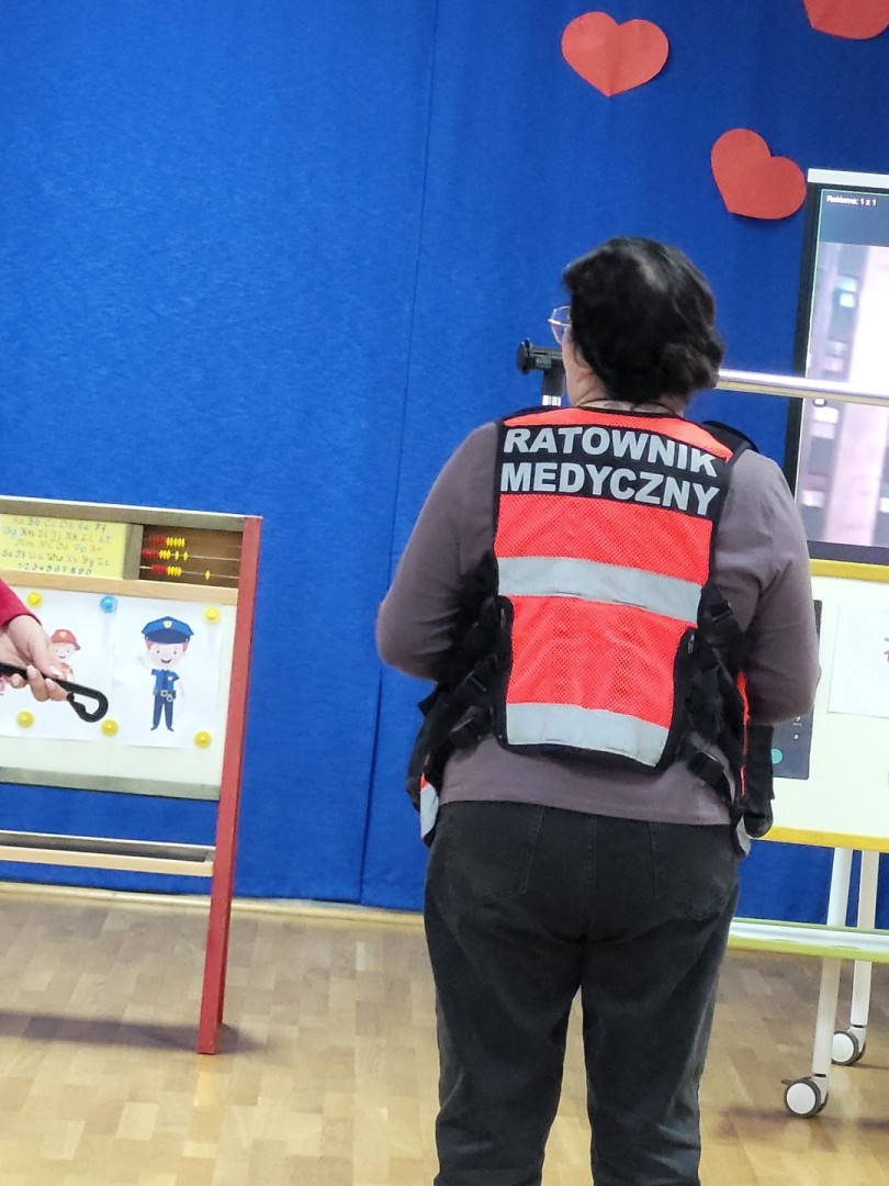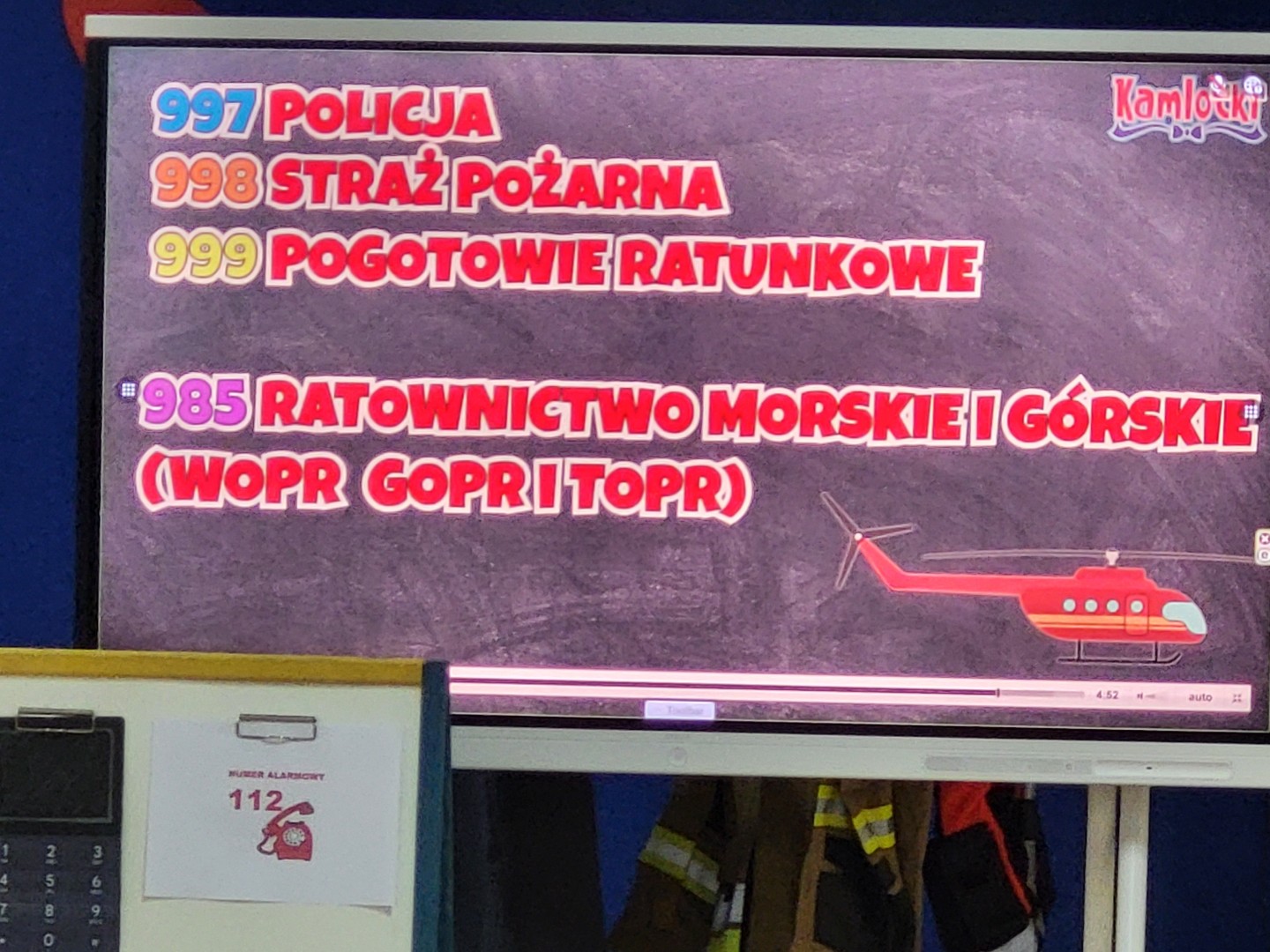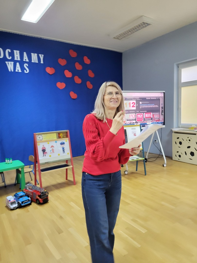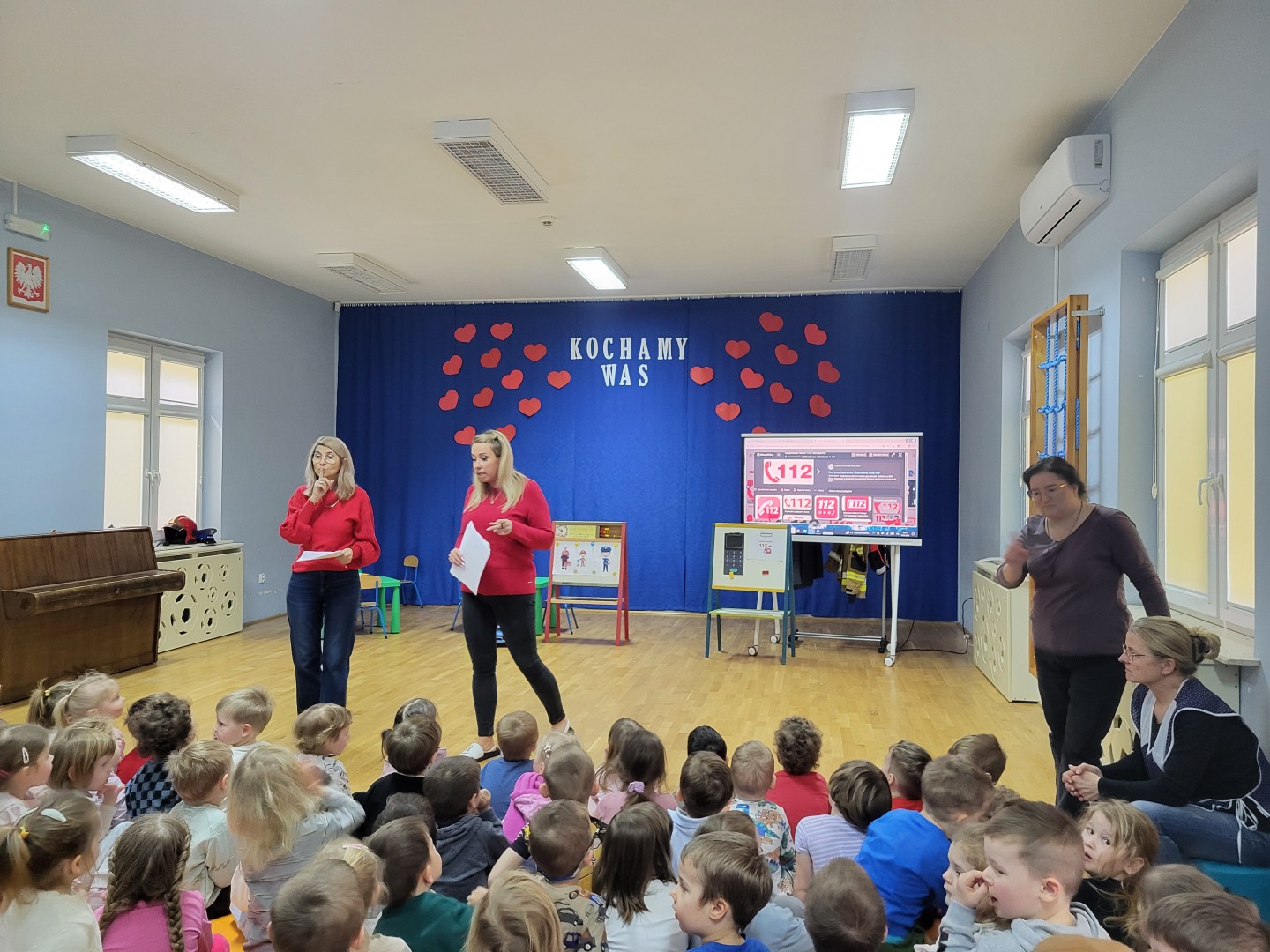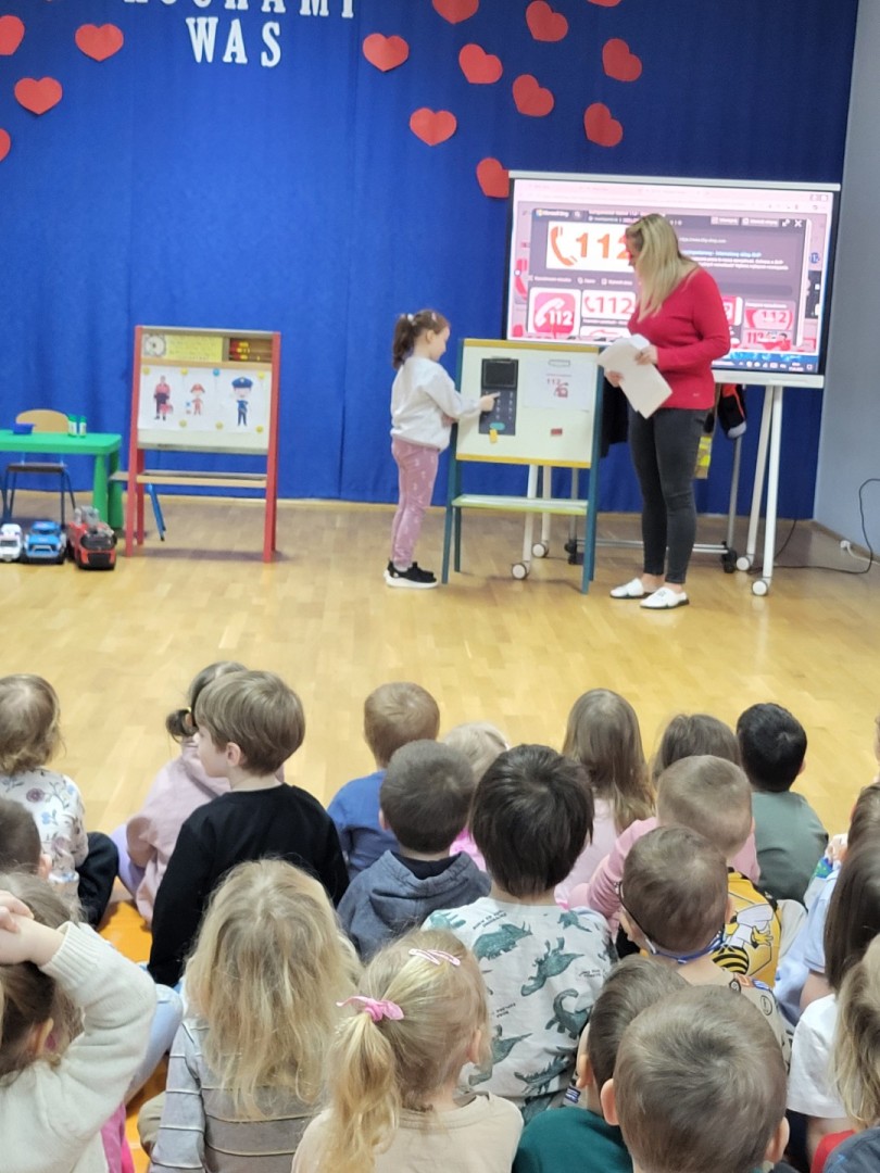Na początku zajęć nauczycielki wyjaśniły dzieciom, czym jest numer alarmowy 112 i do czego służy. Przedszkolaki dowiedziały się, że pod ten numer można zadzwonić w sytuacjach zagrożenia zdrowia, życia lub mienia, aby wezwać odpowiednie służby ratunkowe, takie jak policja, straż pożarna czy pogotowie ratunkowe. Omówiono także zasady prawidłowego zgłaszania zdarzenia oraz przypomniano, że numeru alarmowego nie wolno używać dla zabawy.