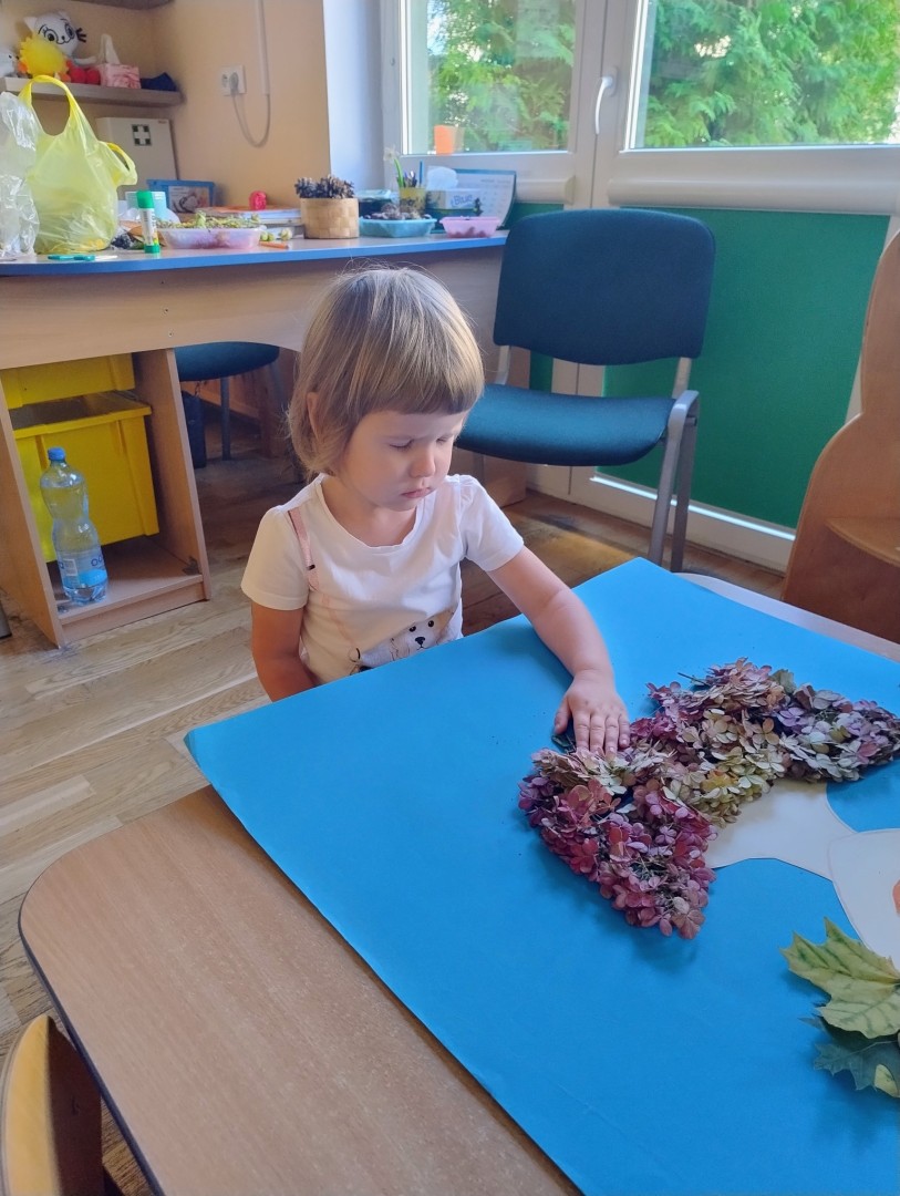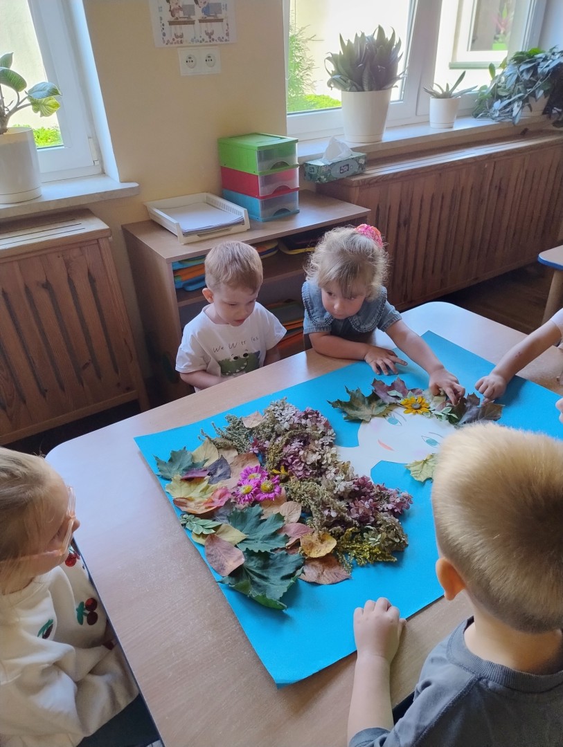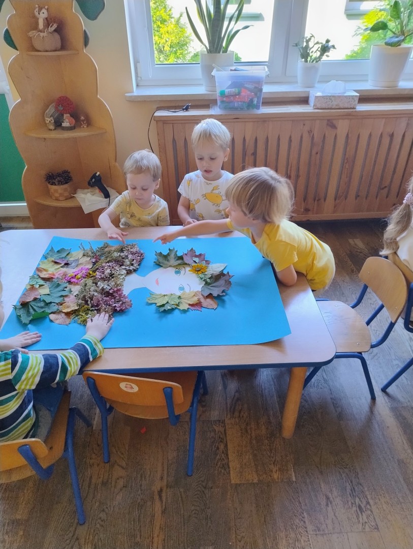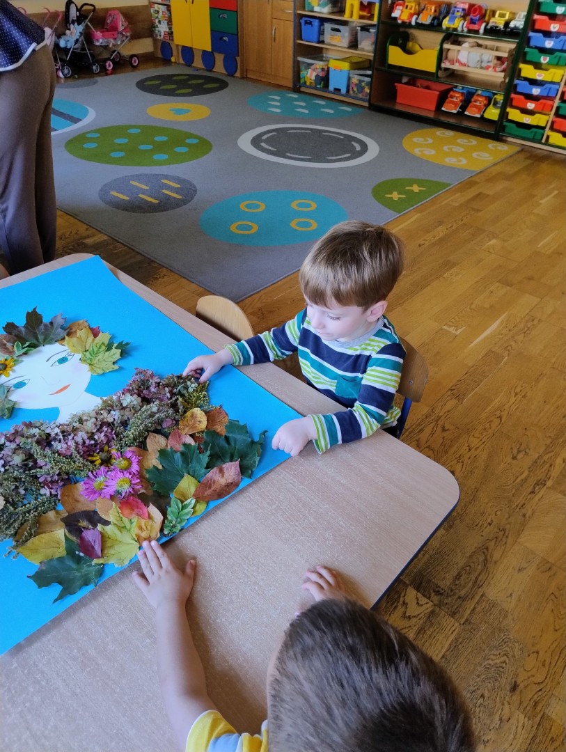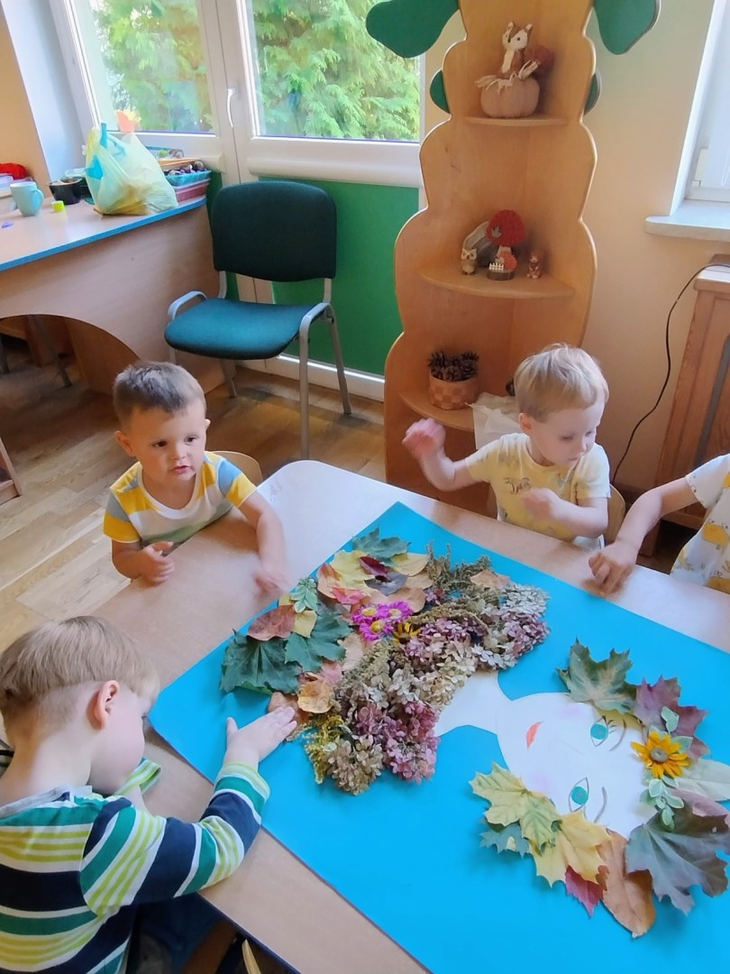 23,09,2025r. dzieci z grupy II “Kotki” uroczyście powitały “Pierwszy Dzień Jesieni”. Celem zajęć było poszerzanie wiedzy przyrodniczej na temat tej pory roku. Dzieci z zainteresowaniem wysłuchały opowiadania pt.: “Spacer po parku”, oglądały zgromadzone w sali dary jesieni. Chętnie uczestniczyły w zabawie ruchowej pt.: “Skarby jesieni” z wykorzystaniem opasek. Na zakończenie wspólnie z suchych liści i kwiatów wykonano pracę plastyczną “Portret Pani Jesieni”.