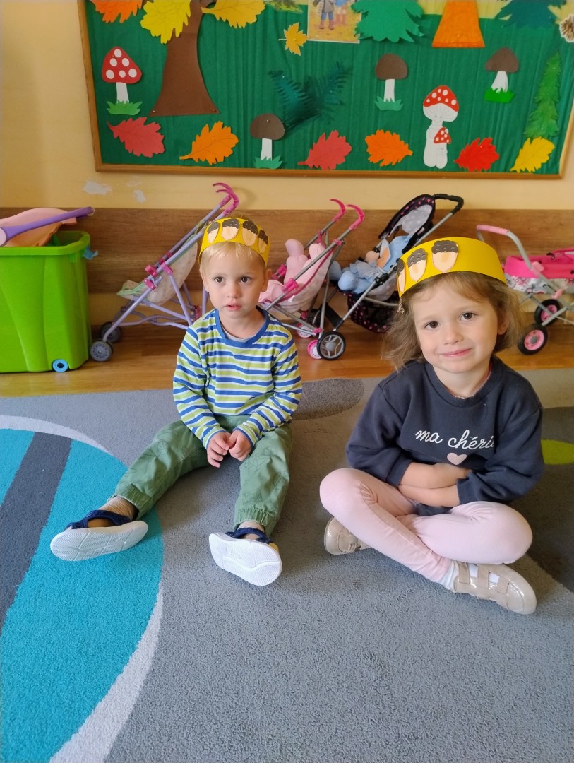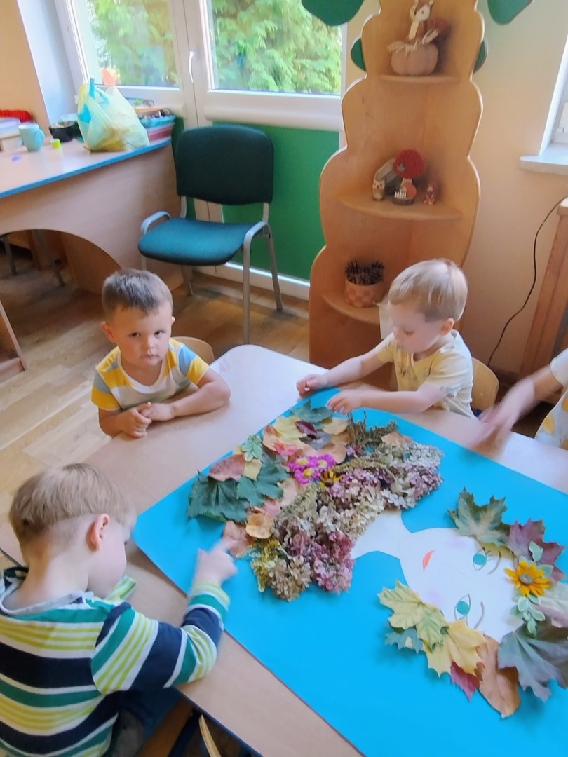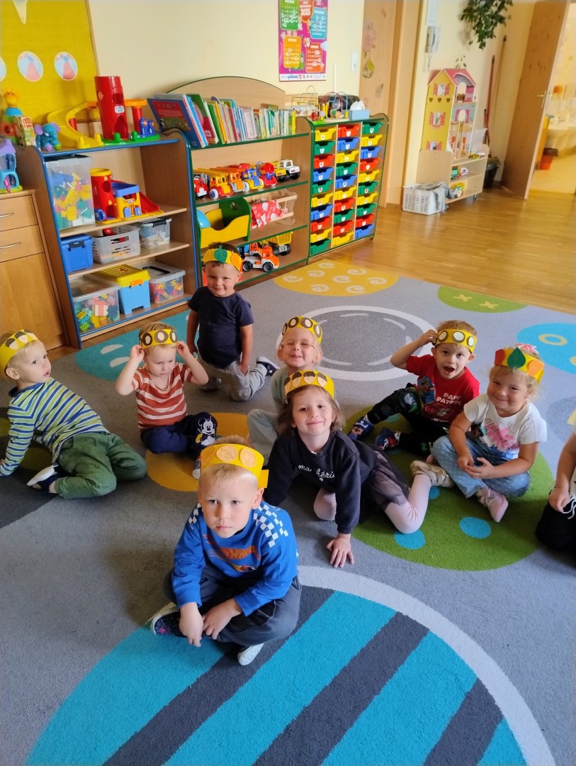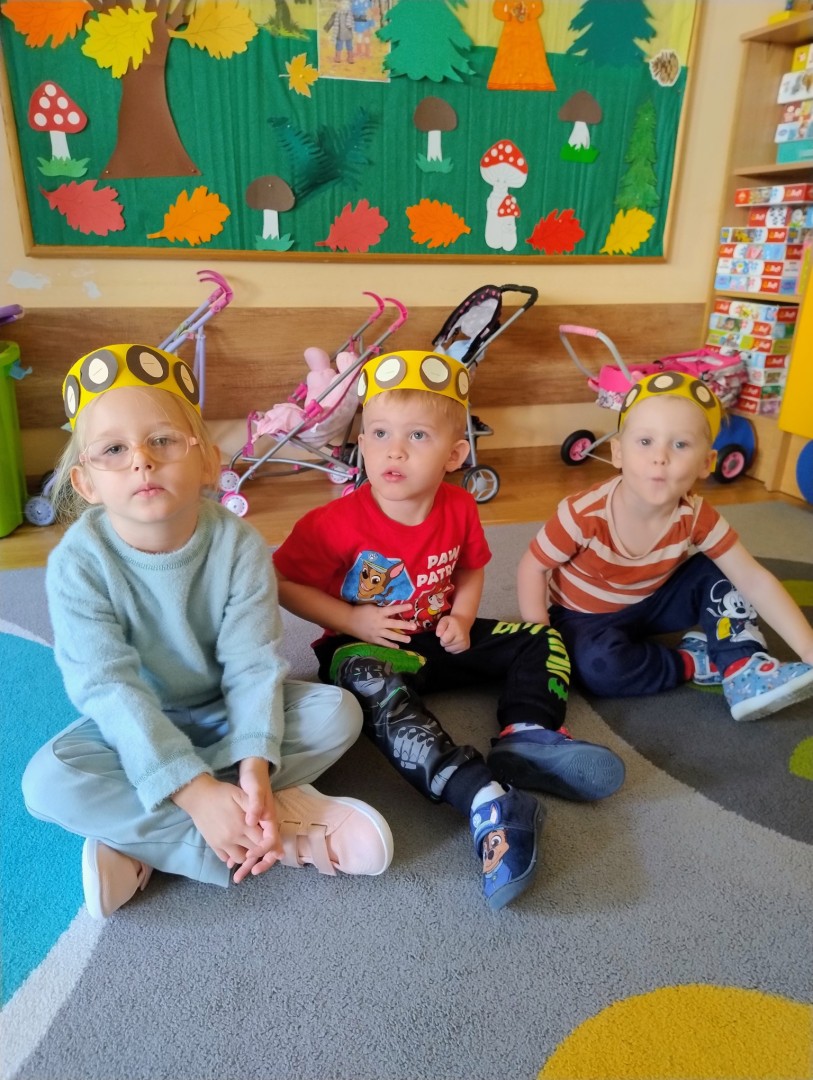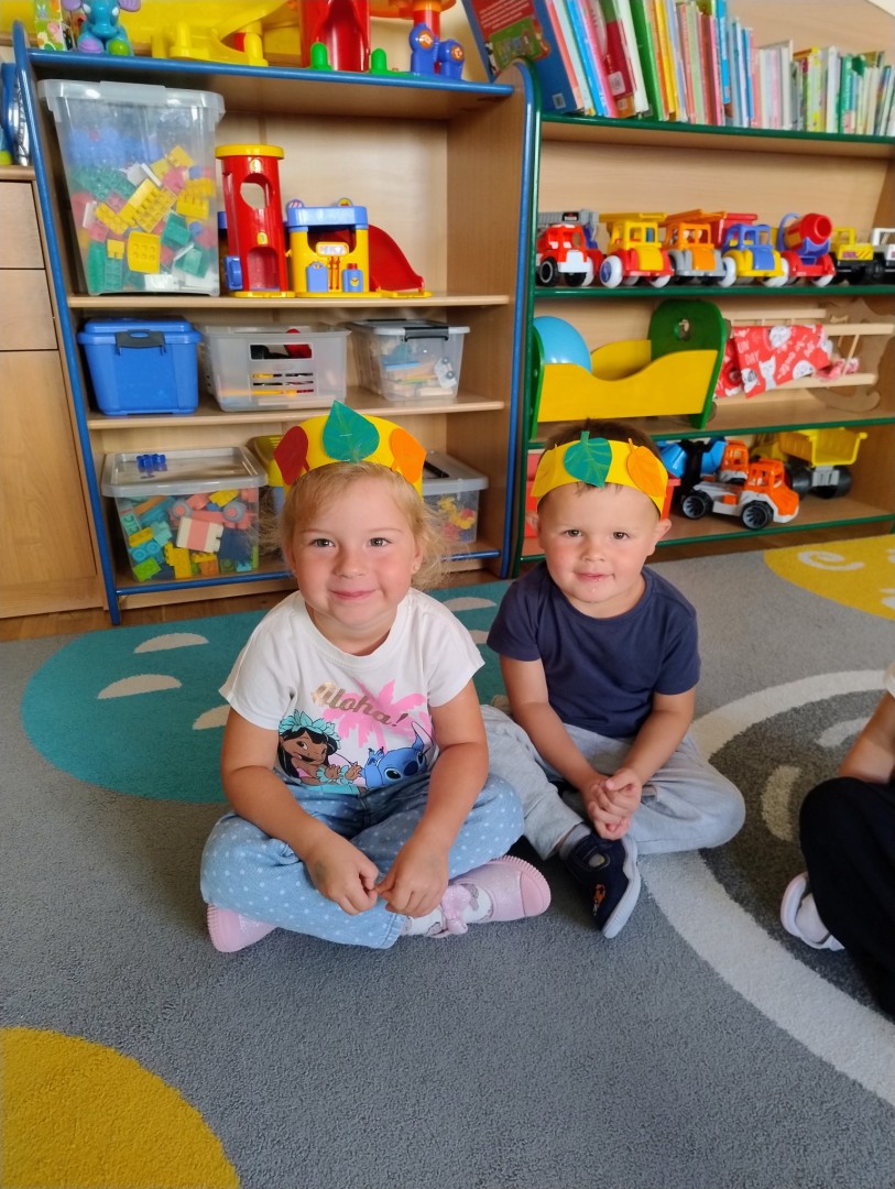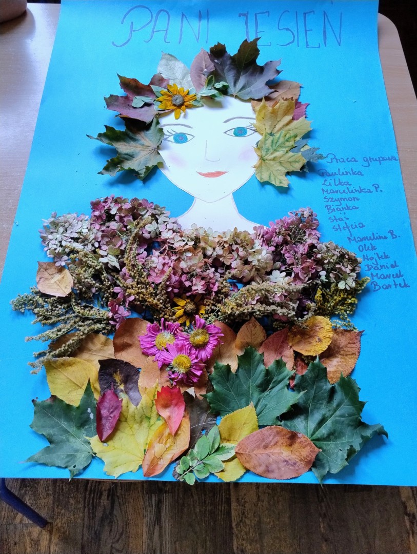 23,09,2025r. dzieci z grupy II “Kotki” uroczyście powitały “Pierwszy Dzień Jesieni”. Celem zajęć było poszerzanie wiedzy przyrodniczej na temat tej pory roku. Dzieci z zainteresowaniem wysłuchały opowiadania pt.: “Spacer po parku”, oglądały zgromadzone w sali dary jesieni. Chętnie uczestniczyły w zabawie ruchowej pt.: “Skarby jesieni” z wykorzystaniem opasek. Na zakończenie wspólnie z suchych liści i kwiatów wykonano pracę plastyczną “Portret Pani Jesieni”.