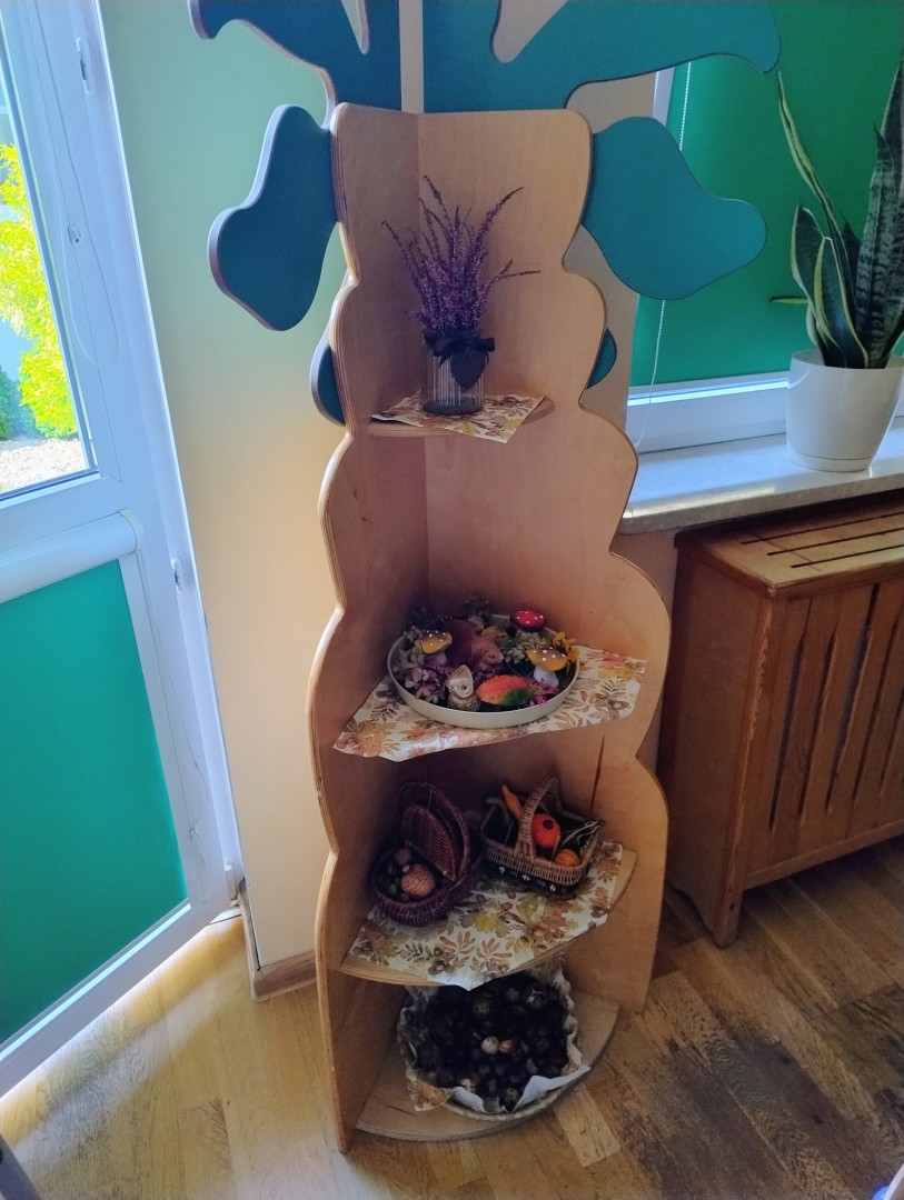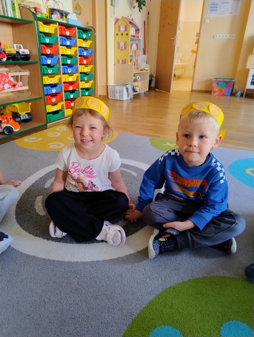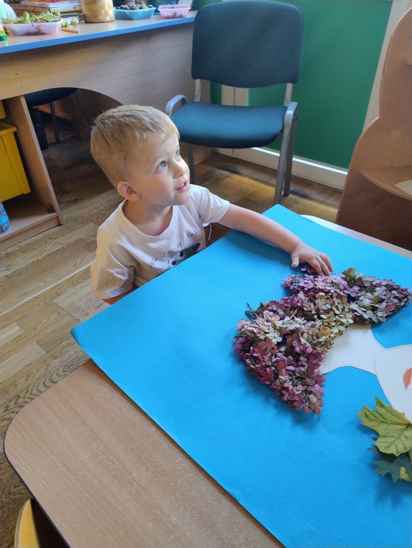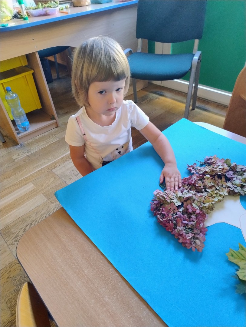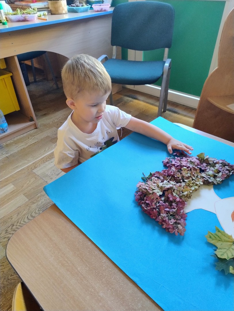 23,09,2025r. dzieci z grupy II “Kotki” uroczyście powitały “Pierwszy Dzień Jesieni”. Celem zajęć było poszerzanie wiedzy przyrodniczej na temat tej pory roku. Dzieci z zainteresowaniem wysłuchały opowiadania pt.: “Spacer po parku”, oglądały zgromadzone w sali dary jesieni. Chętnie uczestniczyły w zabawie ruchowej pt.: “Skarby jesieni” z wykorzystaniem opasek. Na zakończenie wspólnie z suchych liści i kwiatów wykonano pracę plastyczną “Portret Pani Jesieni”.