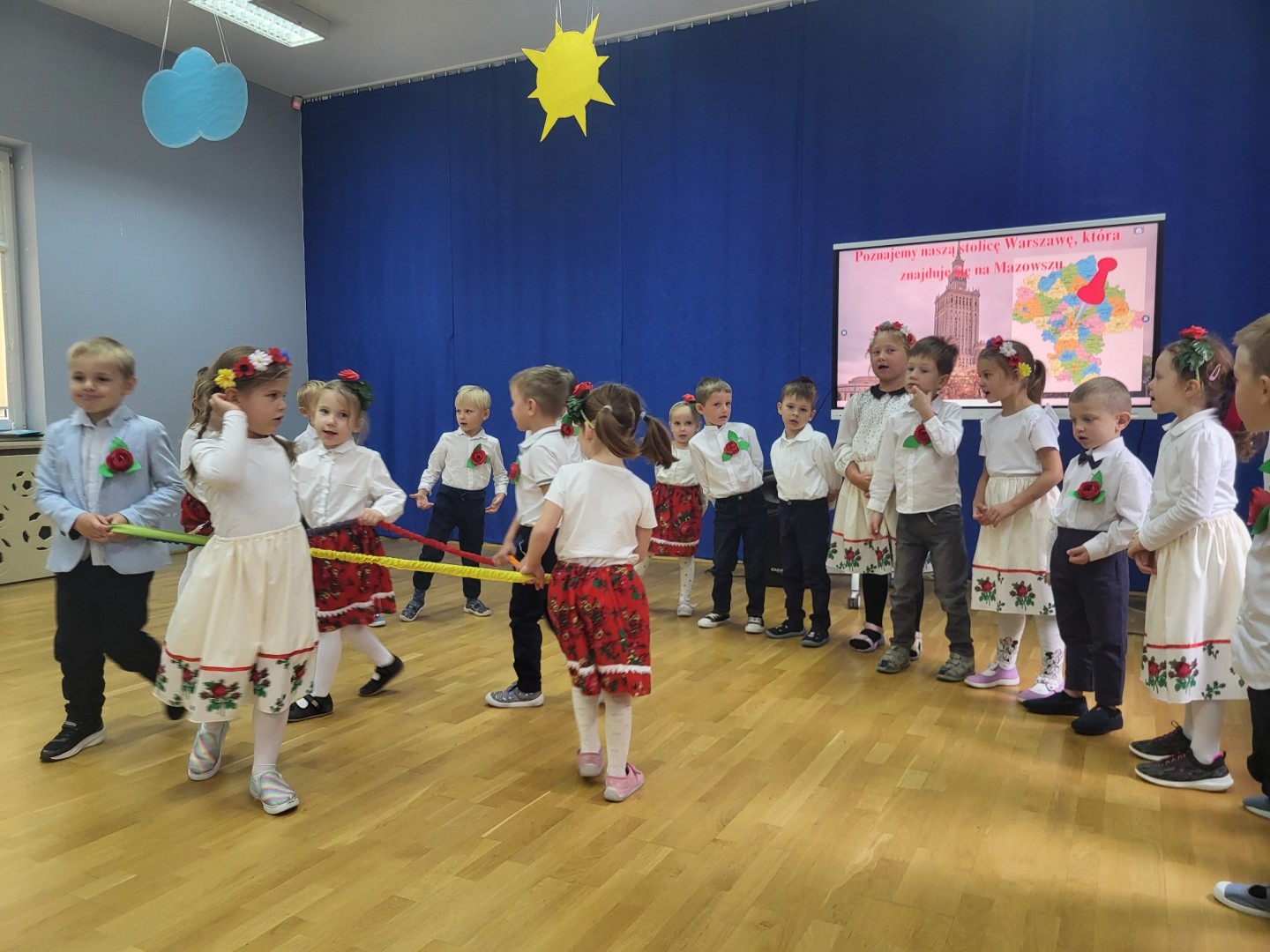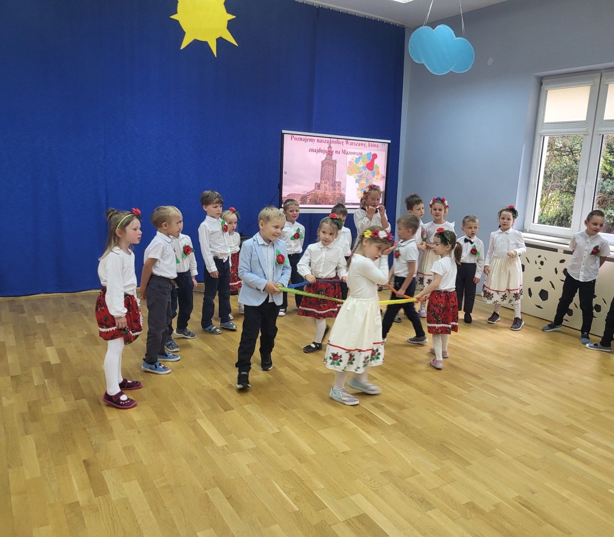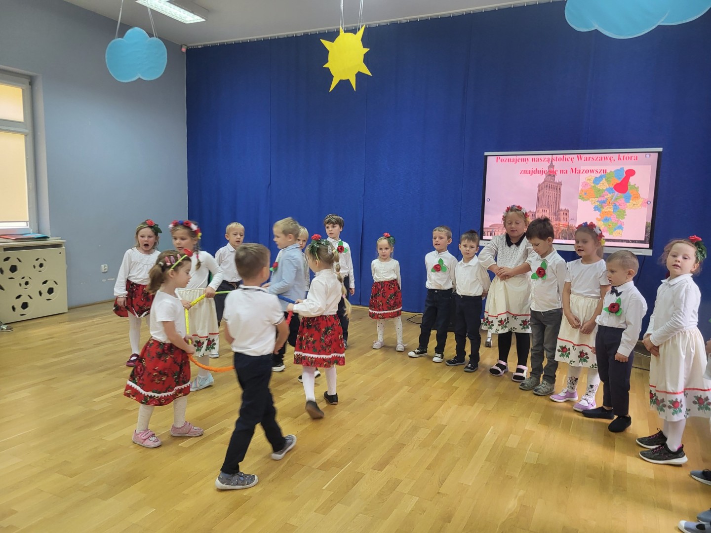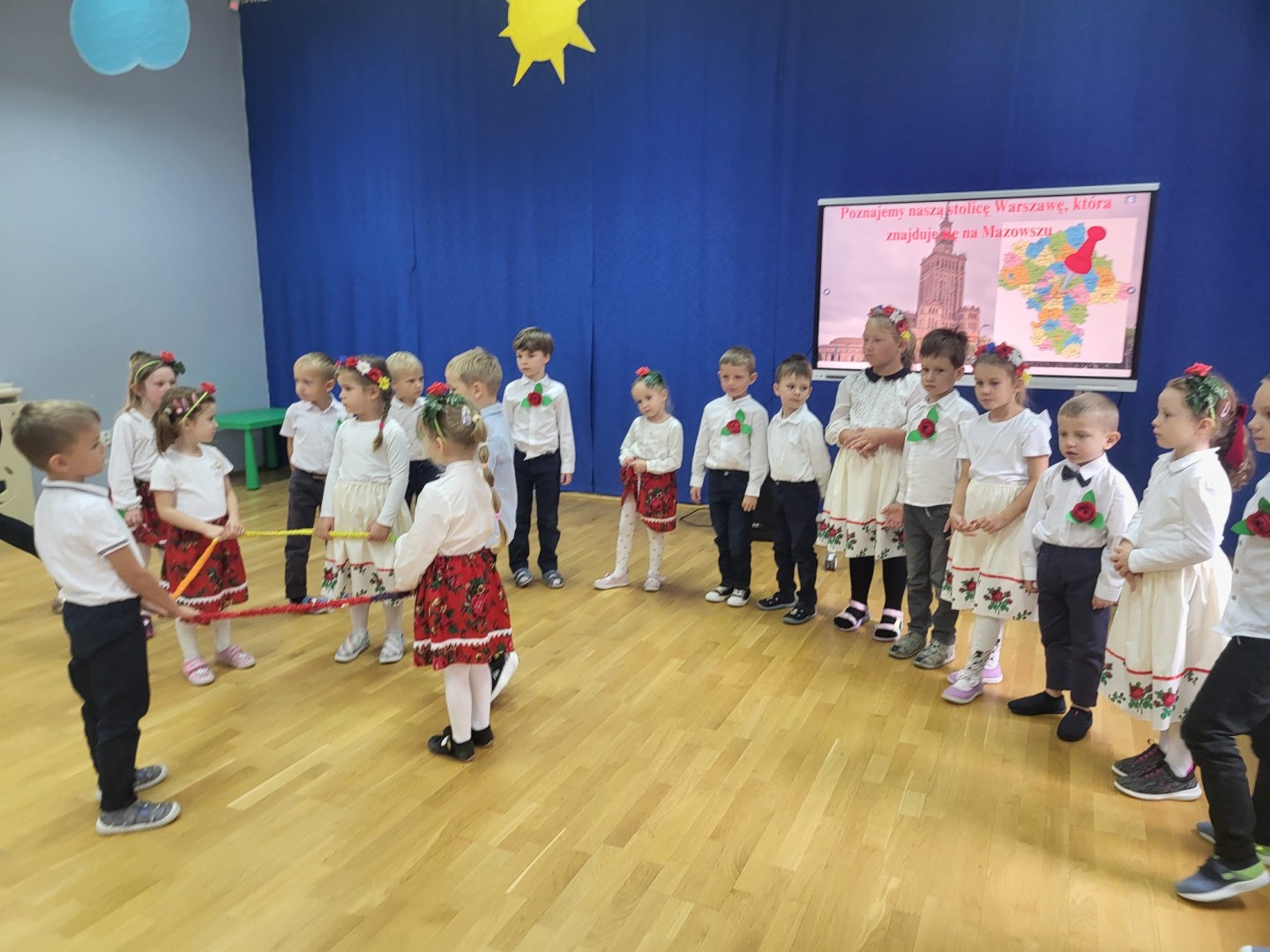 We wrześniu grupa Żabki wraz z wychowawcami przygotowała pokaz multimedialny „Poznajemy Naszą stolicę – Warszawę oraz inne miejsca na Mazowszu. Przedszkolaki zostały zapoznane z położeniem Mazowsza, charakterystycznymi miejscami, tańcami ludowymi oraz potrawami kuchni mazowieckiej. Na podstawie prezentacji multimedialnej poznały ciekawostki dotyczące naszej stolicy, wybrały się w wirtualny spacer po Warszawie poznając ważne miejsca takie jak : Pałac Kultury i Nauki, Zamek Królewski, Łazienki Królewskie, Pałac Prezydencki, Stadion Narodowy itp. Następnie dzieci zostały zapoznane z legendami warszawskimi i obejrzały dwie z nich : „Wars i Sawa” oraz „Bazyliszek”. Grupa „Żabki” przepięknie zatańczyła oberka oraz zaśpiewała piosenkę Marii Koterbskiej pt ”Karuzela”. Na zakończenie dzieci miały za zadanie ułożyć Pałac Kultury i Nauki z klocków piankowych ( 3-latki) puzzle z zabytkami Warszawy (4-latki) oraz historyjkę obrazkową „Bazyliszek” (5-latki).