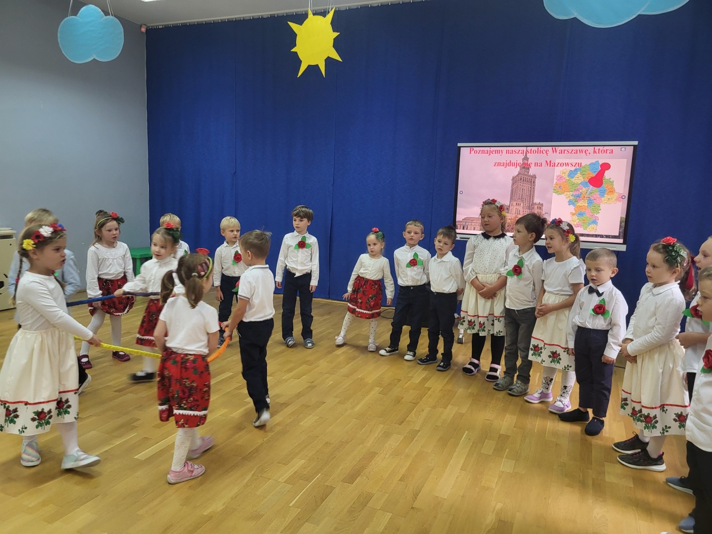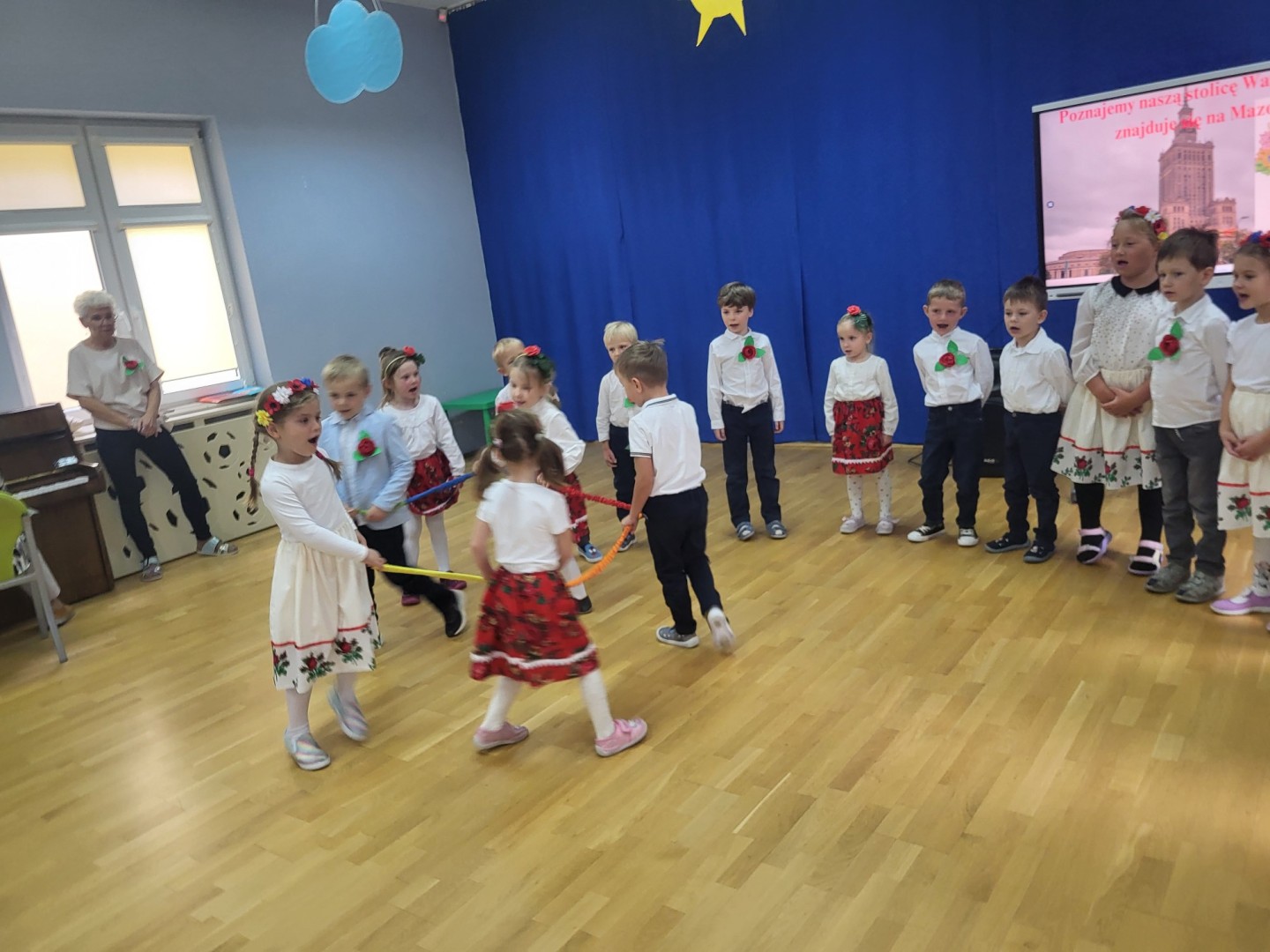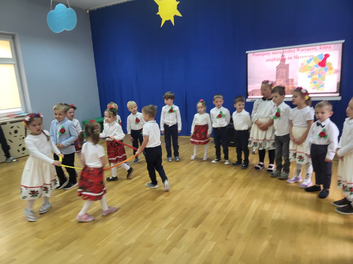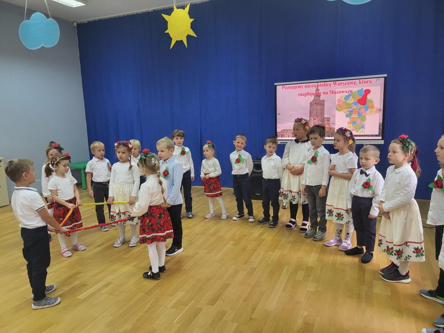 We wrześniu grupa Żabki wraz z wychowawcami przygotowała pokaz multimedialny „Poznajemy Naszą stolicę – Warszawę oraz inne miejsca na Mazowszu. Przedszkolaki zostały zapoznane z położeniem Mazowsza, charakterystycznymi miejscami, tańcami ludowymi oraz potrawami kuchni mazowieckiej. Na podstawie prezentacji multimedialnej poznały ciekawostki dotyczące naszej stolicy, wybrały się w wirtualny spacer po Warszawie poznając ważne miejsca takie jak : Pałac Kultury i Nauki, Zamek Królewski, Łazienki Królewskie, Pałac Prezydencki, Stadion Narodowy itp. Następnie dzieci zostały zapoznane z legendami warszawskimi i obejrzały dwie z nich : „Wars i Sawa” oraz „Bazyliszek”. Grupa „Żabki” przepięknie zatańczyła oberka oraz zaśpiewała piosenkę Marii Koterbskiej pt ”Karuzela”. Na zakończenie dzieci miały za zadanie ułożyć Pałac Kultury i Nauki z klocków piankowych ( 3-latki) puzzle z zabytkami Warszawy (4-latki) oraz historyjkę obrazkową „Bazyliszek” (5-latki).