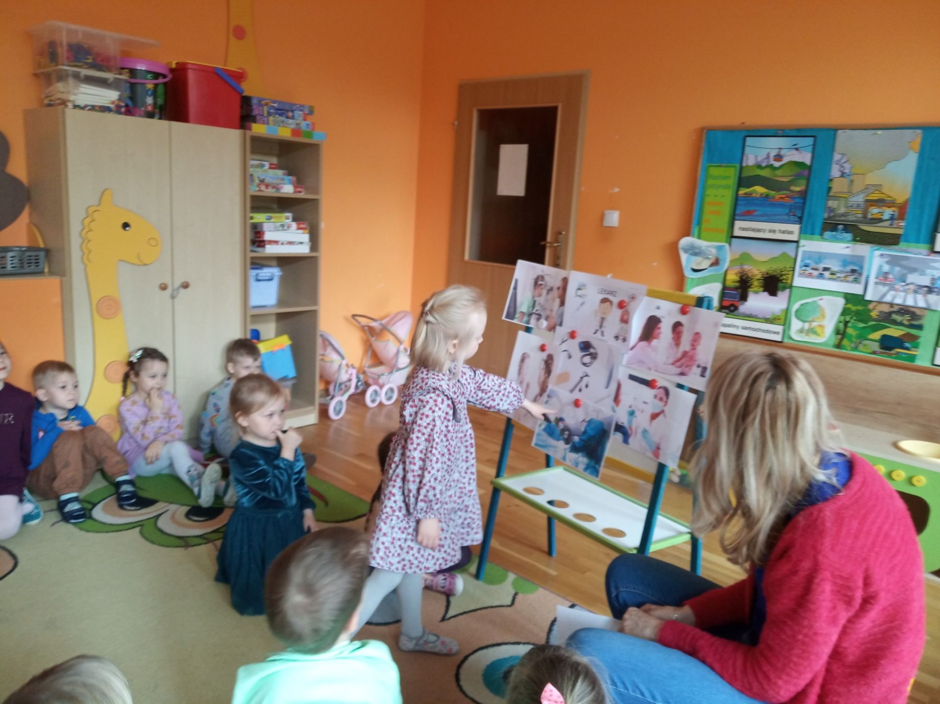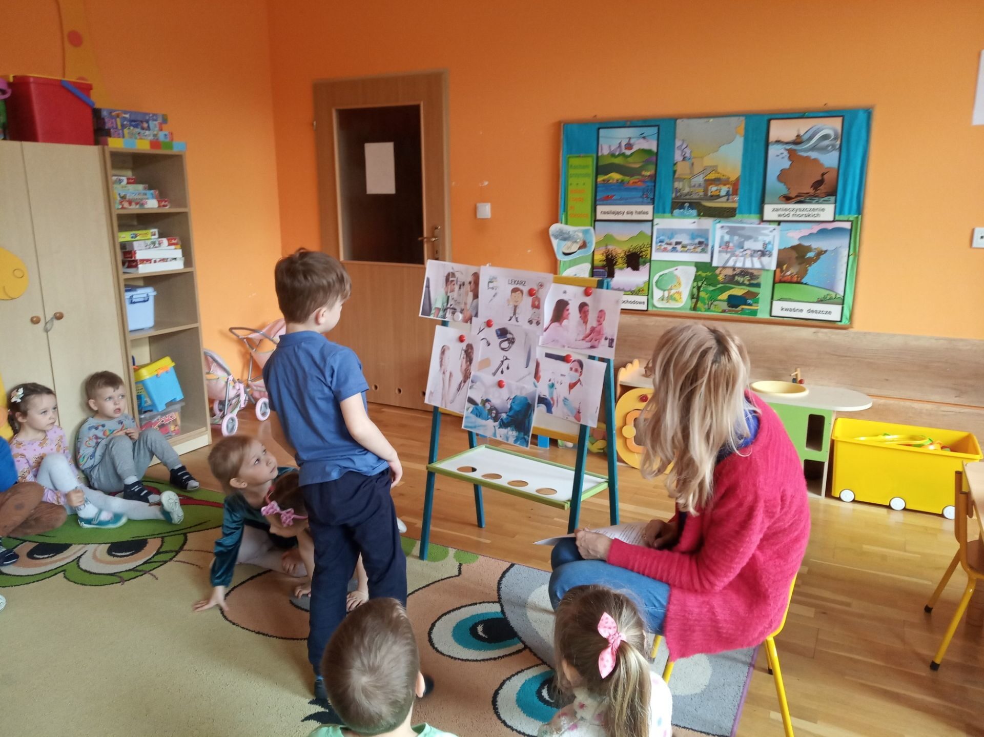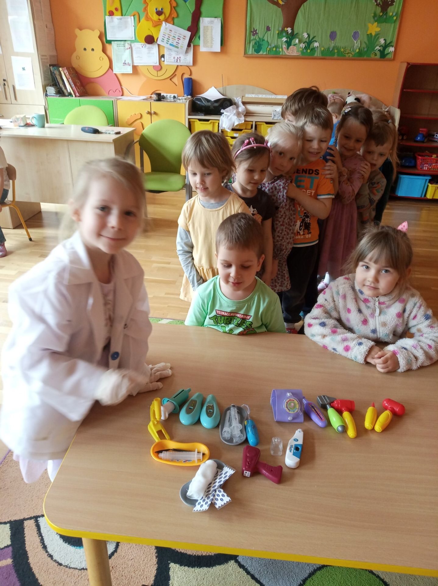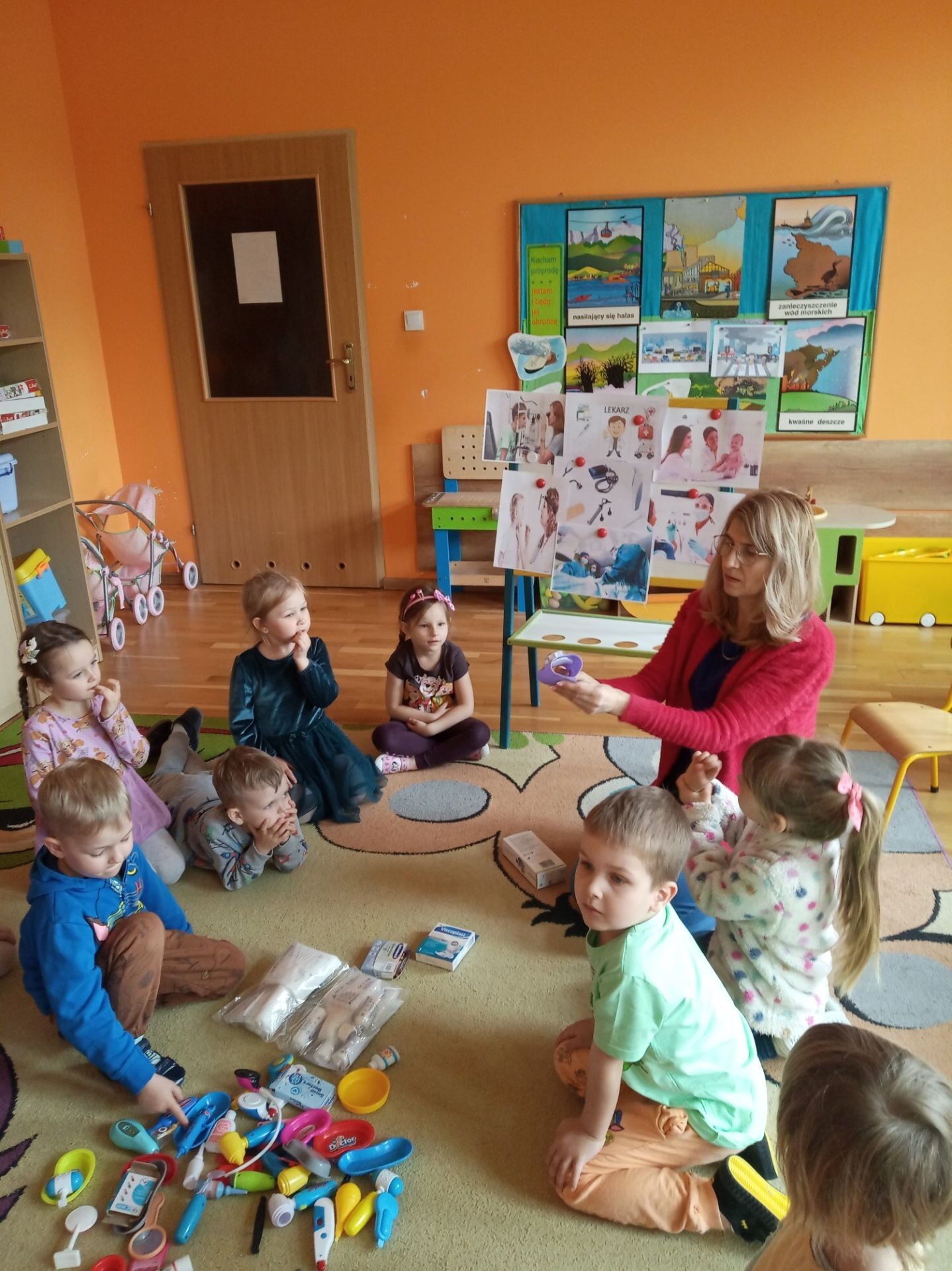 Wychowawczyni zapoznała dzieci i pokazała ilustracje lekarzy specjalistów: laryngolog, okulista, kardiolog, stomatolog, pediatra, internista, chirurg. Krótko też omówiła leczeniem czego zajmują się ci specjaliści. Pokazała też rzeczy, które potrzebne są lekarzowi w pracy np. stetoskop, termometr, plastry, aparat do mierzenia ciśnienia, strzykawka, fartuch lekarski.