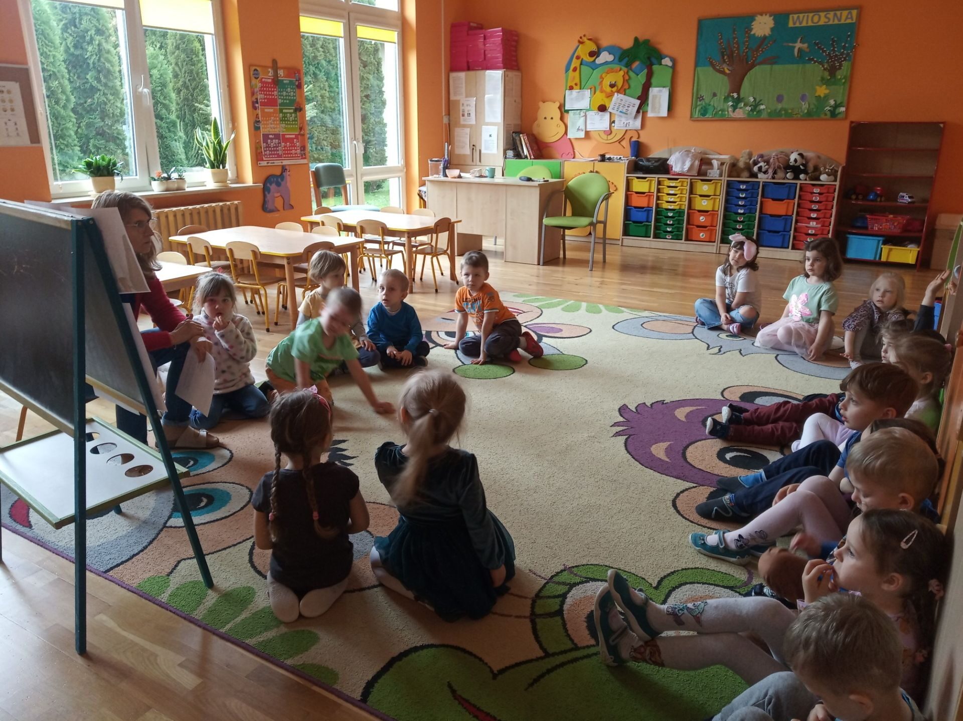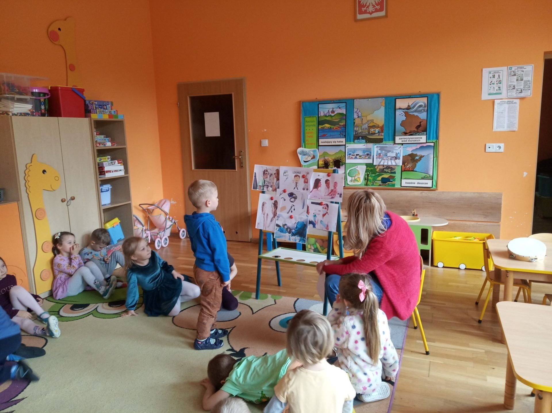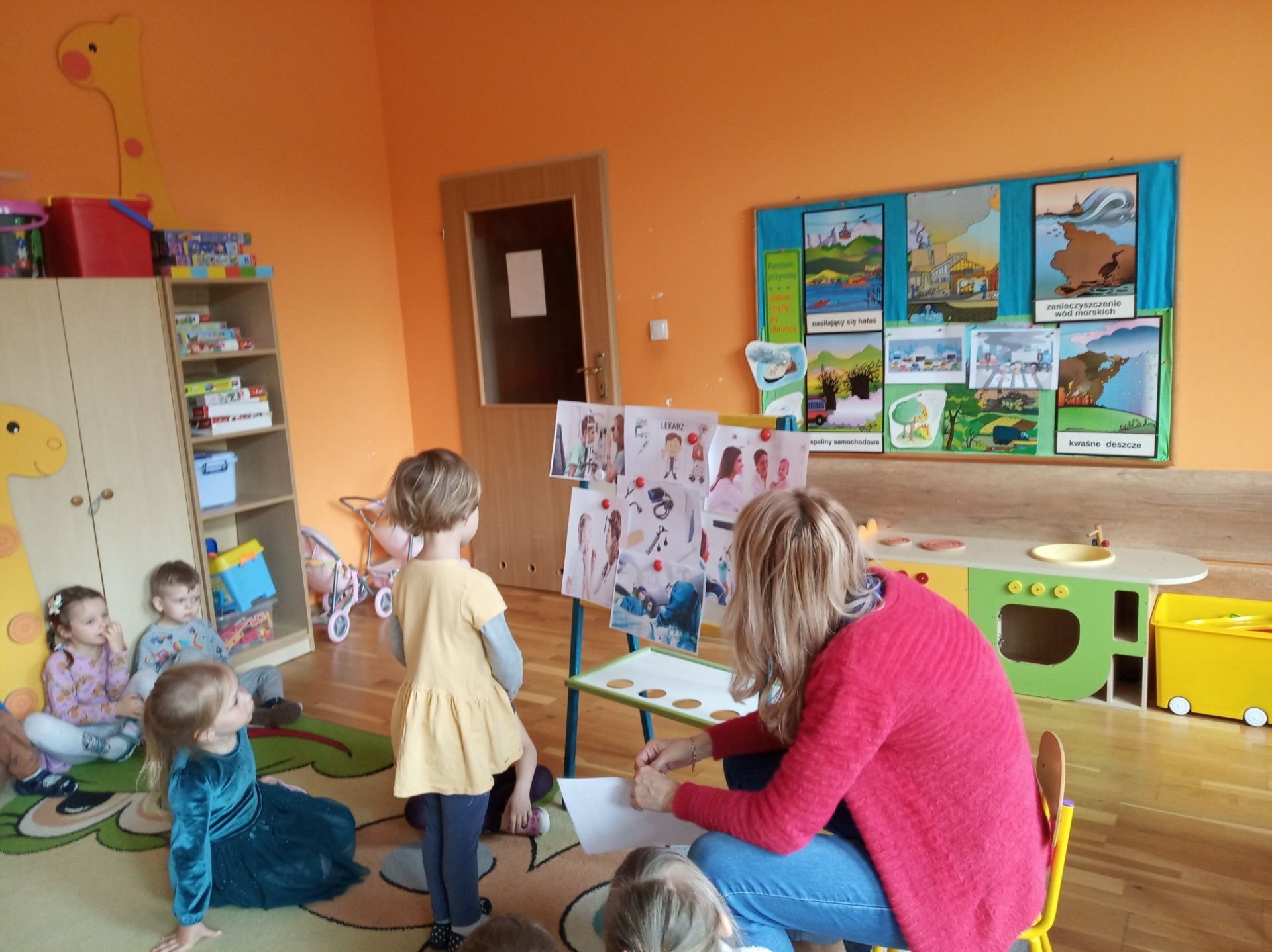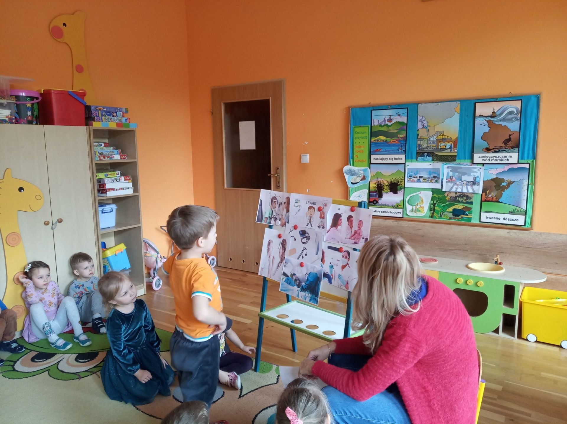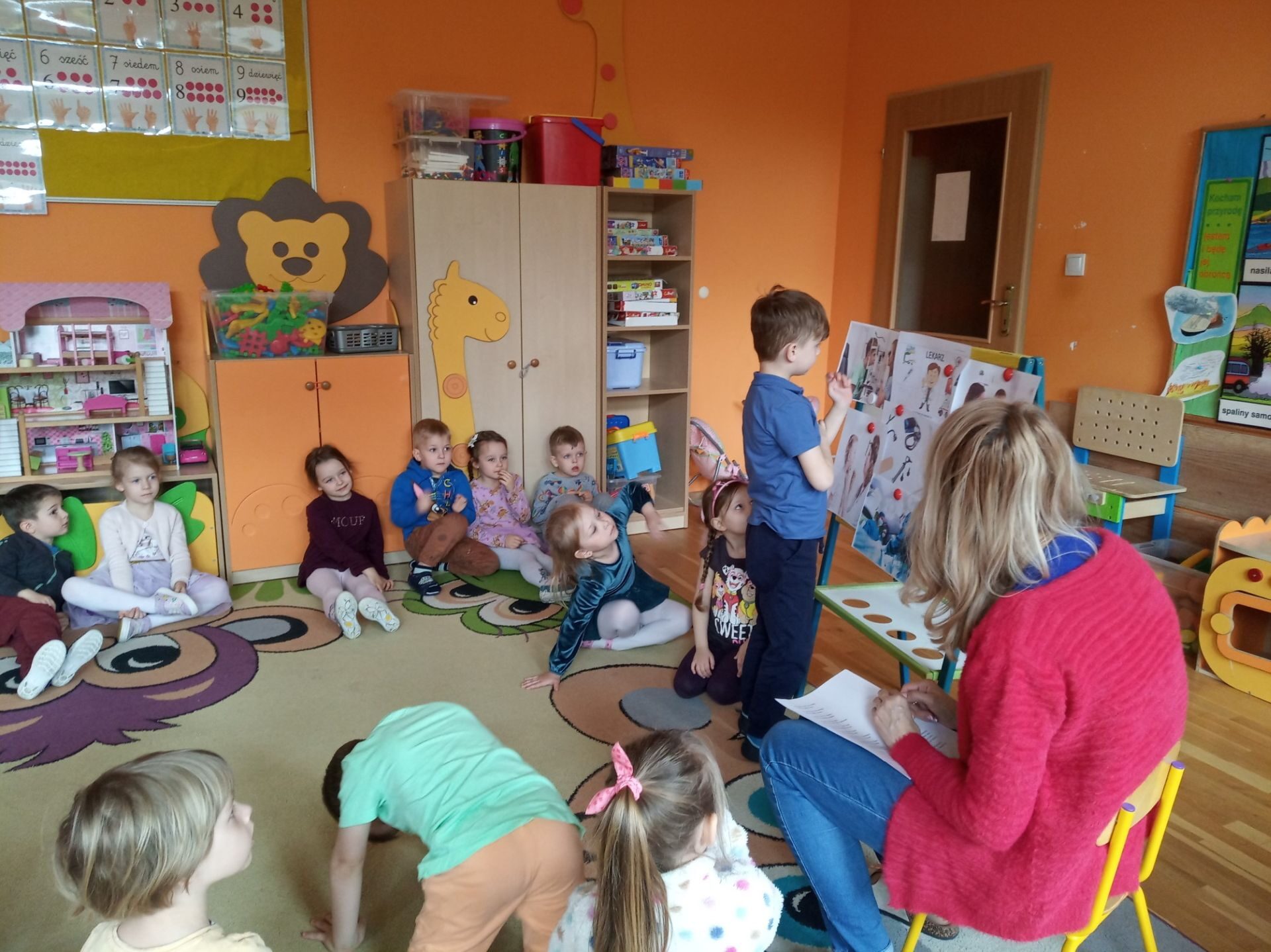 Wychowawczyni zapoznała dzieci i pokazała ilustracje lekarzy specjalistów: laryngolog, okulista, kardiolog, stomatolog, pediatra, internista, chirurg. Krótko też omówiła leczeniem czego zajmują się ci specjaliści. Pokazała też rzeczy, które potrzebne są lekarzowi w pracy np. stetoskop, termometr, plastry, aparat do mierzenia ciśnienia, strzykawka, fartuch lekarski.