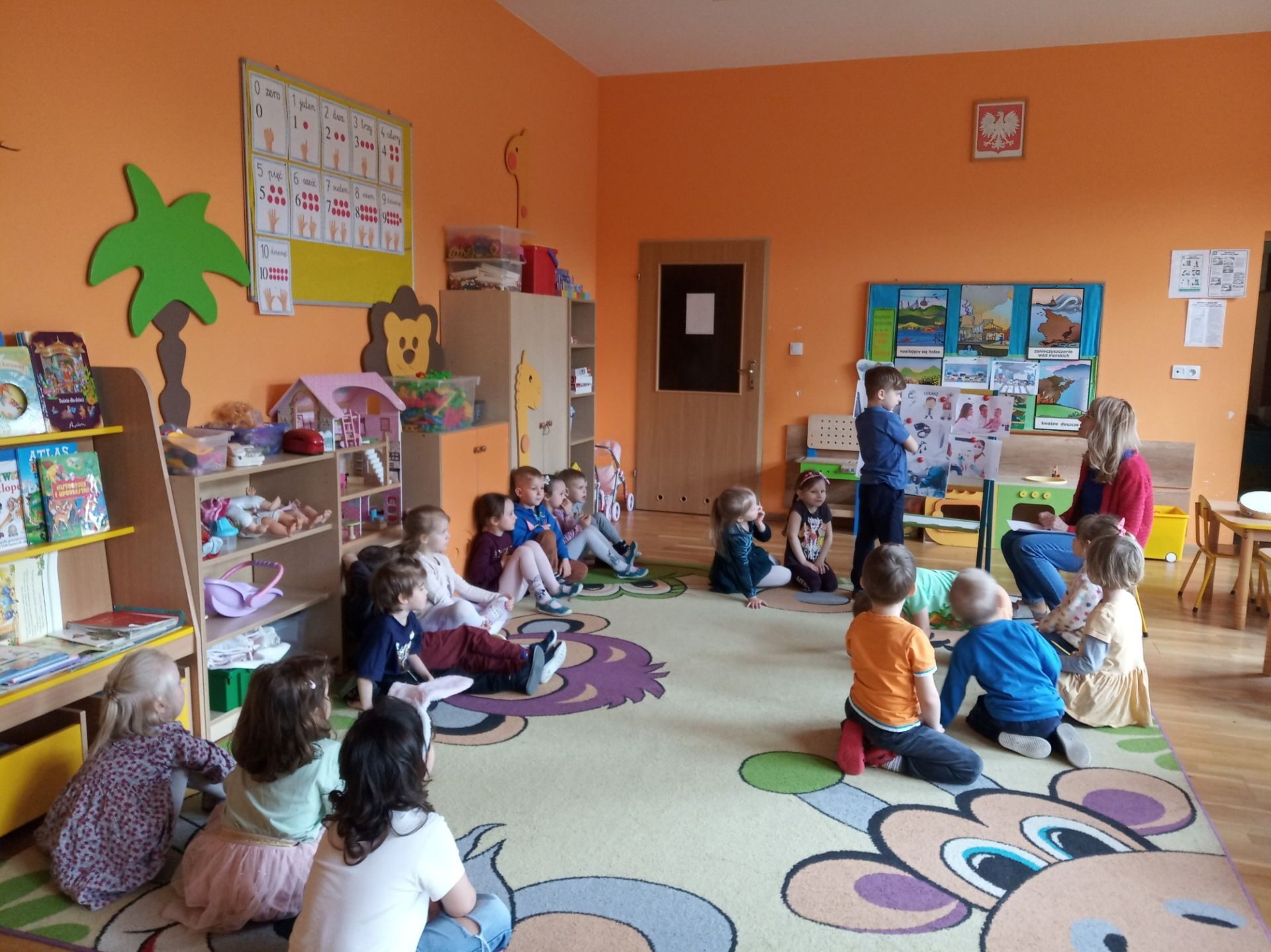 W dniach: 22.04-26.04.2024 we wszystkich grupach wiekowych odbył się Dzień Lekarza, podczas, którego dzieci zapoznały się z zawodem lekarza i kilkoma specjalnościami lekarskimi. Zajęcia rozpoczęły się zagadką dotyczącą tego zawodu oraz zabawą ruchową pt. „Zdrowy- chory”. Kolejnym punktem zajęć było odczytanie przez nauczyciela wiersza M. Terlikowskiej pt. „U pana doktora”. Następnie dzieci odpowiadały na pytania dotyczące tekstu : „Jakie dolegliwości miały dzieci?”, „Do kogo zwróciły się o pomoc?”, „Kto pomaga w pracy lekarzowi?”, „ Jak trzeba się zachować w gabinecie lekarskim?”, „Czy któreś z dzieci było ostatnio u lekarza?”.