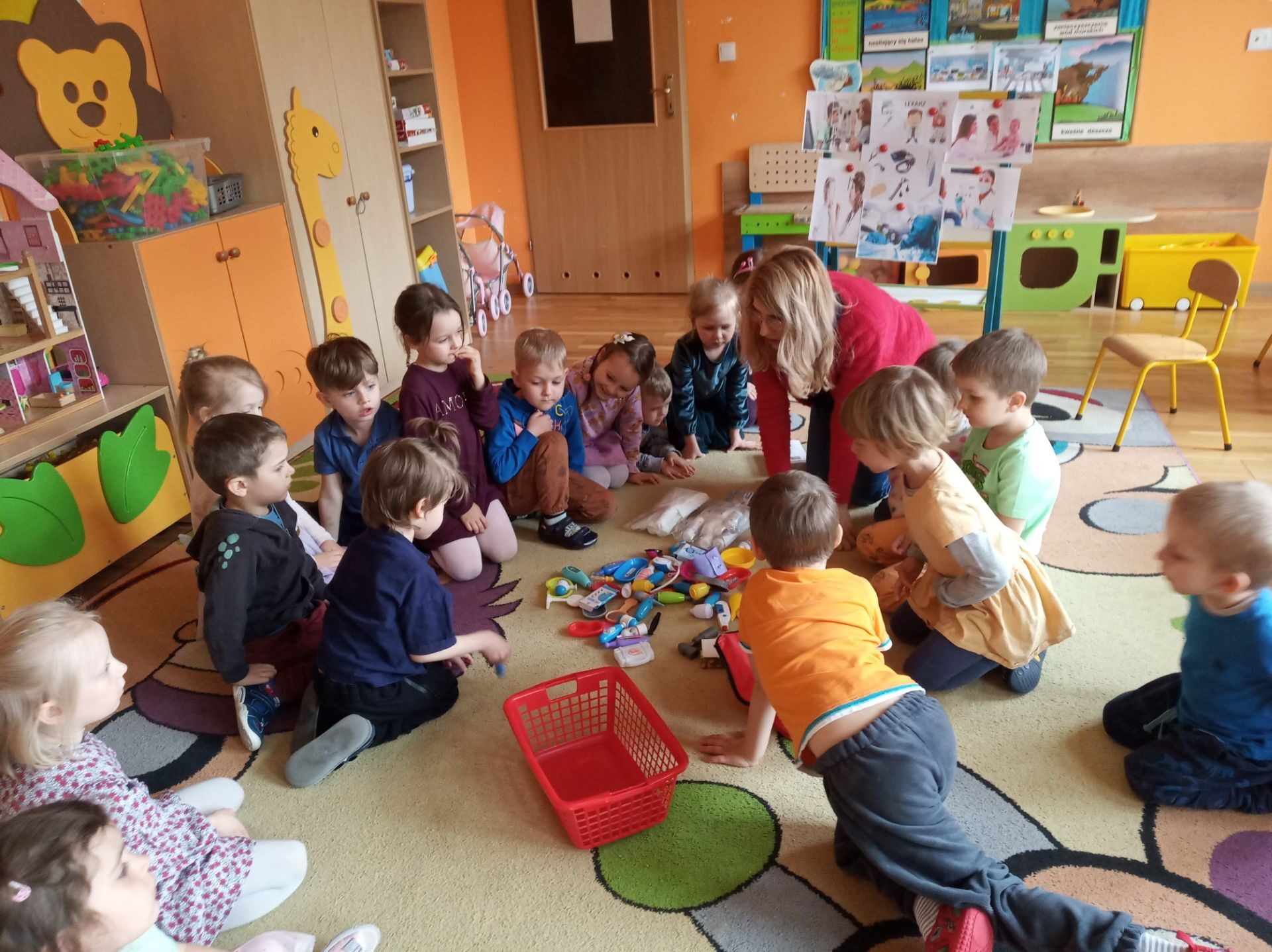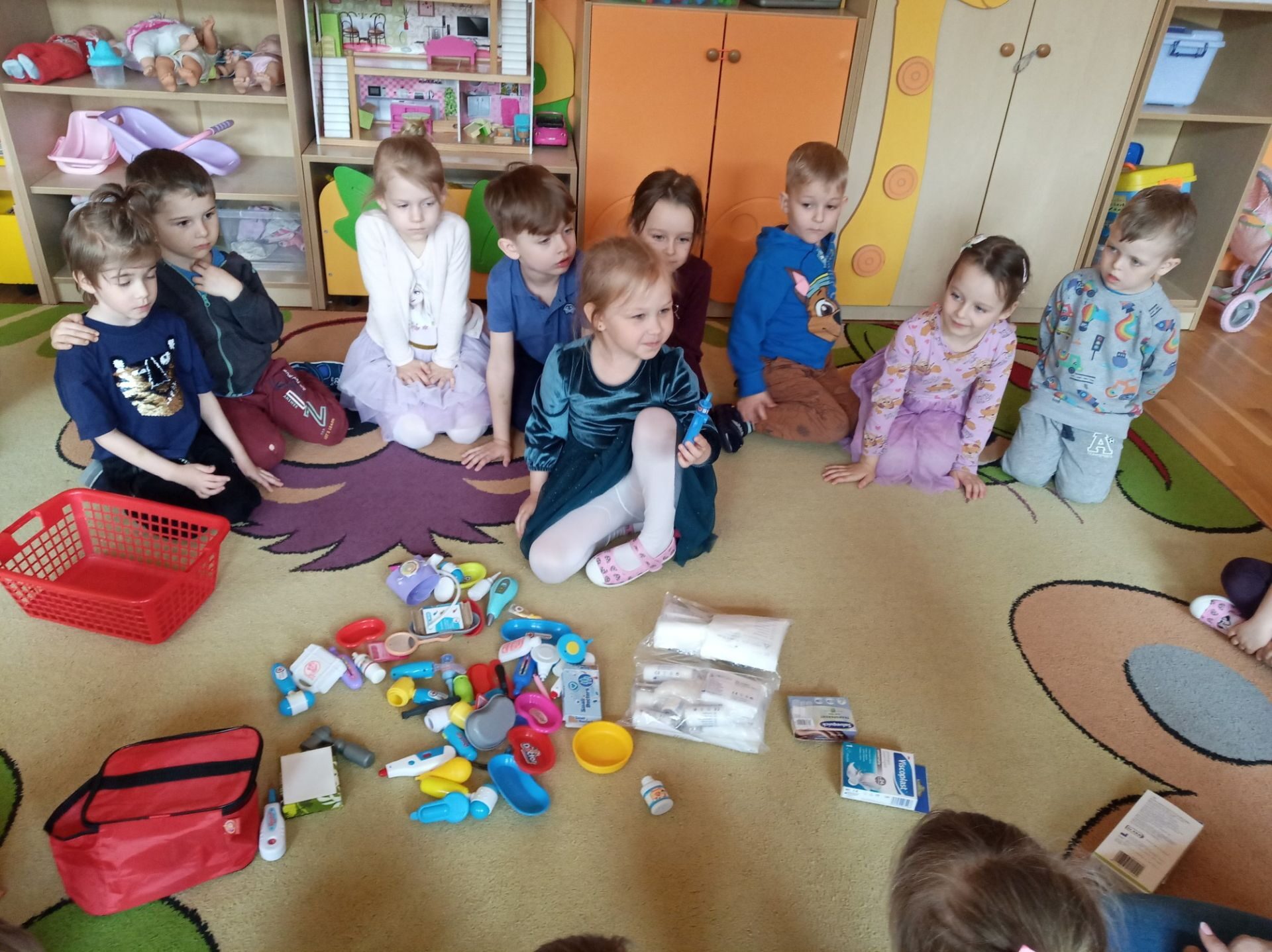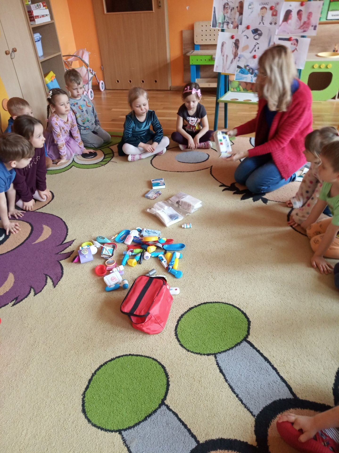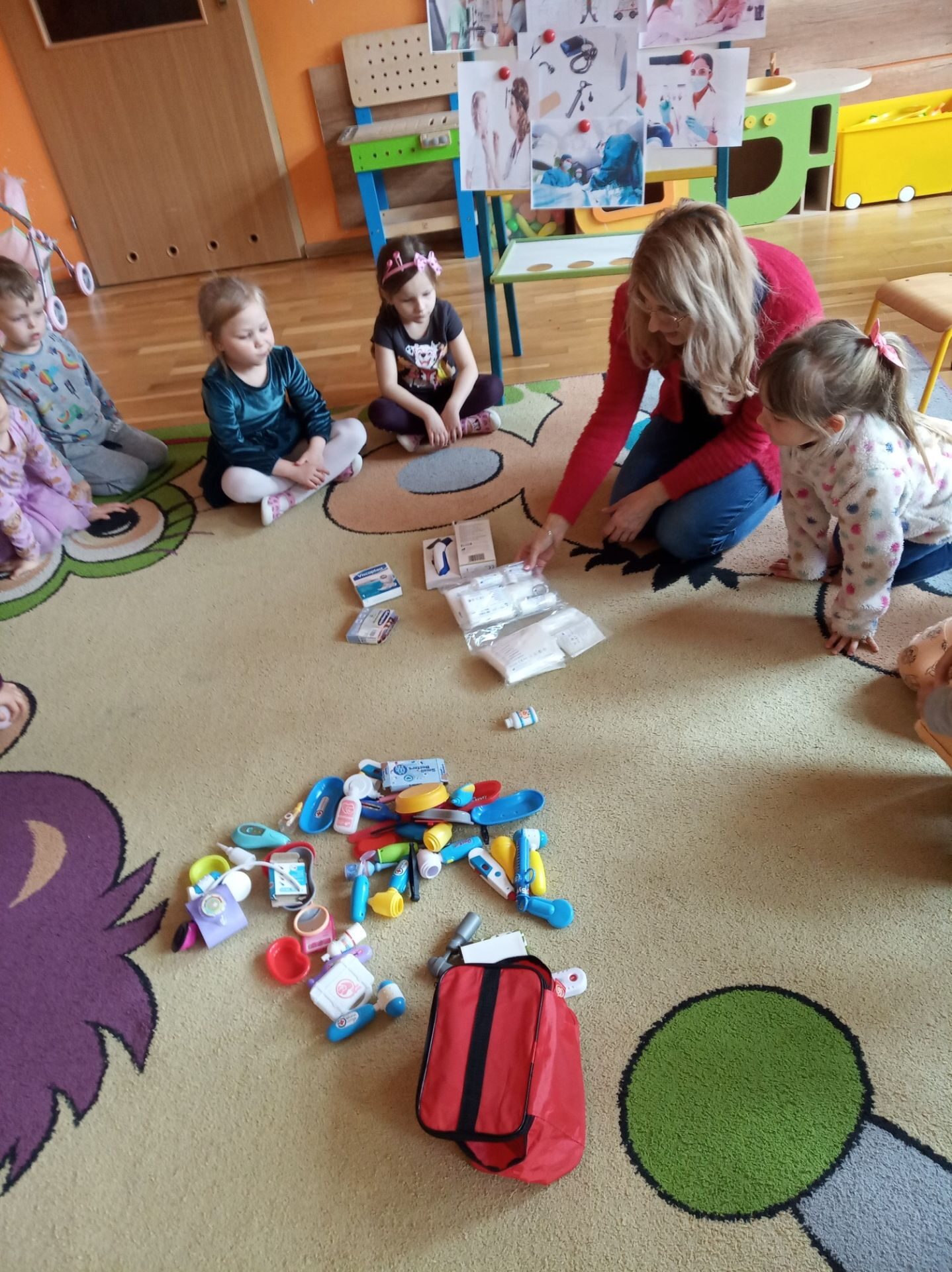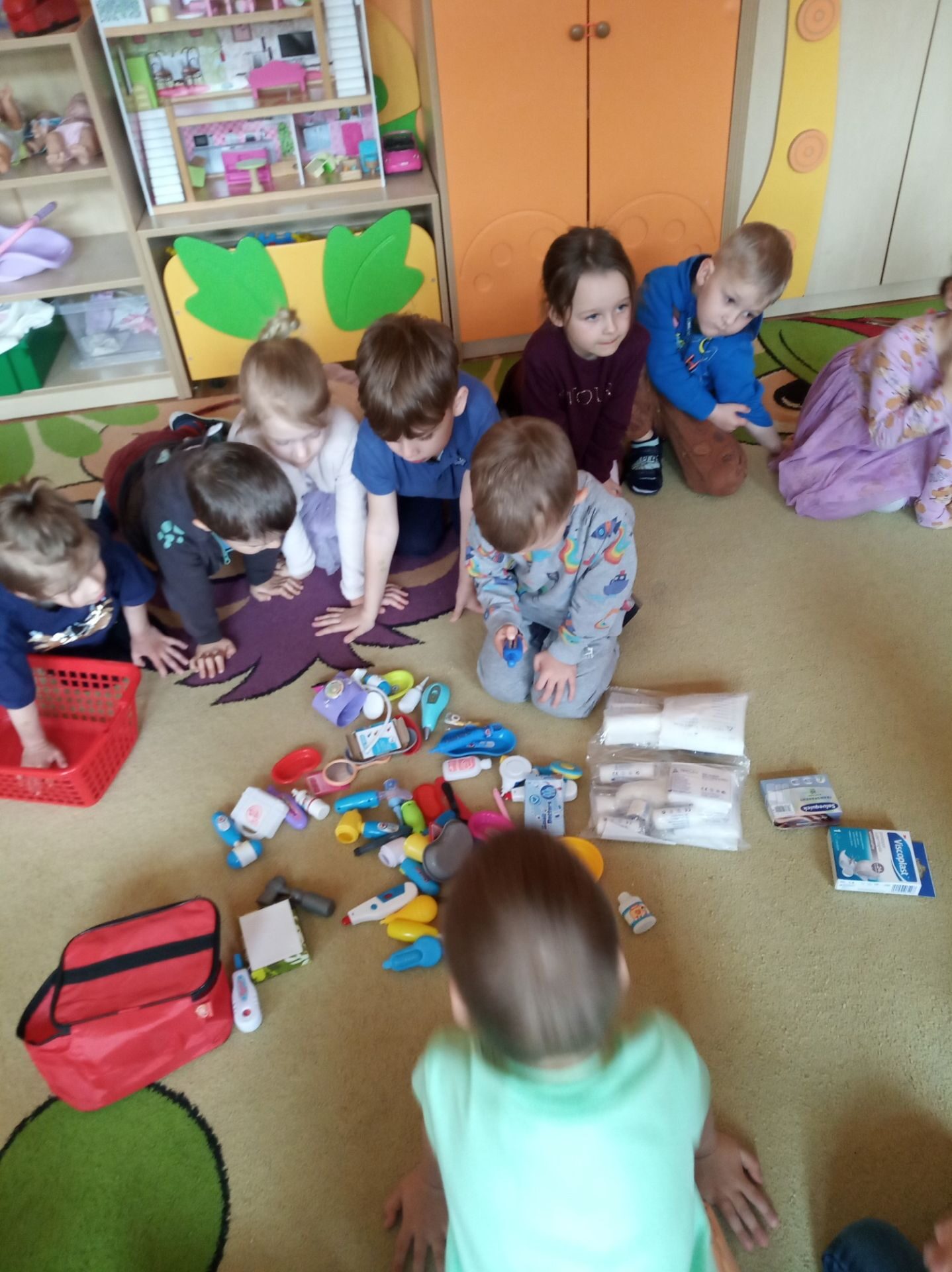 Kolejnym zadanie było znalezienie przedmiotów należących do lekarza. Na środku sali zostały rozłożone różne przedmioty i narzędzia. Zadaniem przedszkolaków było wybranie i nazwanie tych, które kojarzą się z lekarzem i chorobą. Na podłodze rozłożono: chusteczkę do nosa, bandaż, termometr, plastry, narzędzia z zestawu „Mały lekarz” oraz inne niezwiązane z pracą lekarza. Utrwaliły również numer pogotowia ratunkowego oraz numer alarmowy.