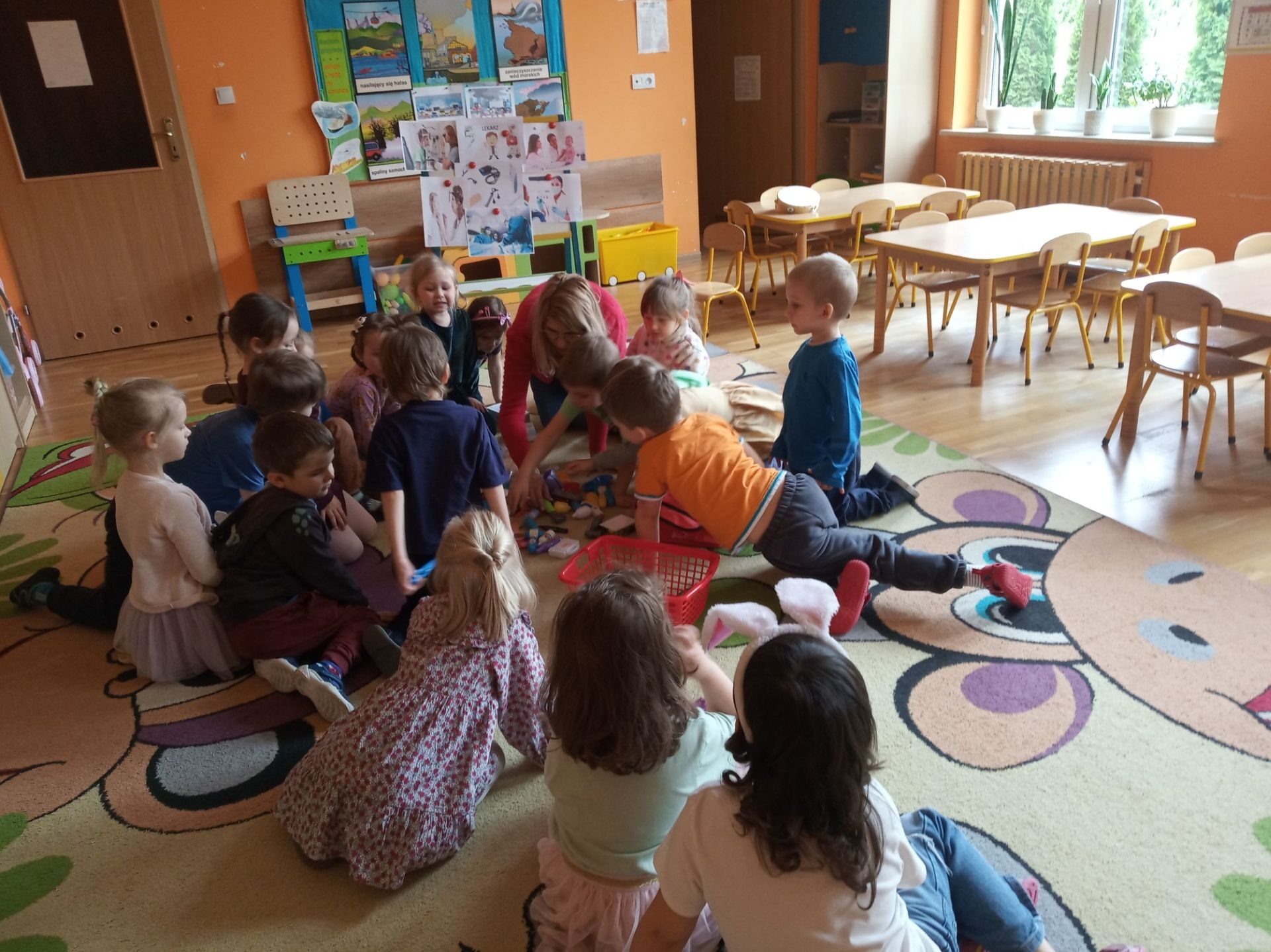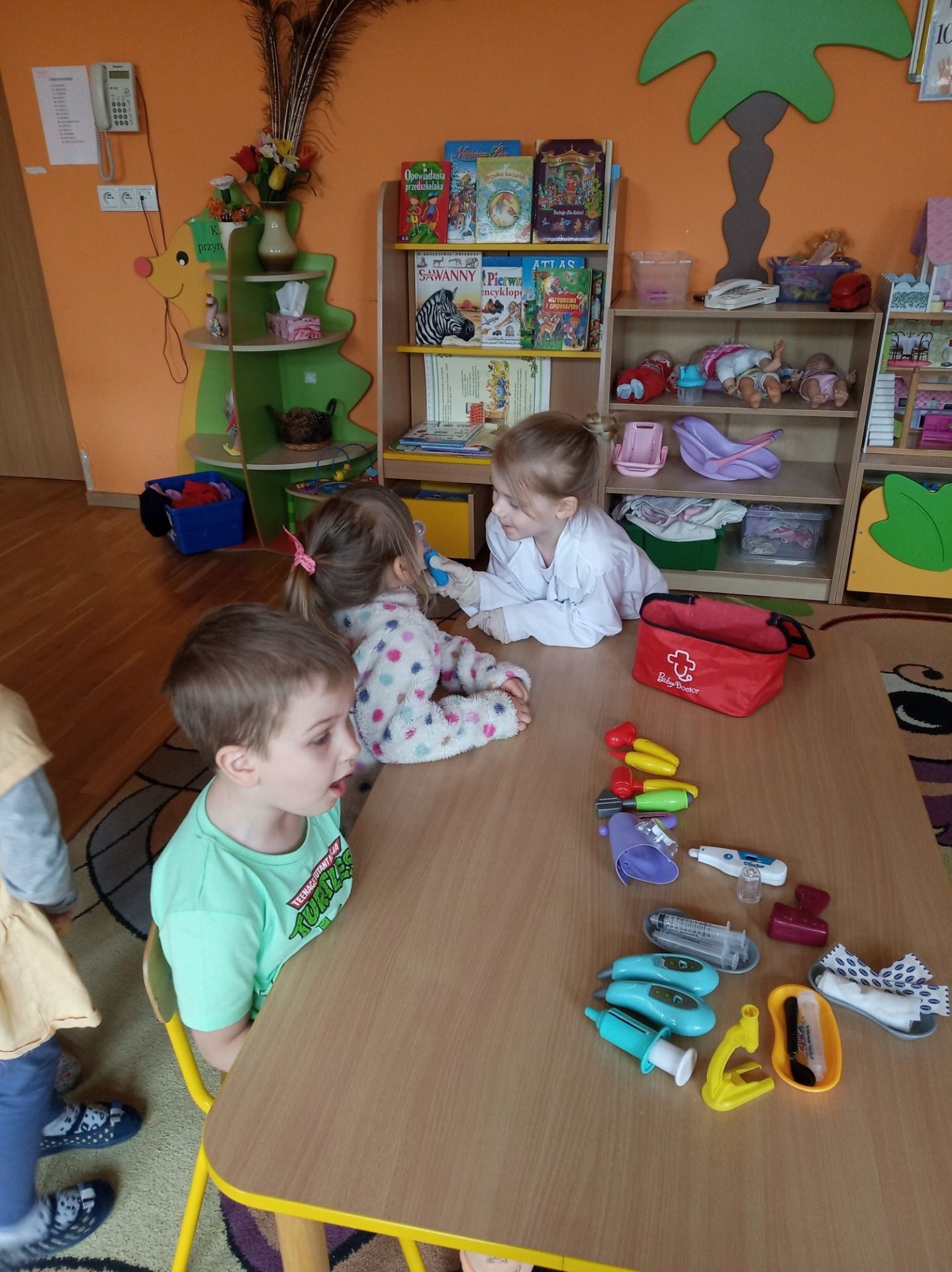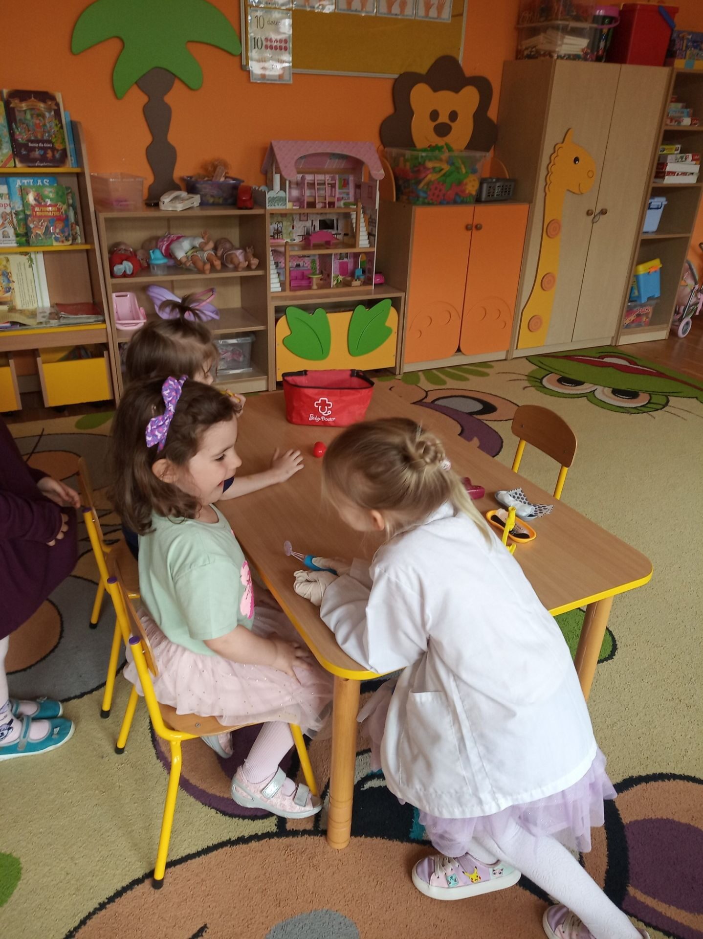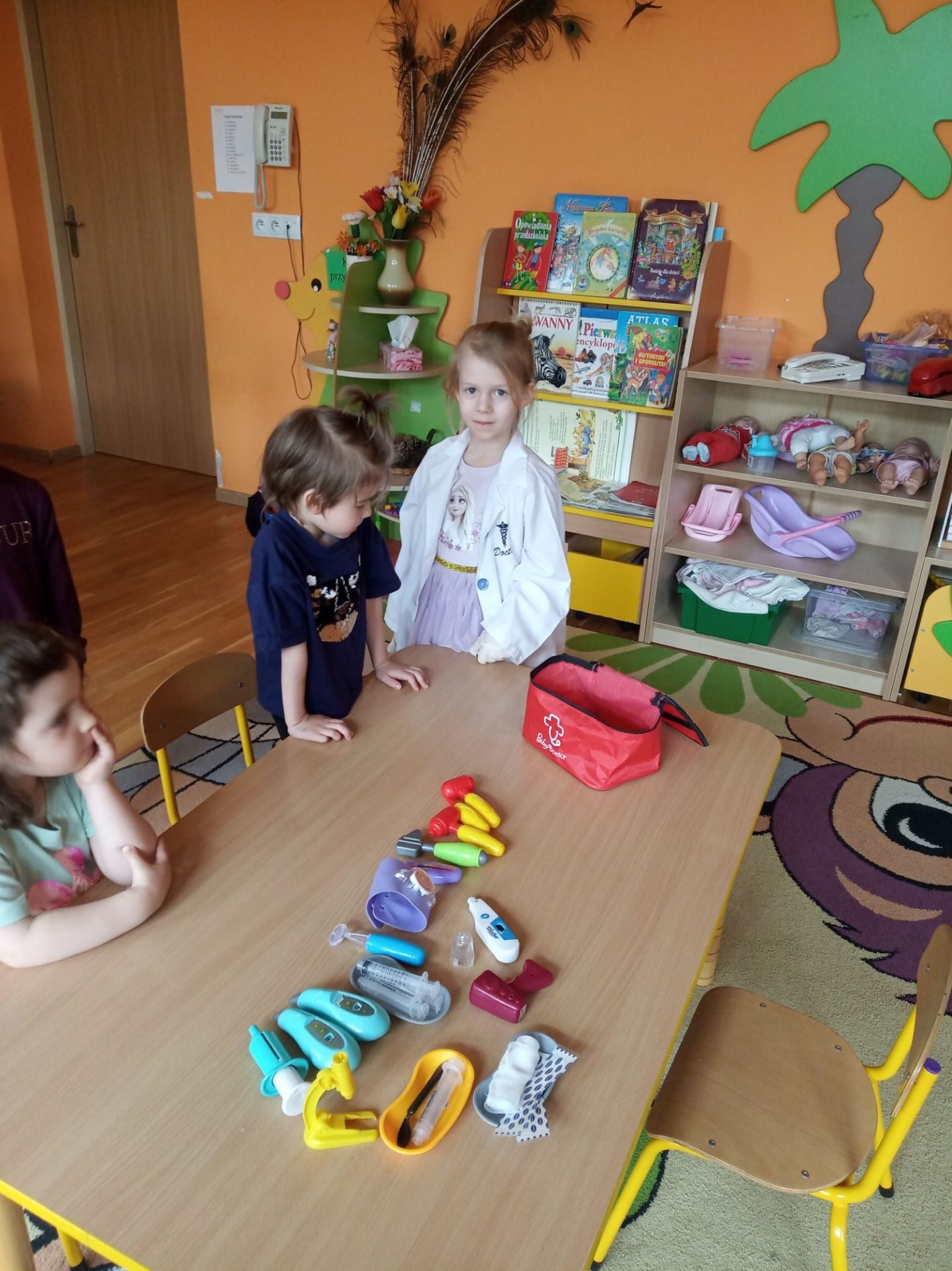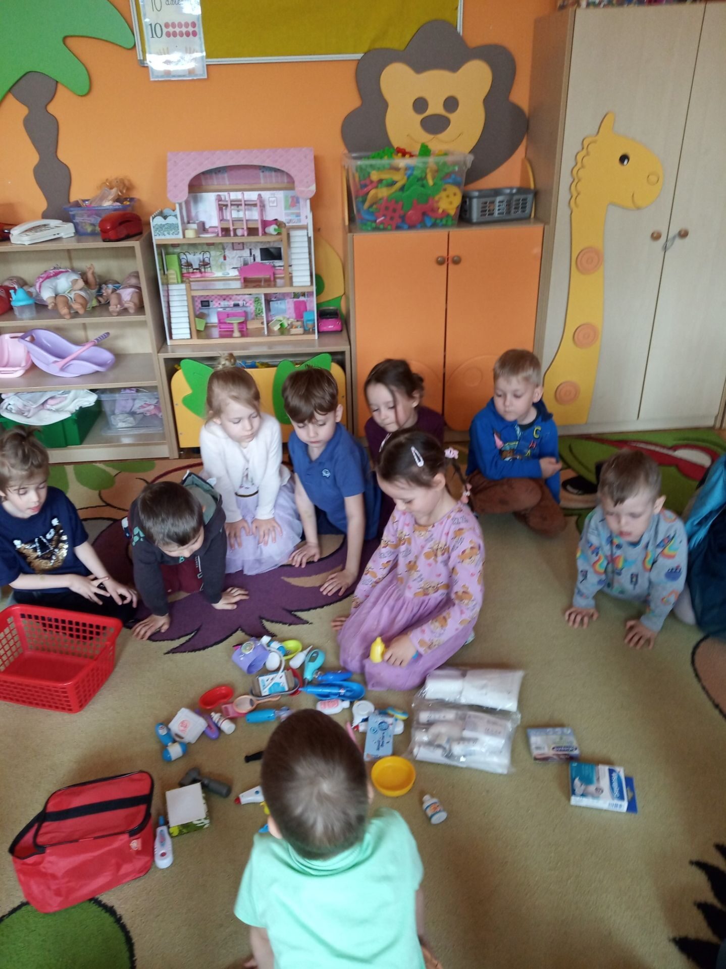 Kolejnym zadanie było znalezienie przedmiotów należących do lekarza. Na środku sali zostały rozłożone różne przedmioty i narzędzia. Zadaniem przedszkolaków było wybranie i nazwanie tych, które kojarzą się z lekarzem i chorobą. Na podłodze rozłożono: chusteczkę do nosa, bandaż, termometr, plastry, narzędzia z zestawu „Mały lekarz” oraz inne niezwiązane z pracą lekarza. Utrwaliły również numer pogotowia ratunkowego oraz numer alarmowy.