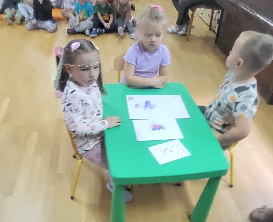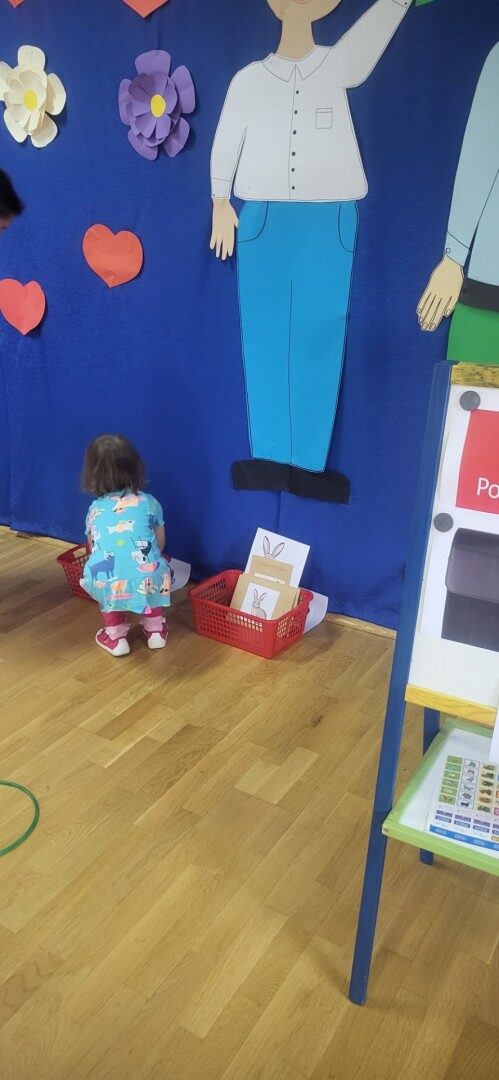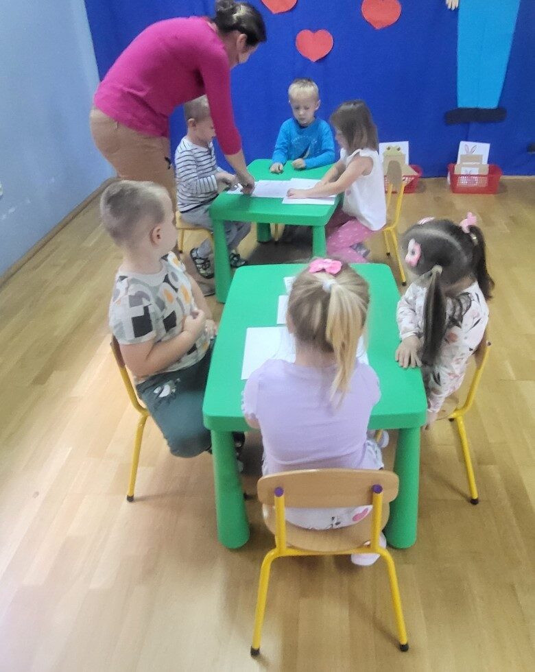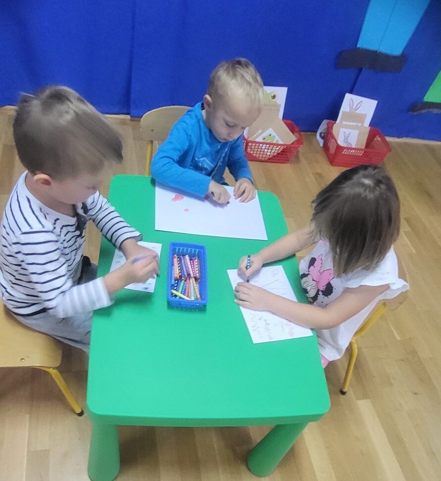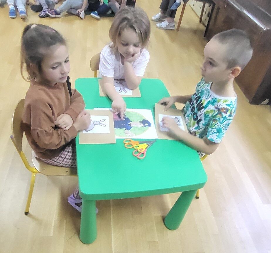 Grupa 3 – latków musiała pokonać “tor listonosza z kopertą w dłoni i włożyć ją do  odpowiedniego pojemnika przedstawiającego żabkę lub zajączka.