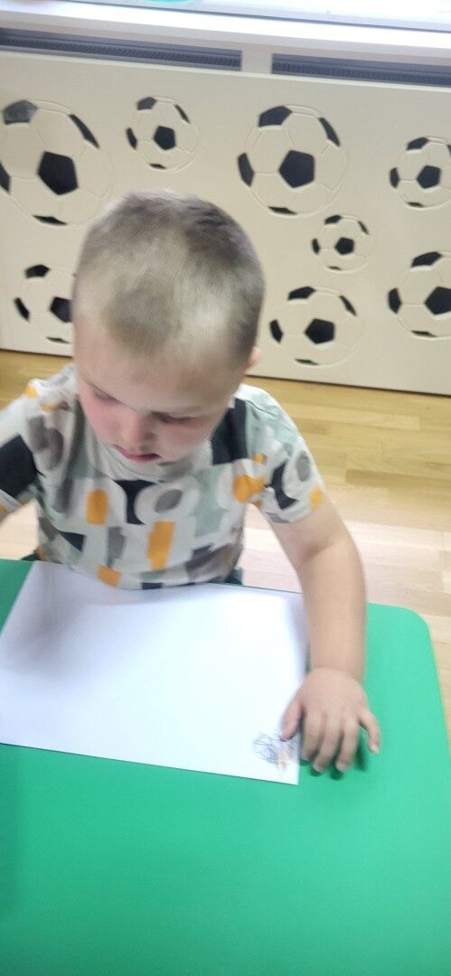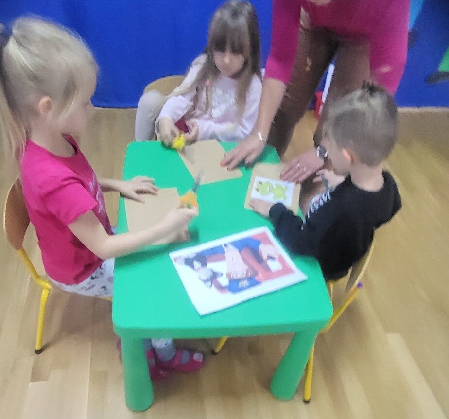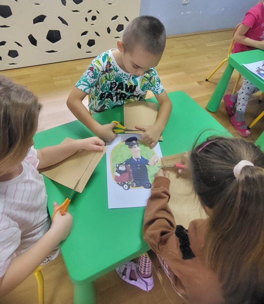 Grupa 5 – latków miała za zadanie rozciąć koperty, wyjąć z nich kartoniki i ułożyć ilustracje przedstawiające listonosza Pata.