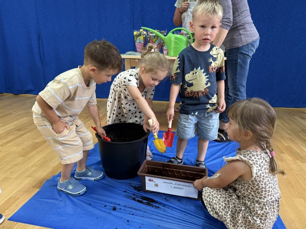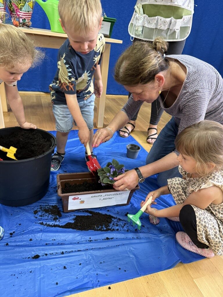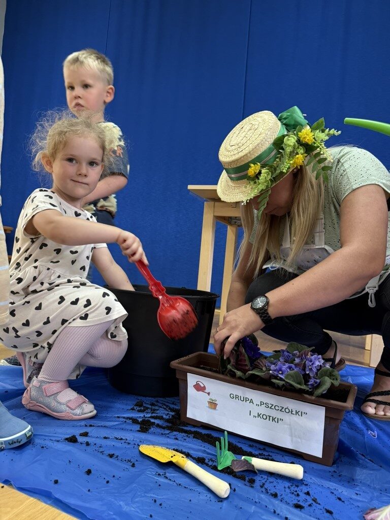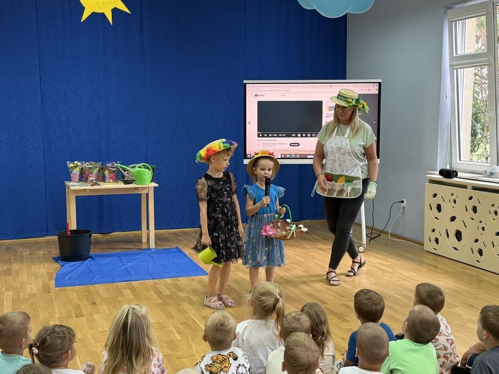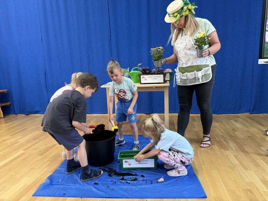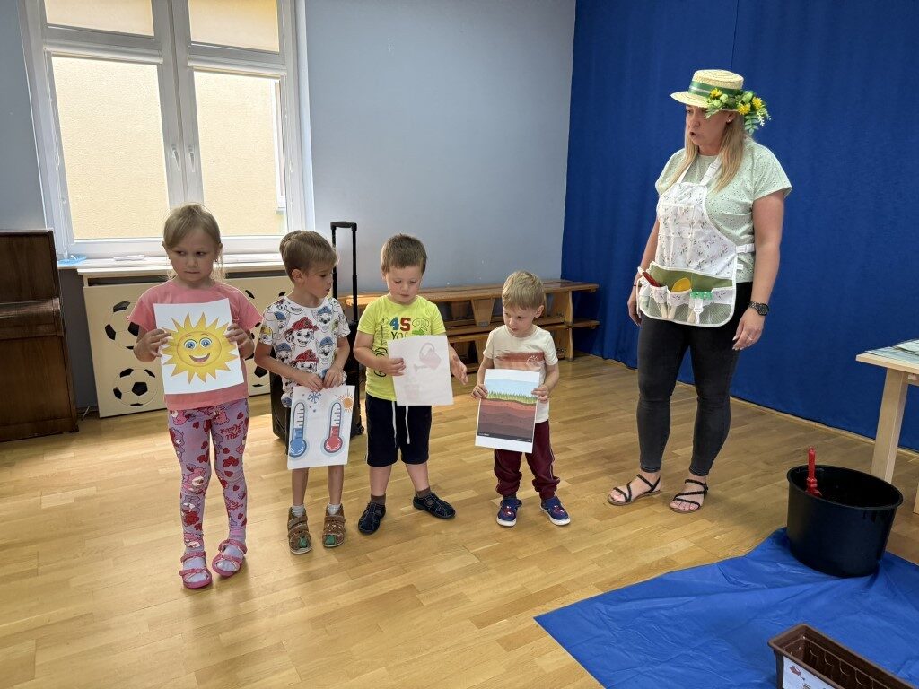 W czerwcu w naszym przedszkolu dzieci zapoznały się z pracą jaką wykonuje ogrodnik, poznały narzędzia jakie są mu potrzebne do pracy.