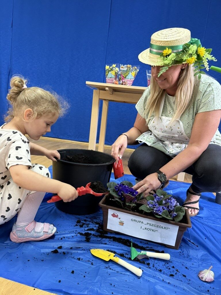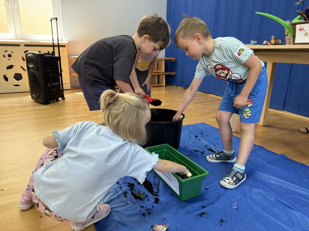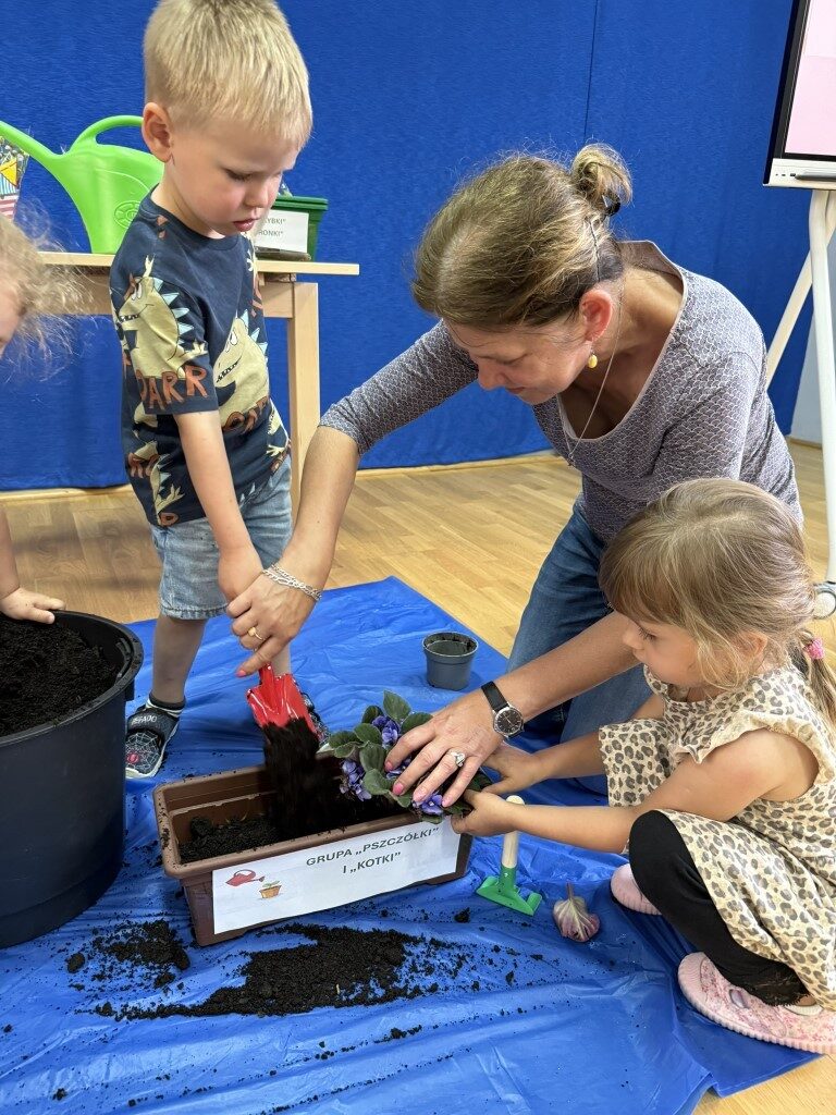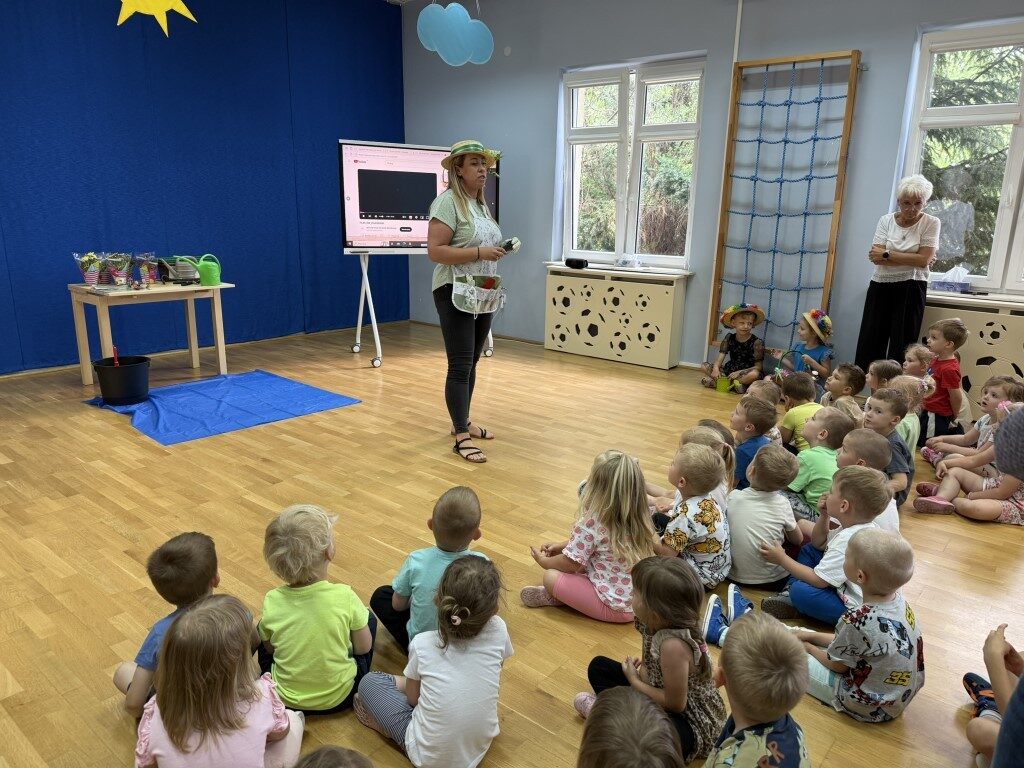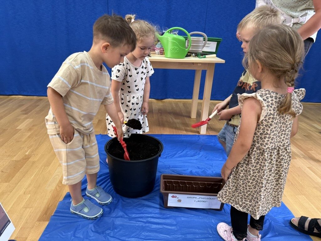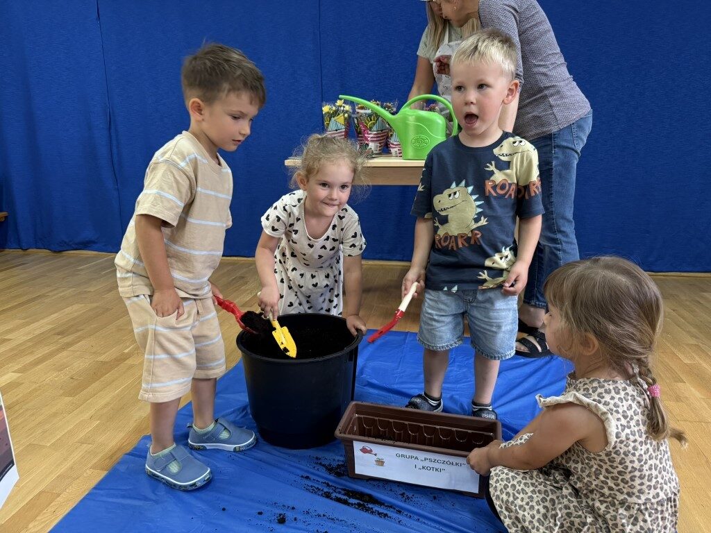 W czerwcu w naszym przedszkolu dzieci zapoznały się z pracą jaką wykonuje ogrodnik, poznały narzędzia jakie są mu potrzebne do pracy.