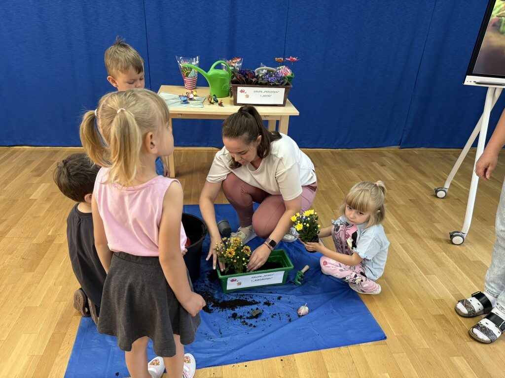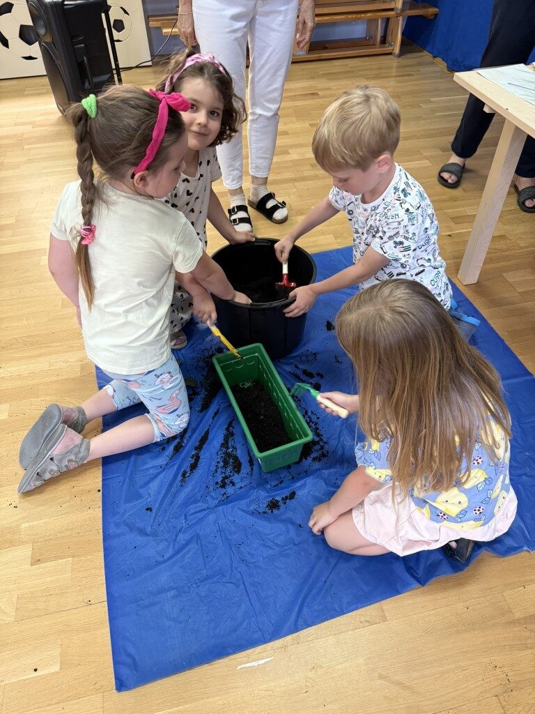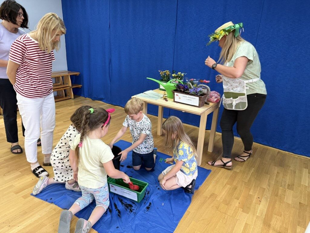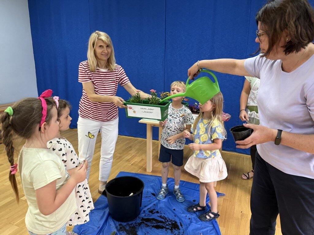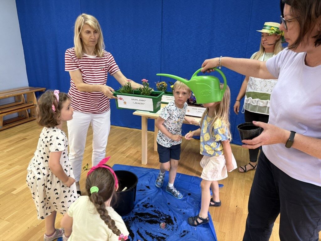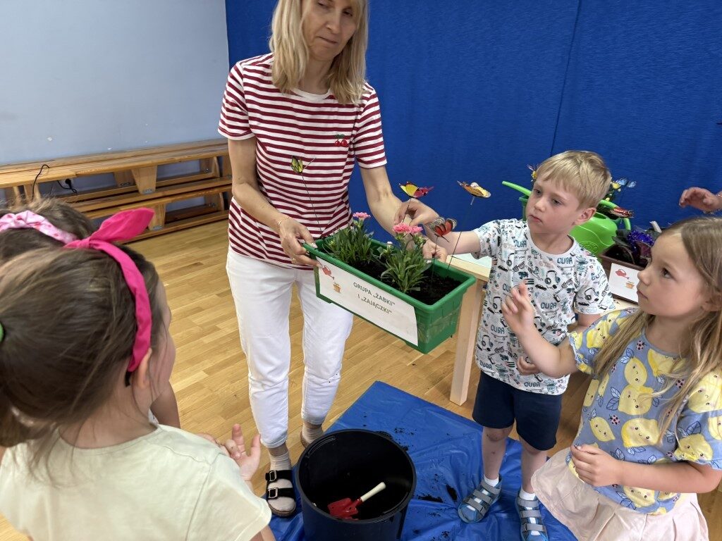 W czerwcu w naszym przedszkolu dzieci zapoznały się z pracą jaką wykonuje ogrodnik, poznały narzędzia jakie są mu potrzebne do pracy.