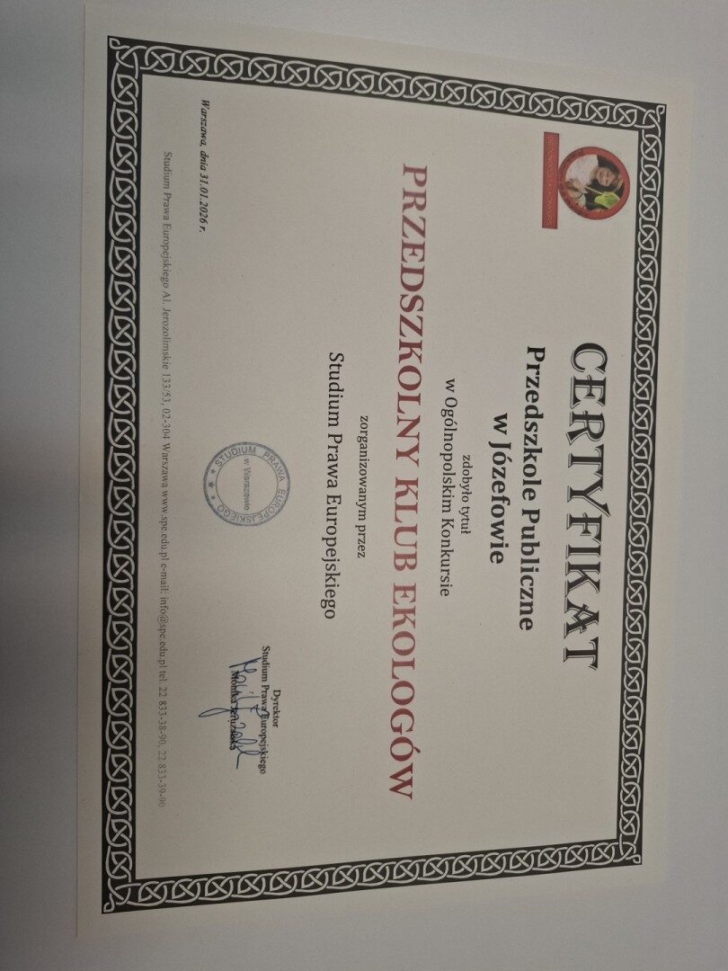 Miło nam poinformować że, Przedszkole Publiczne w Józefowie zdobyło tytuł w ogólnopolskim konkursie Przedszkolny Klub Ekologów zorganizowanym przez Studium Prawa Europejskiego którego celem było promowanie postaw proekologicznych wśród przedszkolaków, kształtowanie nawyków segregacji odpadów, zwrócenie uwagi na duże znaczenie recyklingu.