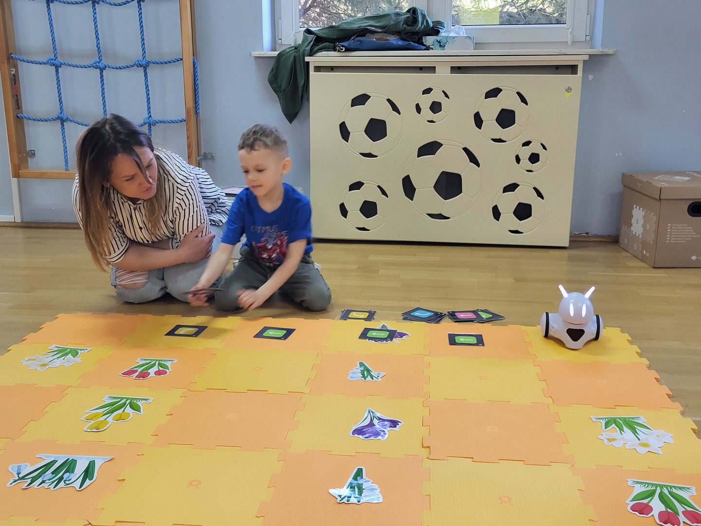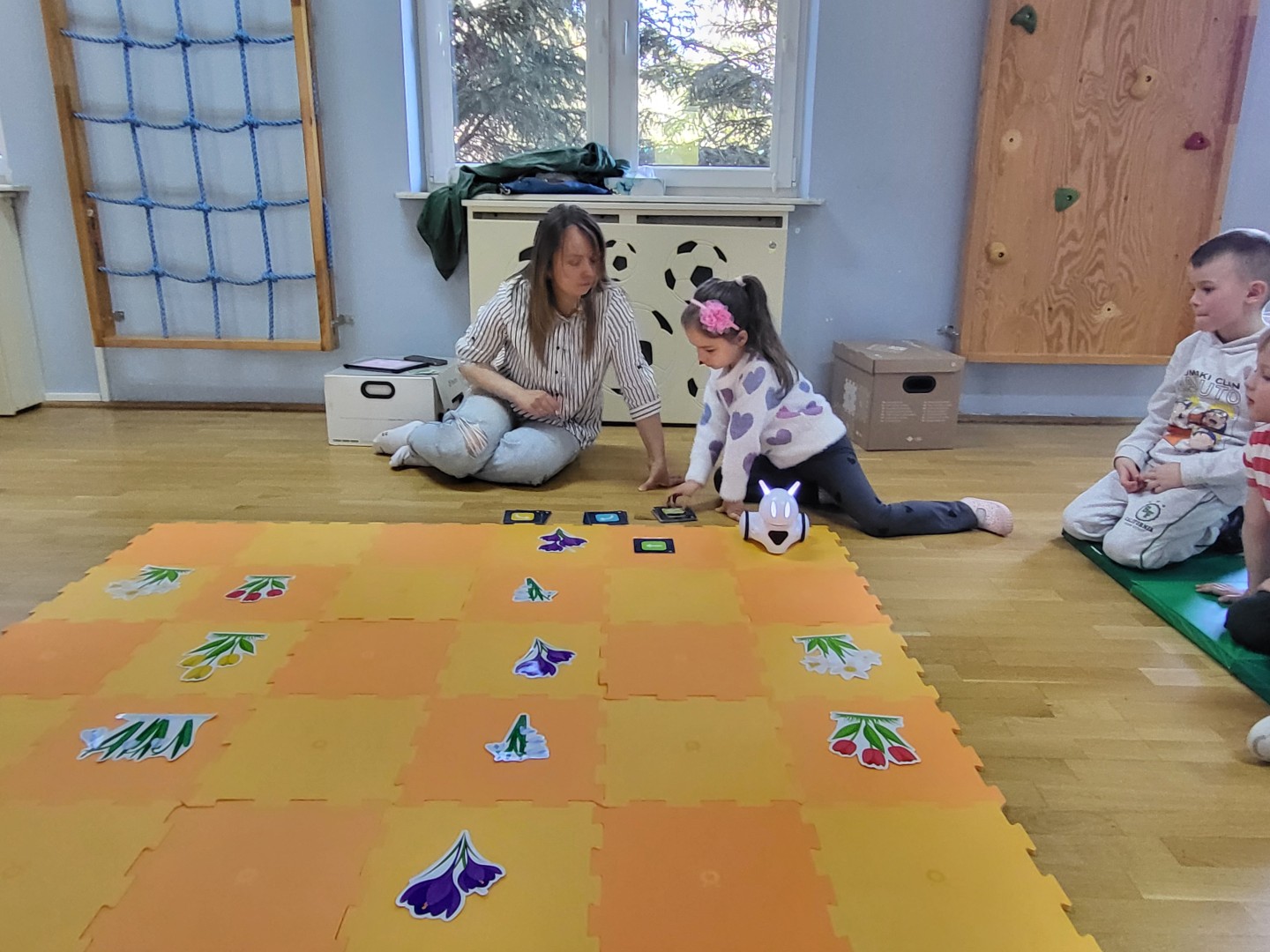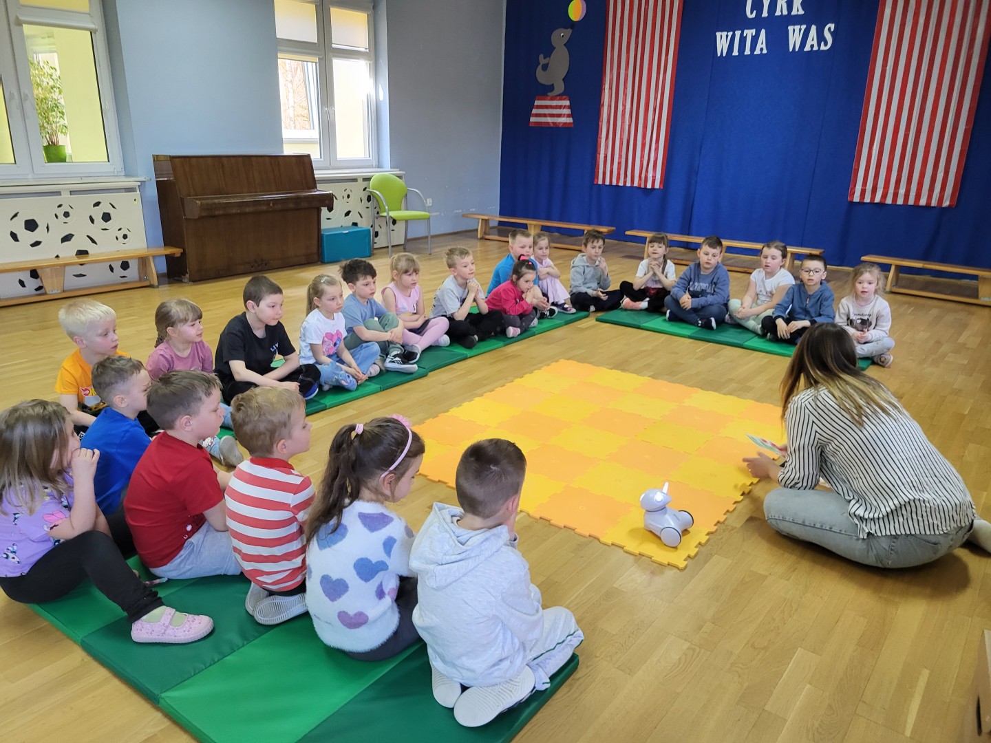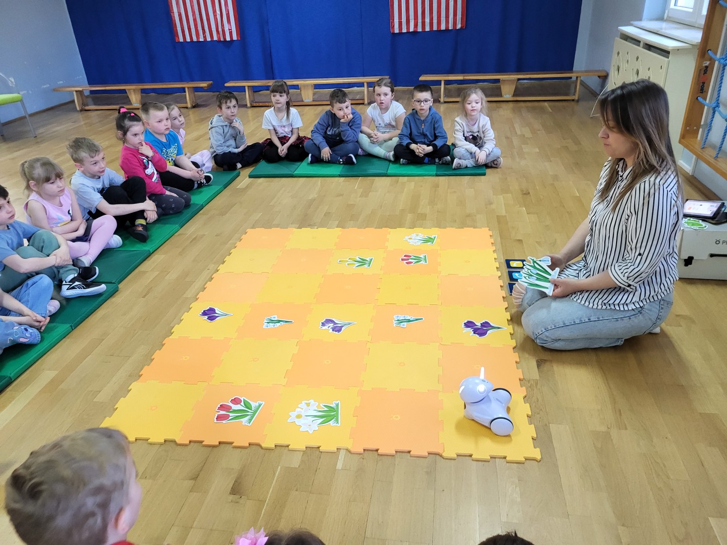Dnia 18.04.2026r w naszym przedszkolu we wszystkich grupach wiekowych odbyły się warsztaty z robotyki dla przedszkolaków. Są to nowoczesne zajęcia edukacyjne, które poprzez wspólną zabawę wprowadzają dzieci w świat technologii, inżynierii i podstaw kodowania. Maluchy uczą się, że urządzenia nie działają magicznie, lecz wykonują polecenia zaprogramowane przez człowieka. Warsztaty z robotem Photon to interaktywna przygoda, która wprowadza przedszkolaki w świat nowoczesnych technologii poprzez zabawę i eksperymenty. Podczas warsztatów dzieci wykorzystują specjalne aplikacje mobilne do rysowania trasy palcem aby sterować robotem na macie edukacyjnej .Nasze przedszkolaki miały za zadanie stworzyć przy użyciu robota bukiet wiosennych kwiatów. Dzieci mogły zmieniać kolory czułek i oczu robota oraz wybierać wydawane przez niego dźwięki.