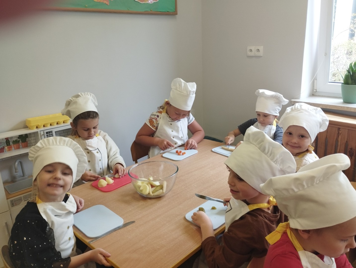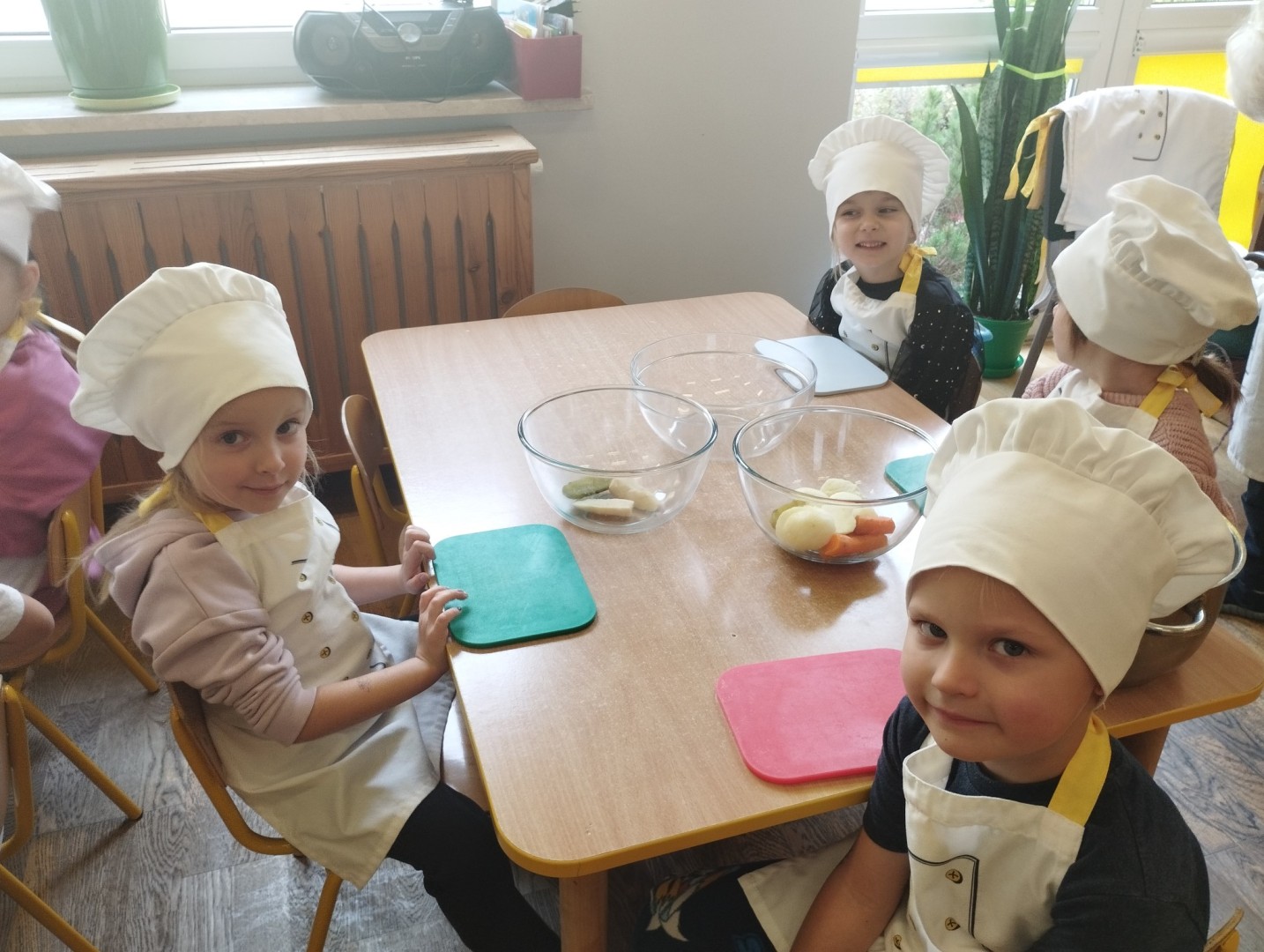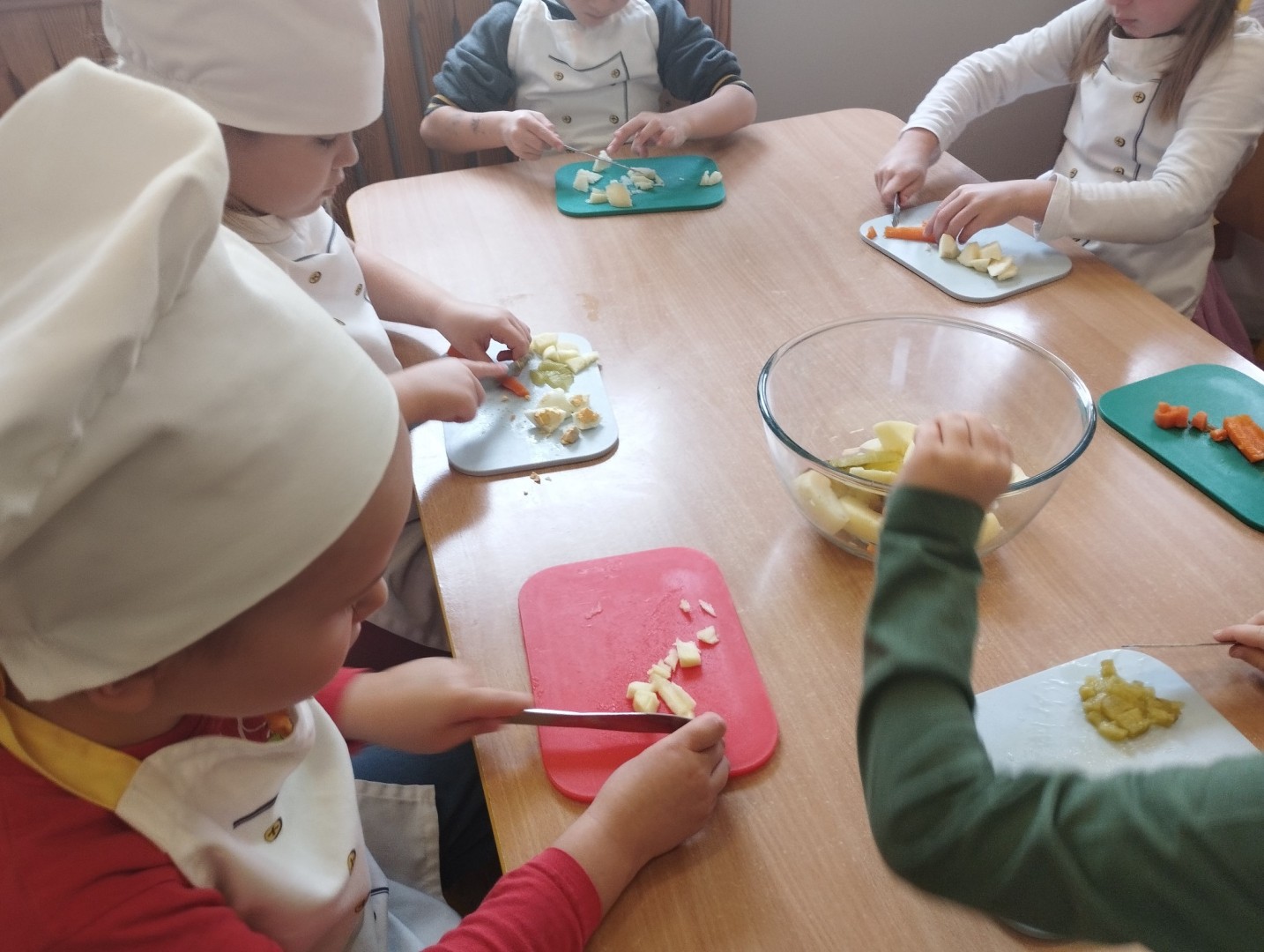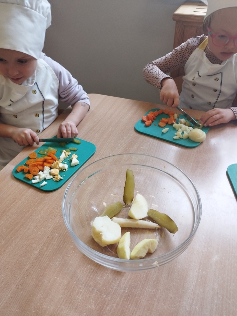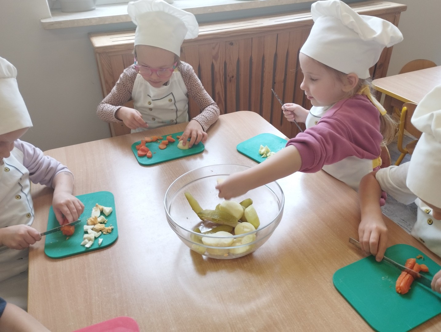 Dnia 15.10.2025r. dzieci z grupy „Żabki” kolejny raz zgłębiały tajniki kuchni polskiej. Tym razem poznawały przepis na sałatkę jarzynową. Zajęcia kulinarne rozpoczęto od przypomnienia nazw warzyw, które dzieci przyniosły z domu. Następnie przedszkolaki wskazały, które warzywa powinny znaleźć się w sałatce. Kolejnym elementem było ugotowanie warzyw w przedszkolnej kuchni. Po części przygotowawczej nastąpiła jakże wyczekiwana część praktyczna, mianowicie krojenie warzyw. Dzieci w strojach kucharzy rozpoczęły przygotowanie sałatki od pokrojenia warzyw, doprawienia sałatki zgodnie z przepisem. Na zakończenie zajęć nastąpiła degustacja przepysznego, pełnego zdrowych witamin posiłku.
