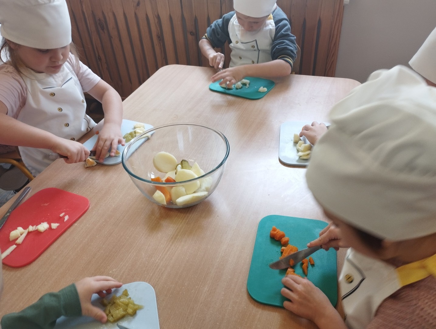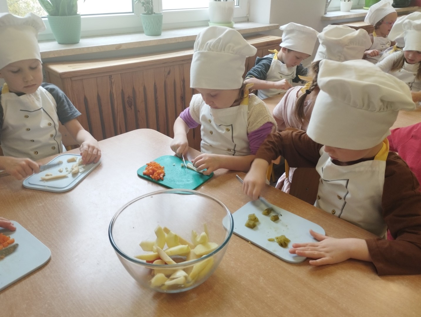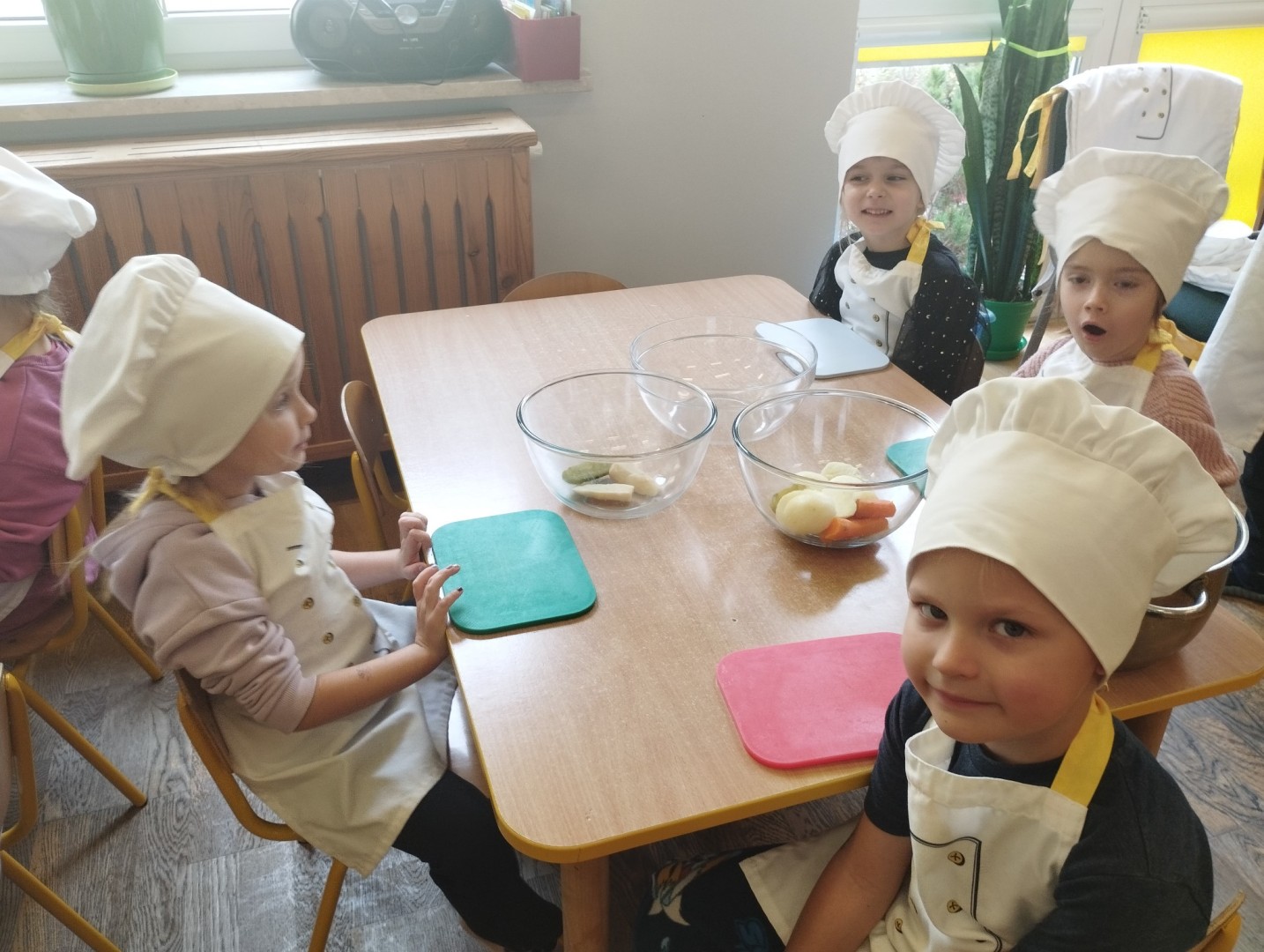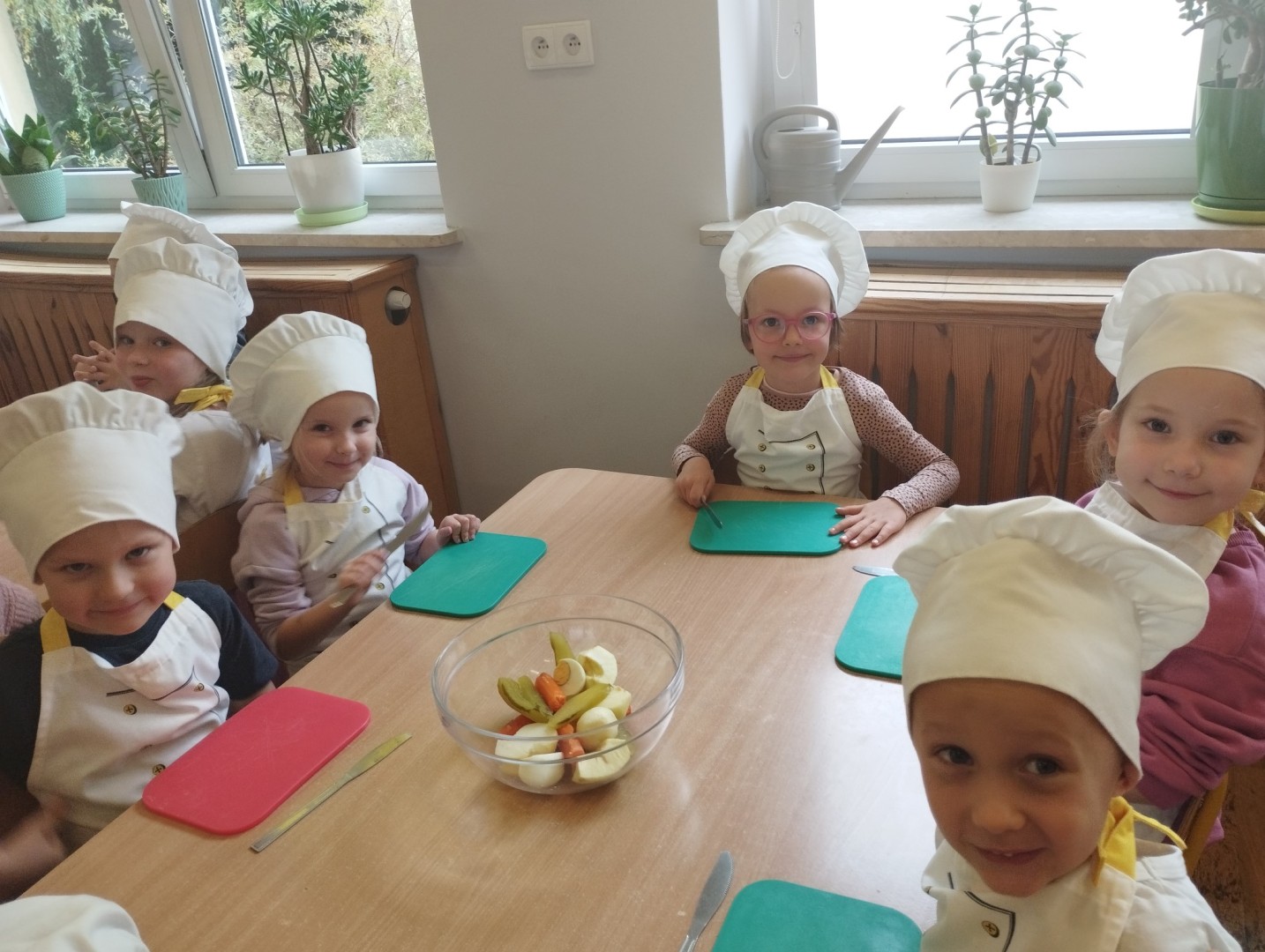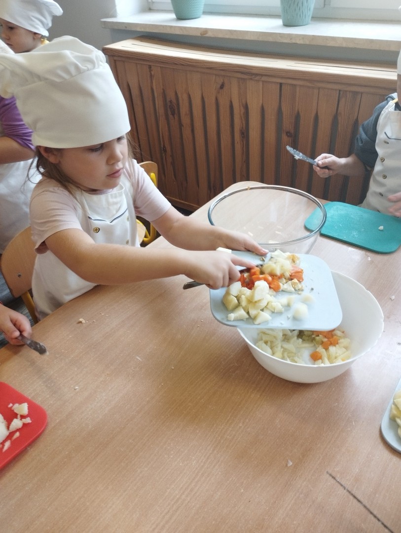 Dnia 15.10.2025r. dzieci z grupy „Żabki” kolejny raz zgłębiały tajniki kuchni polskiej. Tym razem poznawały przepis na sałatkę jarzynową. Zajęcia kulinarne rozpoczęto od przypomnienia nazw warzyw, które dzieci przyniosły z domu. Następnie przedszkolaki wskazały, które warzywa powinny znaleźć się w sałatce. Kolejnym elementem było ugotowanie warzyw w przedszkolnej kuchni. Po części przygotowawczej nastąpiła jakże wyczekiwana część praktyczna, mianowicie krojenie warzyw. Dzieci w strojach kucharzy rozpoczęły przygotowanie sałatki od pokrojenia warzyw, doprawienia sałatki zgodnie z przepisem. Na zakończenie zajęć nastąpiła degustacja przepysznego, pełnego zdrowych witamin posiłku.
