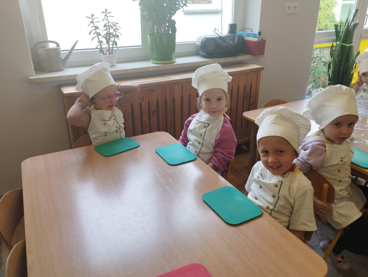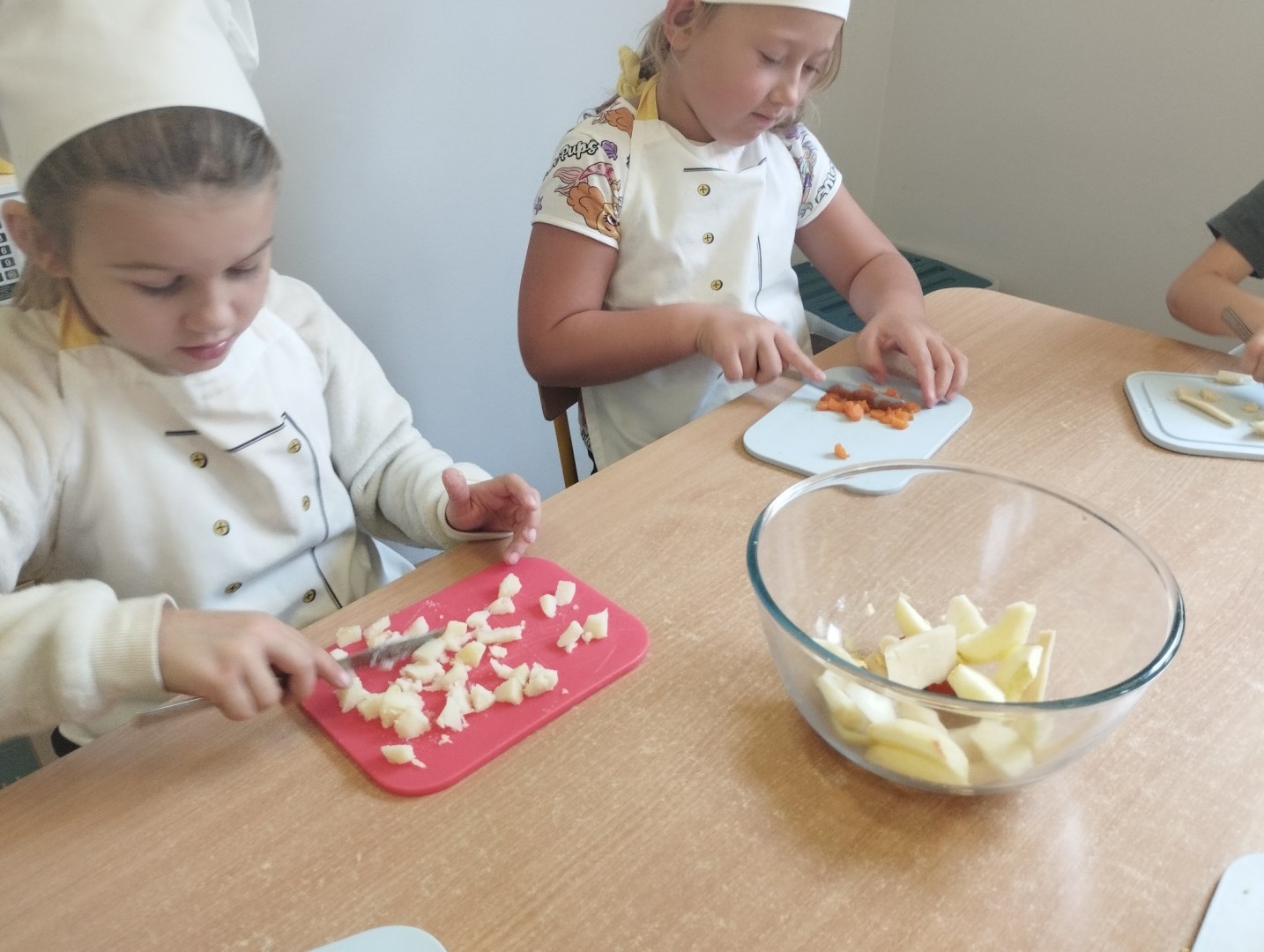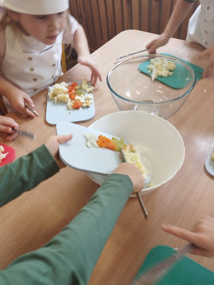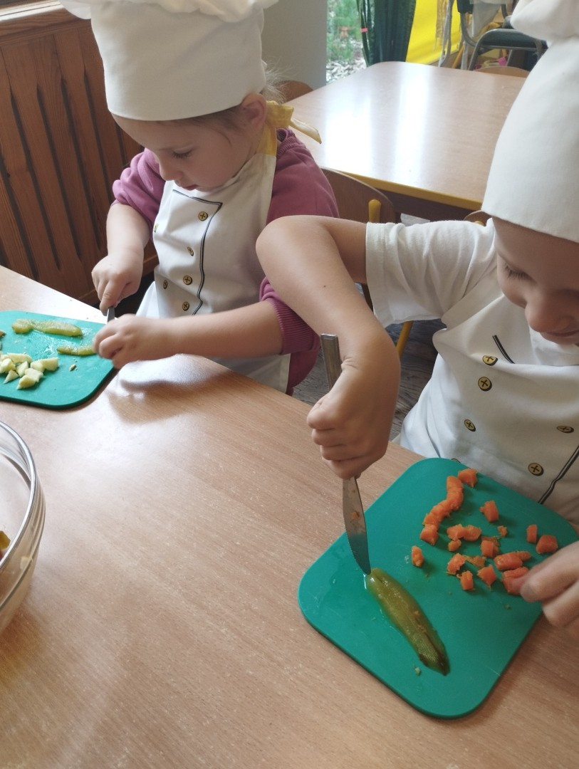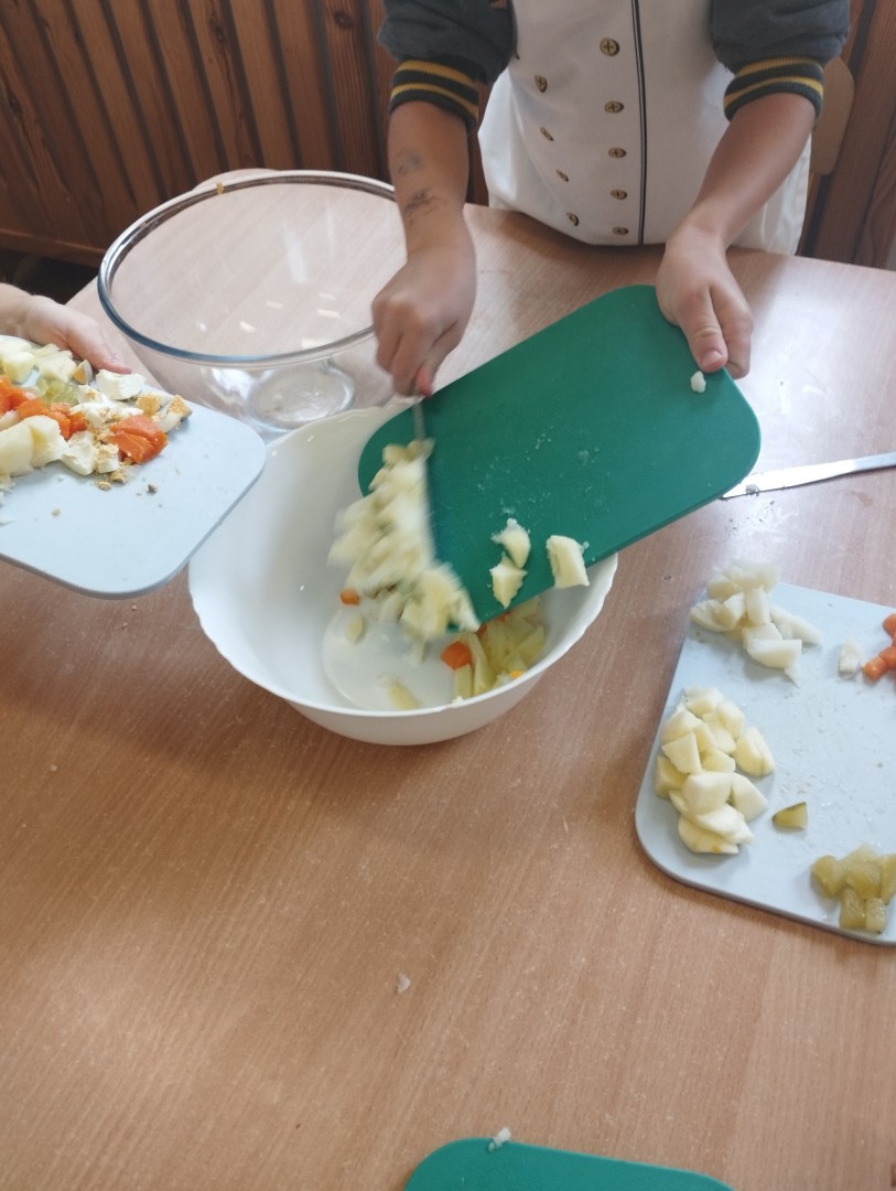 Dnia 15.10.2025r. dzieci z grupy „Żabki” kolejny raz zgłębiały tajniki kuchni polskiej. Tym razem poznawały przepis na sałatkę jarzynową. Zajęcia kulinarne rozpoczęto od przypomnienia nazw warzyw, które dzieci przyniosły z domu. Następnie przedszkolaki wskazały, które warzywa powinny znaleźć się w sałatce. Kolejnym elementem było ugotowanie warzyw w przedszkolnej kuchni. Po części przygotowawczej nastąpiła jakże wyczekiwana część praktyczna, mianowicie krojenie warzyw. Dzieci w strojach kucharzy rozpoczęły przygotowanie sałatki od pokrojenia warzyw, doprawienia sałatki zgodnie z przepisem. Na zakończenie zajęć nastąpiła degustacja przepysznego, pełnego zdrowych witamin posiłku.