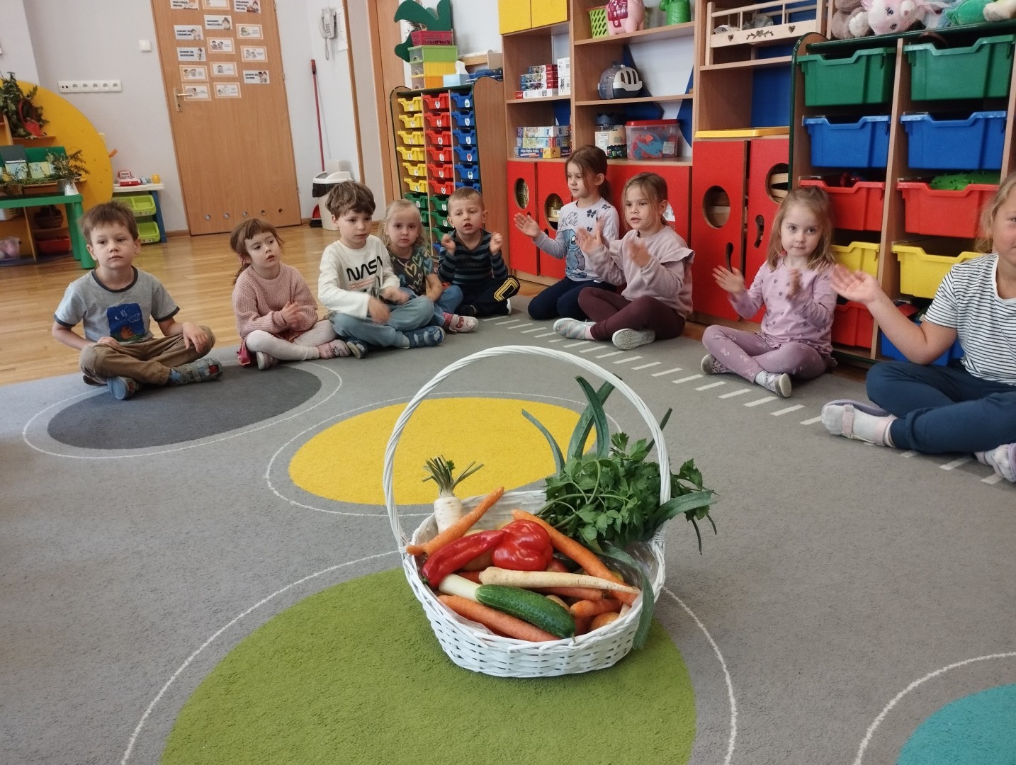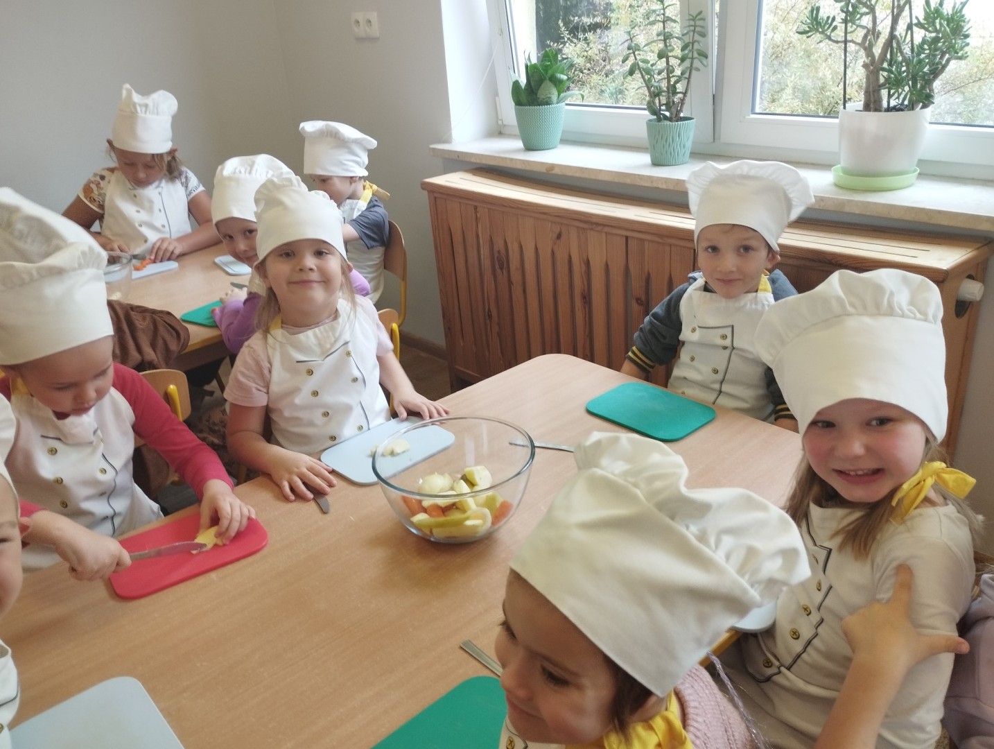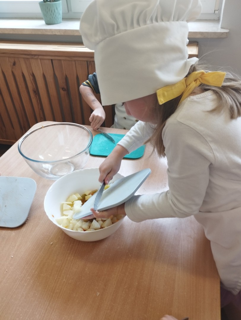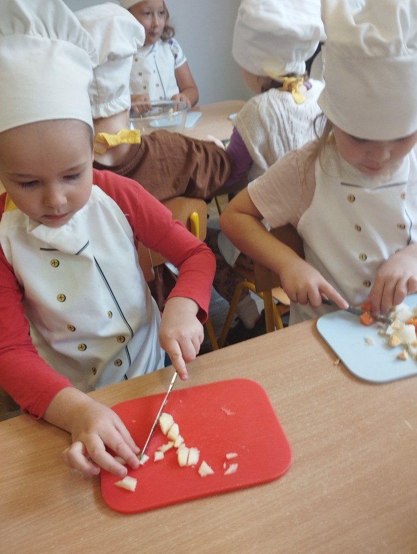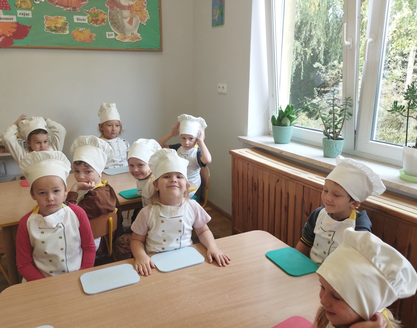 Dnia 15.10.2025r. dzieci z grupy „Żabki” kolejny raz zgłębiały tajniki kuchni polskiej. Tym razem poznawały przepis na sałatkę jarzynową. Zajęcia kulinarne rozpoczęto od przypomnienia nazw warzyw, które dzieci przyniosły z domu. Następnie przedszkolaki wskazały, które warzywa powinny znaleźć się w sałatce. Kolejnym elementem było ugotowanie warzyw w przedszkolnej kuchni. Po części przygotowawczej nastąpiła jakże wyczekiwana część praktyczna, mianowicie krojenie warzyw. Dzieci w strojach kucharzy rozpoczęły przygotowanie sałatki od pokrojenia warzyw, doprawienia sałatki zgodnie z przepisem. Na zakończenie zajęć nastąpiła degustacja przepysznego, pełnego zdrowych witamin posiłku.