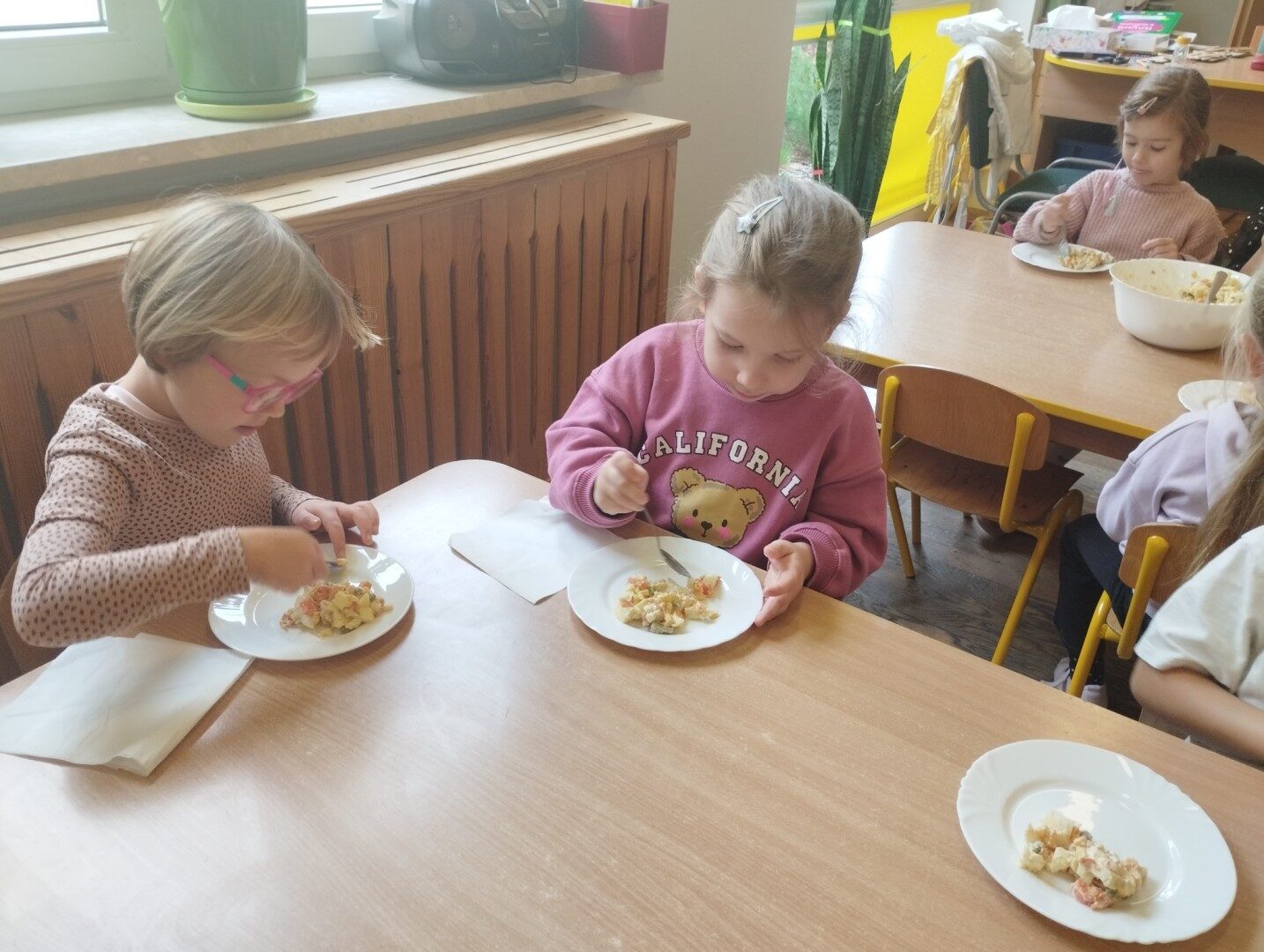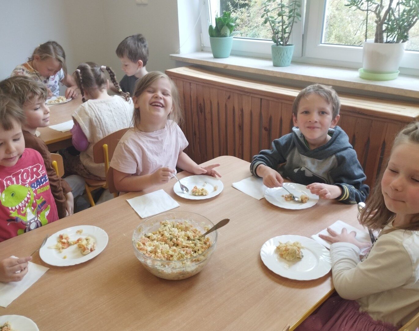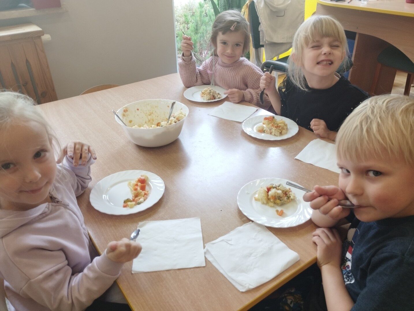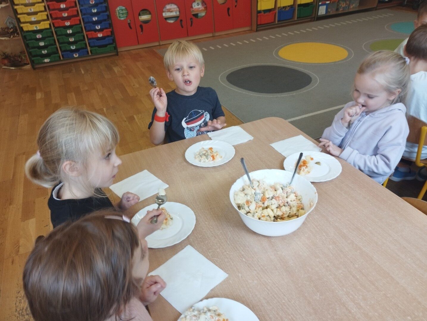 Dnia 15.10.2025r. dzieci z grupy „Żabki” kolejny raz zgłębiały tajniki kuchni polskiej. Tym razem poznawały przepis na sałatkę jarzynową. Zajęcia kulinarne rozpoczęto od przypomnienia nazw warzyw, które dzieci przyniosły z domu. Następnie przedszkolaki wskazały, które warzywa powinny znaleźć się w sałatce. Kolejnym elementem było ugotowanie warzyw w przedszkolnej kuchni. Po części przygotowawczej nastąpiła jakże wyczekiwana część praktyczna, mianowicie krojenie warzyw. Dzieci w strojach kucharzy rozpoczęły przygotowanie sałatki od pokrojenia warzyw, doprawienia sałatki zgodnie z przepisem. Na zakończenie zajęć nastąpiła degustacja przepysznego, pełnego zdrowych witamin posiłku.
