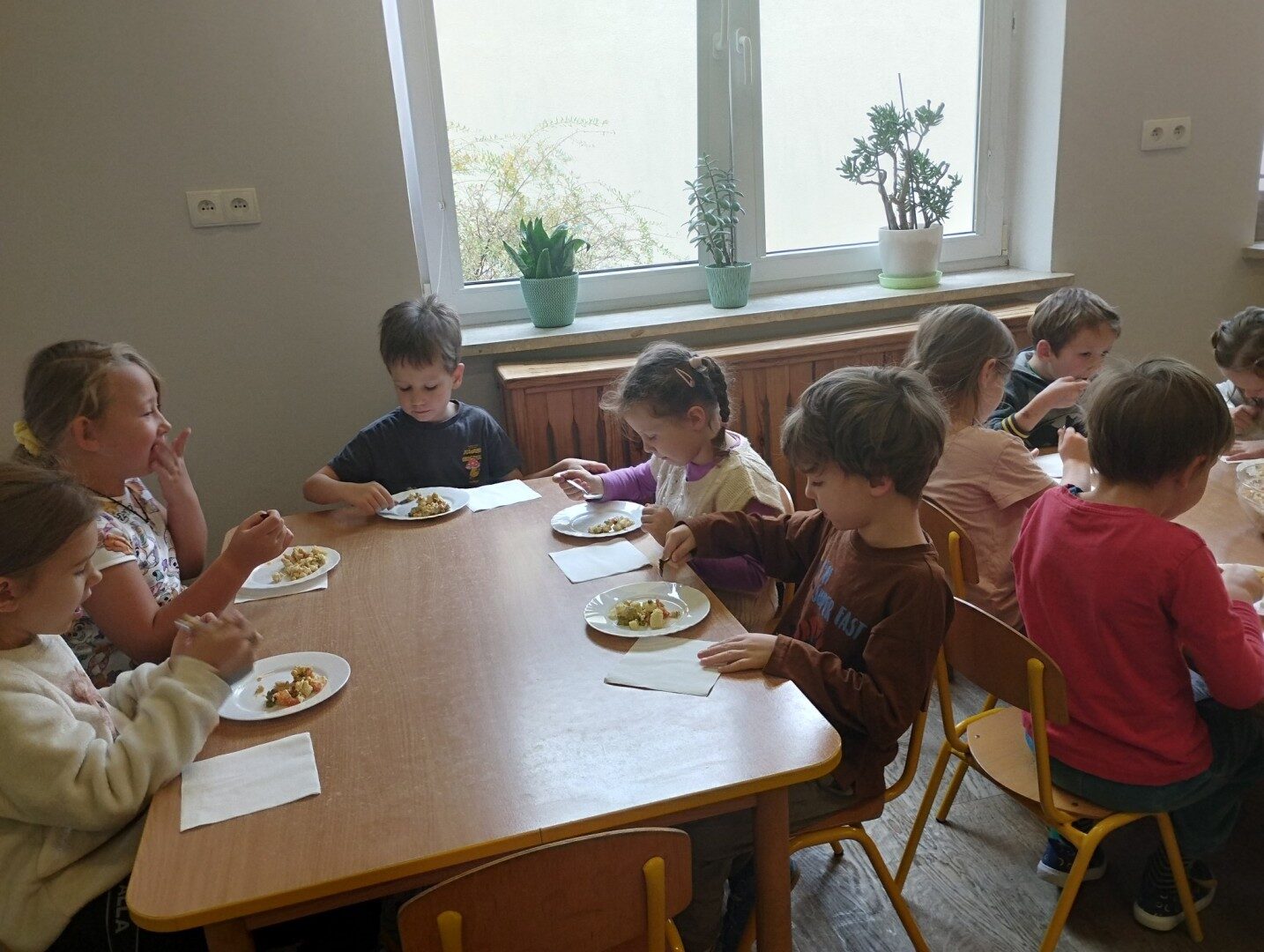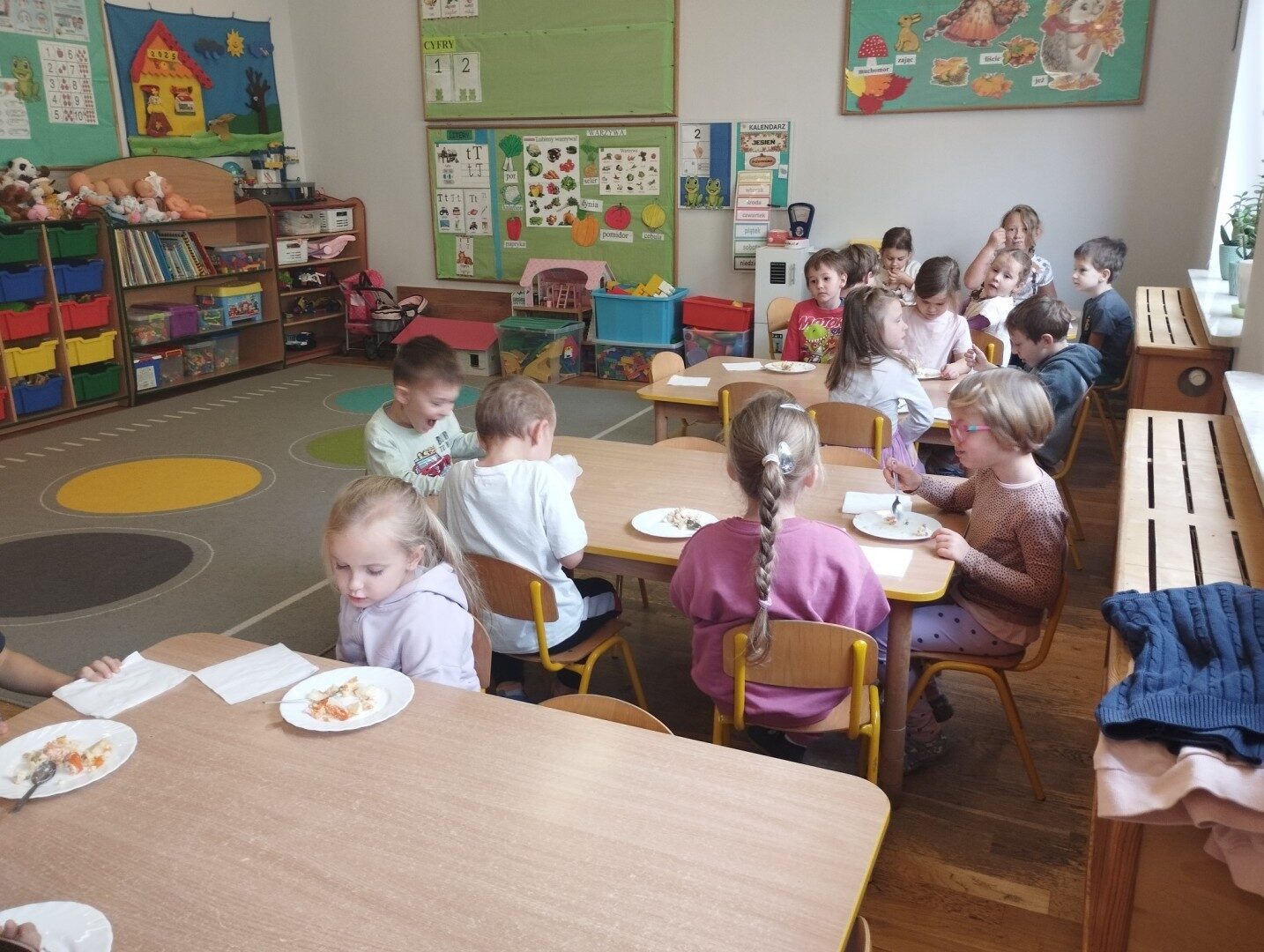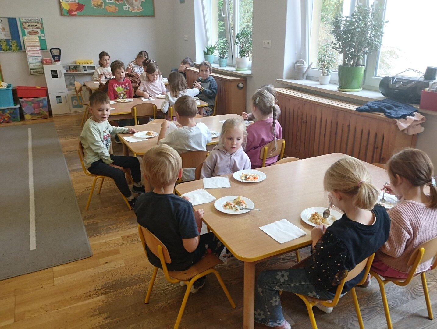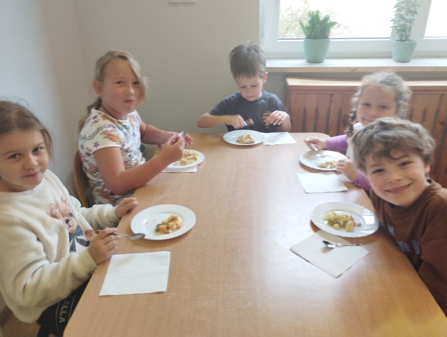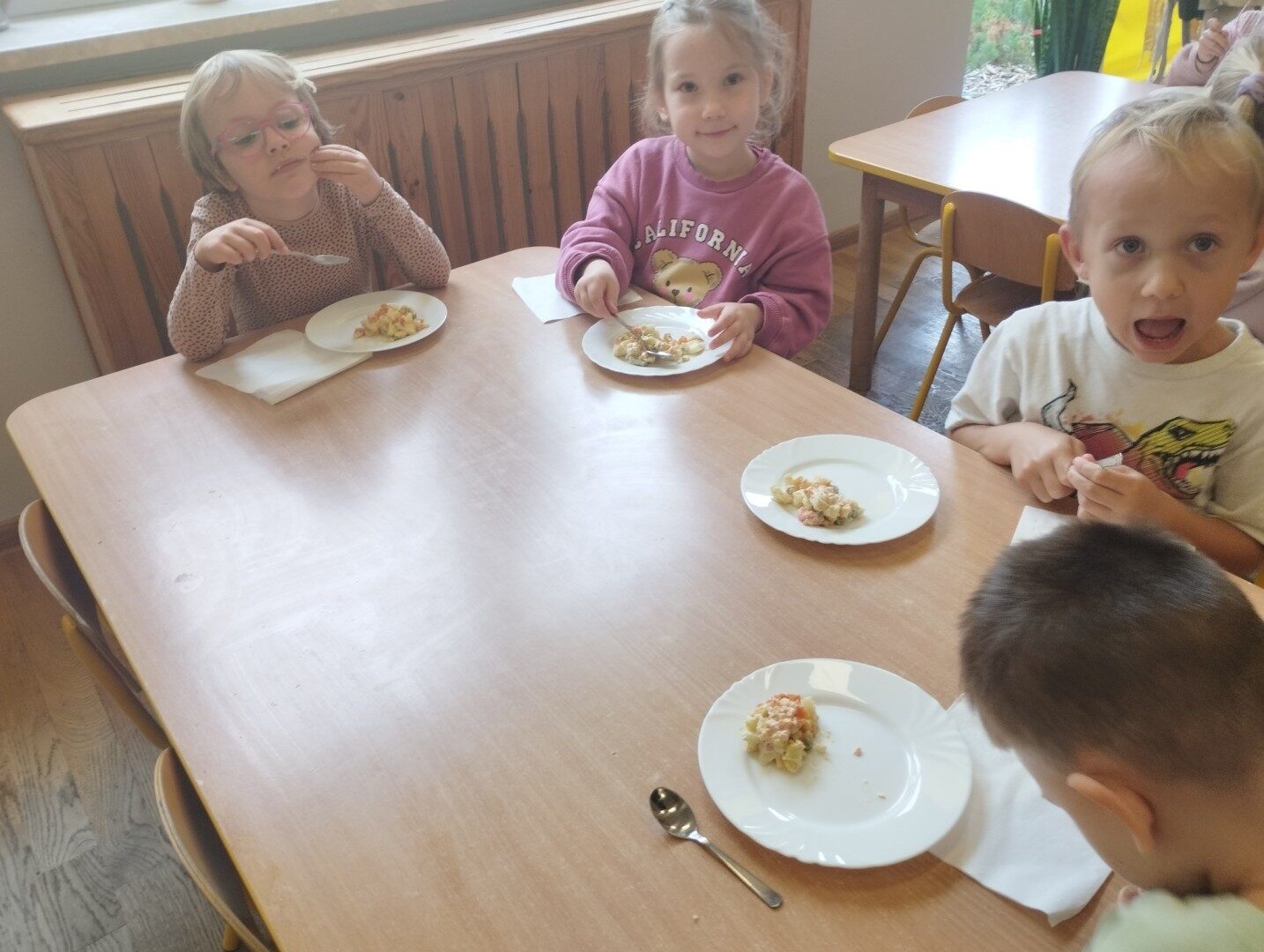 Dnia 15.10.2025r. dzieci z grupy „Żabki” kolejny raz zgłębiały tajniki kuchni polskiej. Tym razem poznawały przepis na sałatkę jarzynową. Zajęcia kulinarne rozpoczęto od przypomnienia nazw warzyw, które dzieci przyniosły z domu. Następnie przedszkolaki wskazały, które warzywa powinny znaleźć się w sałatce. Kolejnym elementem było ugotowanie warzyw w przedszkolnej kuchni. Po części przygotowawczej nastąpiła jakże wyczekiwana część praktyczna, mianowicie krojenie warzyw. Dzieci w strojach kucharzy rozpoczęły przygotowanie sałatki od pokrojenia warzyw, doprawienia sałatki zgodnie z przepisem. Na zakończenie zajęć nastąpiła degustacja przepysznego, pełnego zdrowych witamin posiłku.