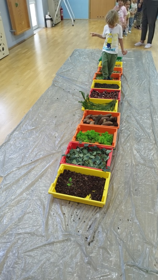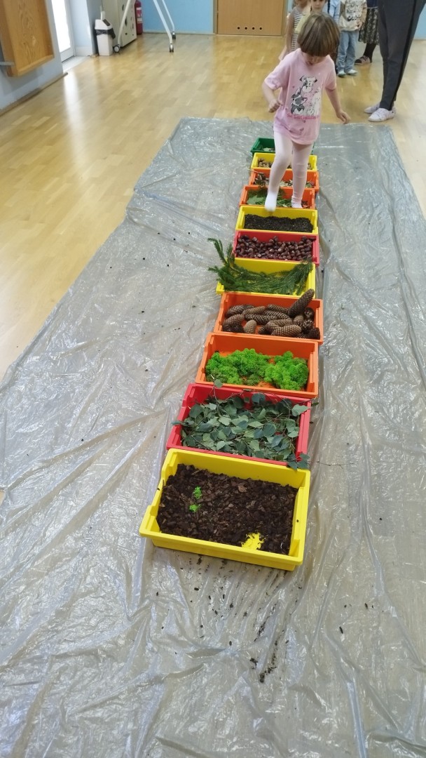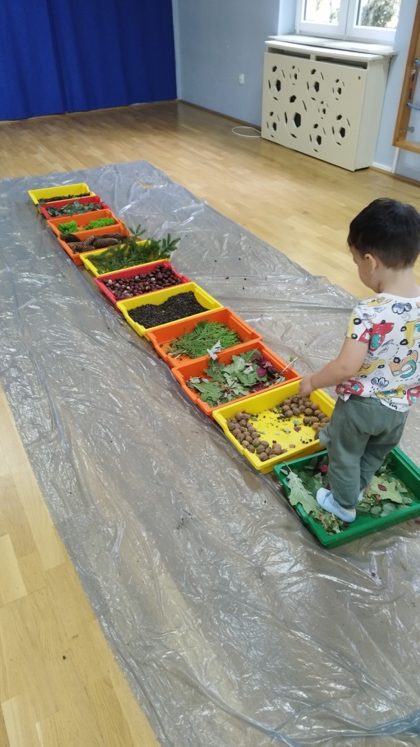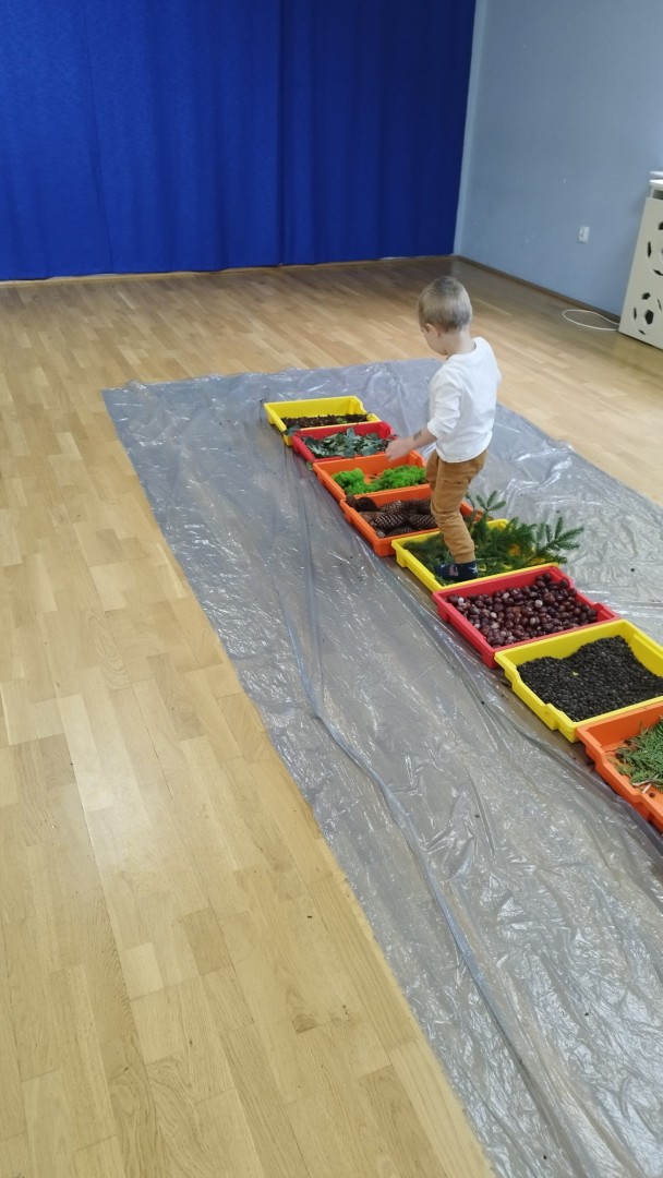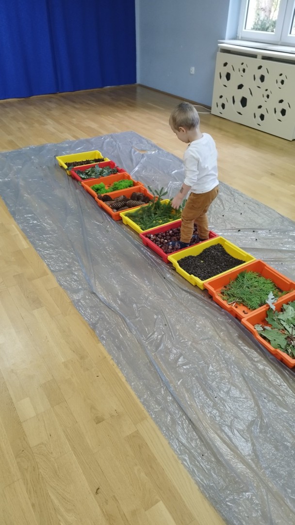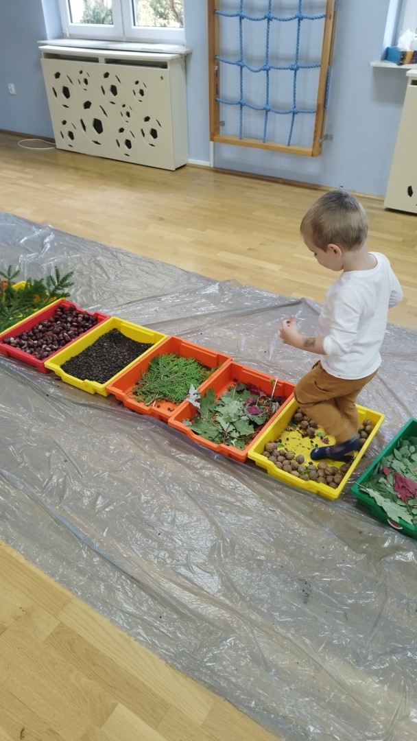 Jesienna ścieżka sensoryczna to utworzona z naturalnych darów jesieni (liści, kasztanów, szyszek, żołędzi, gałązek, kory) trasa, po której dzieci chodzą bosymi stopami, aby stymulować receptory czuciowe. Pomaga to w rozwoju motoryki dużej, poprawia równowagę i koordynację, rozwija wrażenia dotykowe, a także wspiera integrację sensoryczną i poznawanie otoczenia przez zmysły.