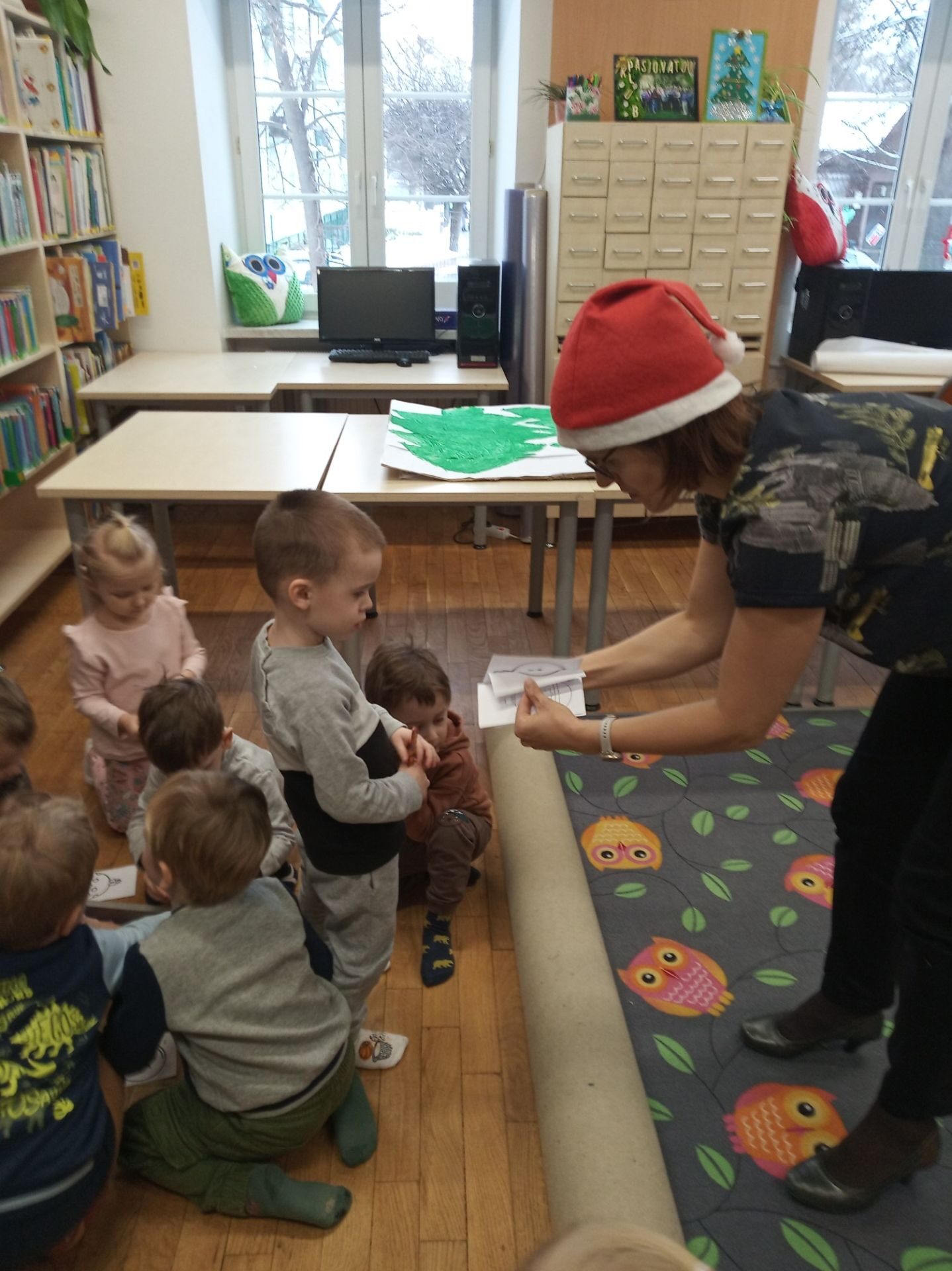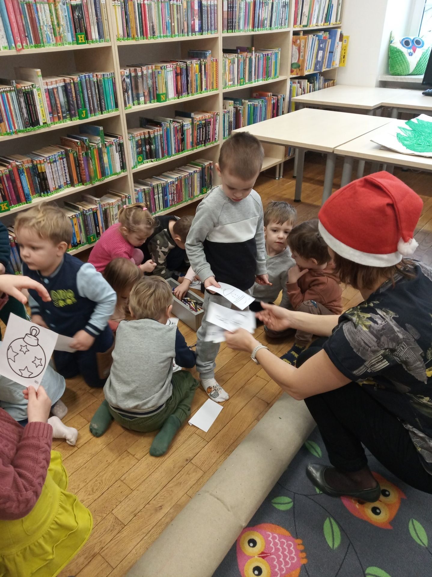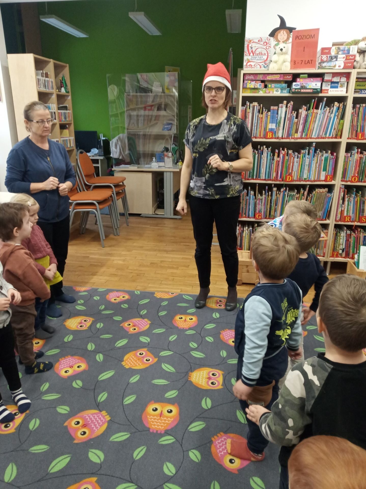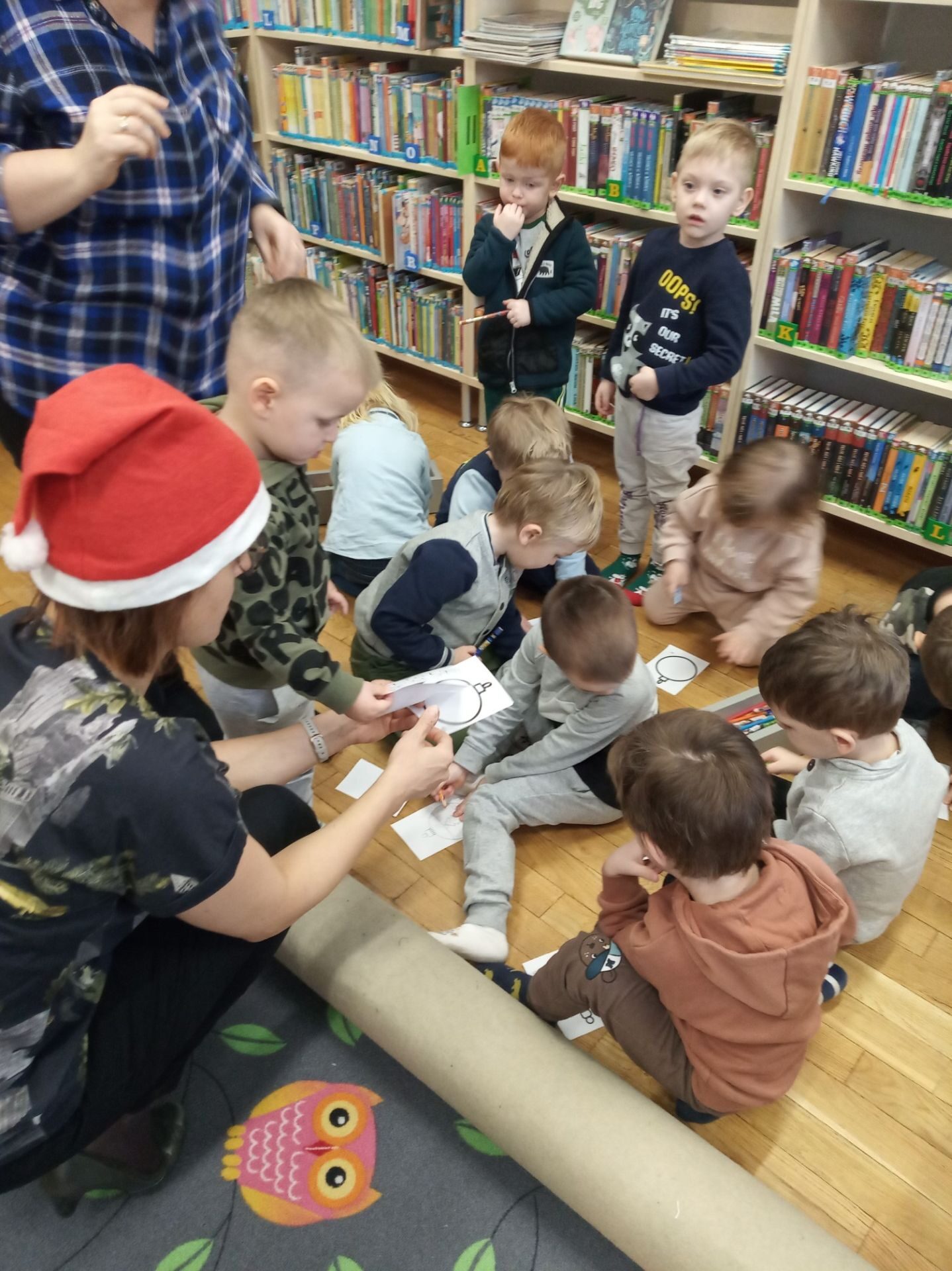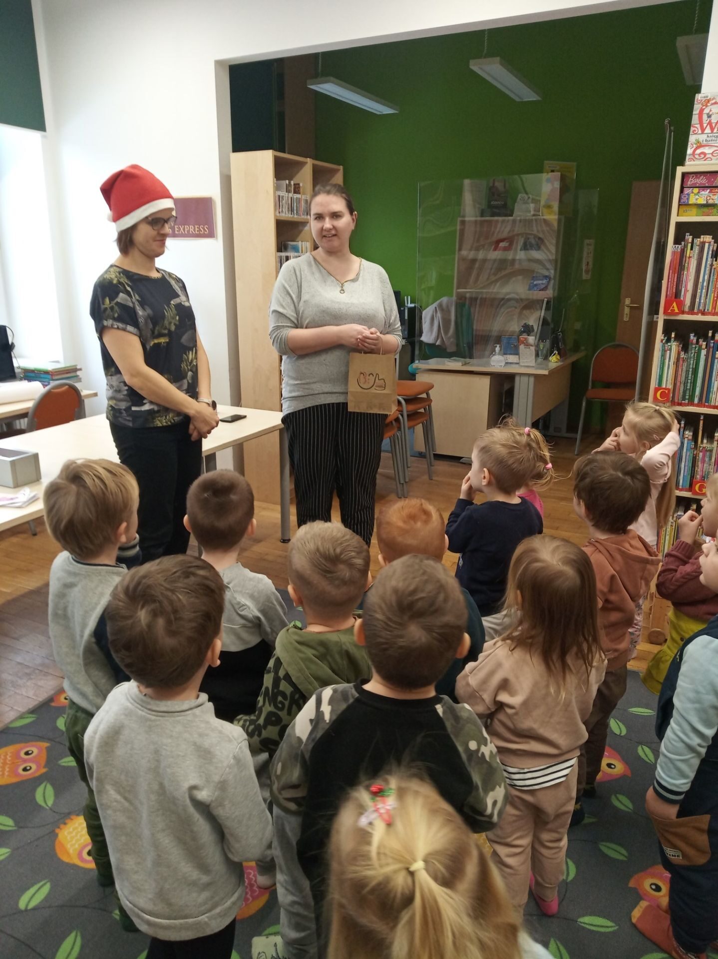Dnia 8.12.2023r. dzieci z grupy „Kotki” uczestniczyły w zajęciach bibliotecznych poprowadzonych przez Panie z Biblioteki Publicznej w Józefowie. Tematem spotkania była postać, którą dzieci uwielbiają gdy zbliżają się Święta Bożego Narodzenia, a jest nią Święty Mikołaj. Przedszkolaki opisywały wygląd Mikołaja i czym On się zajmuje. Wysłuchały krótkich opowiadań z książki pt.” Boże Narodzenie”. Bawiły się w pieczenie pierniczków- ilustrowały gestem. Dopasowywały obrazki przedstawiające prezenty do odrysowanych kształtów, kolorowały bombki. Ponadto dzieci wręczyły Paniom bibliotekarkom własnoręcznie wykonaną kartę świąteczną. Na zakończenie zajęć przedszkolaki otrzymały słodki upominek w postaci cukierków.