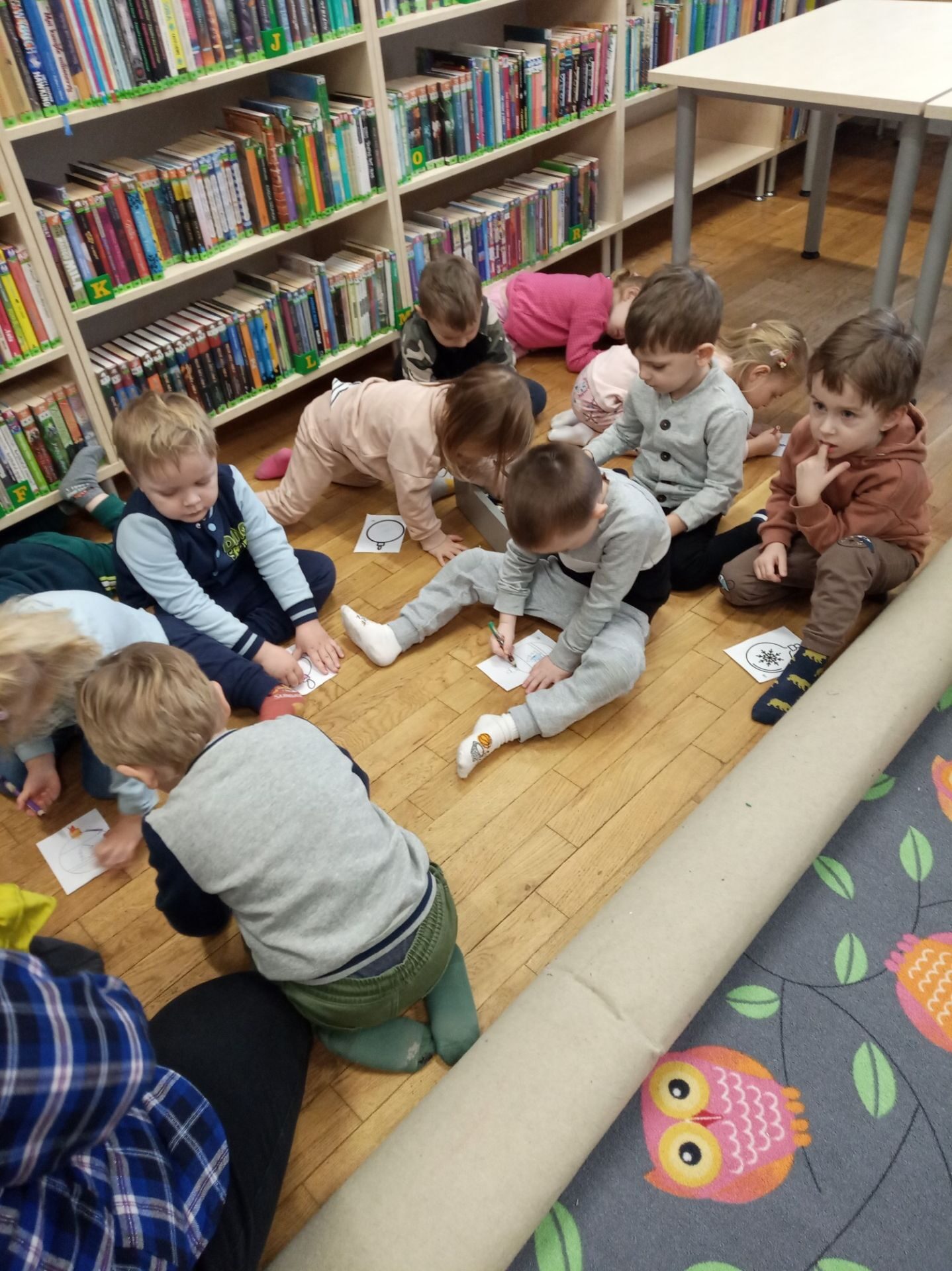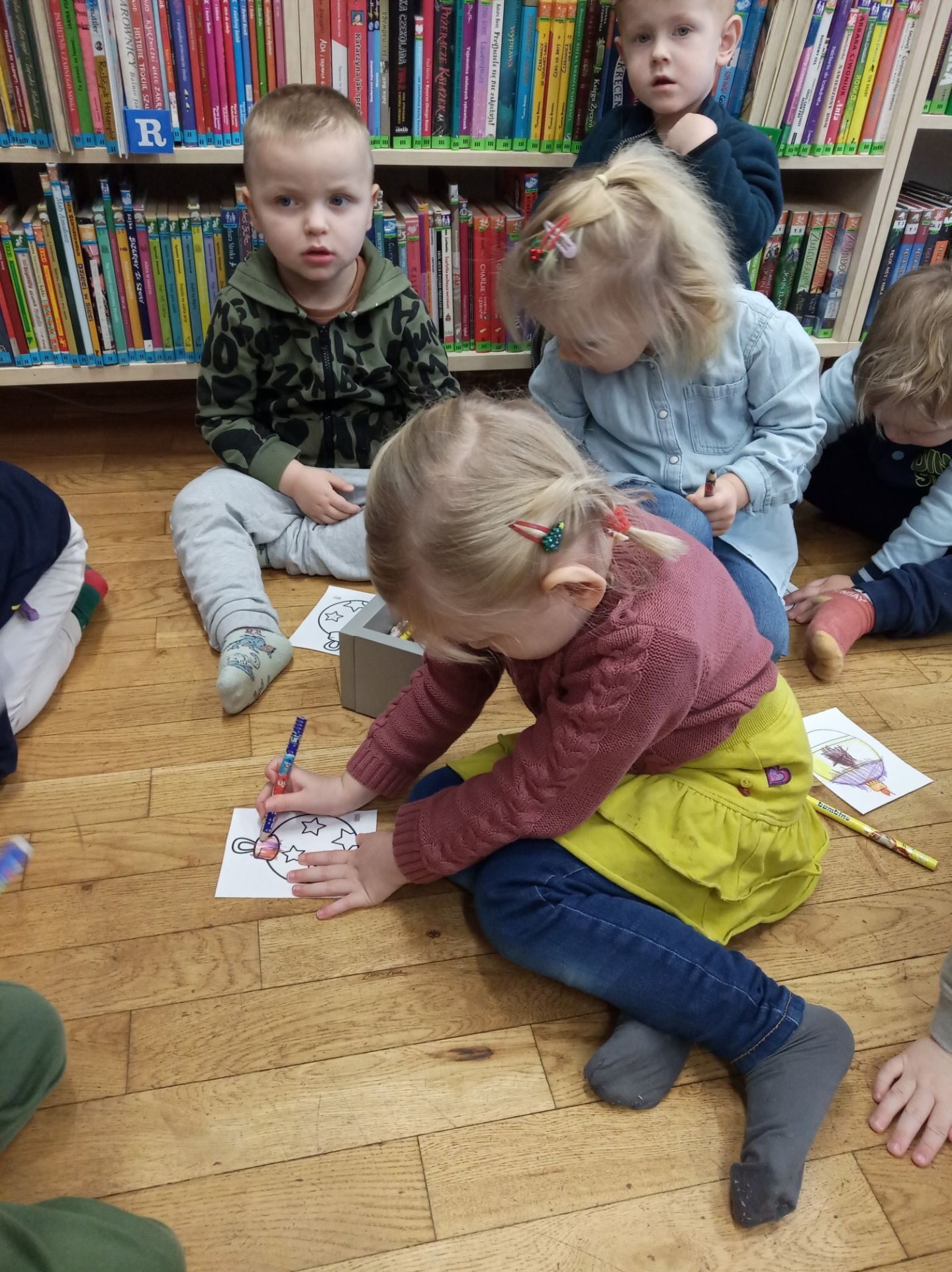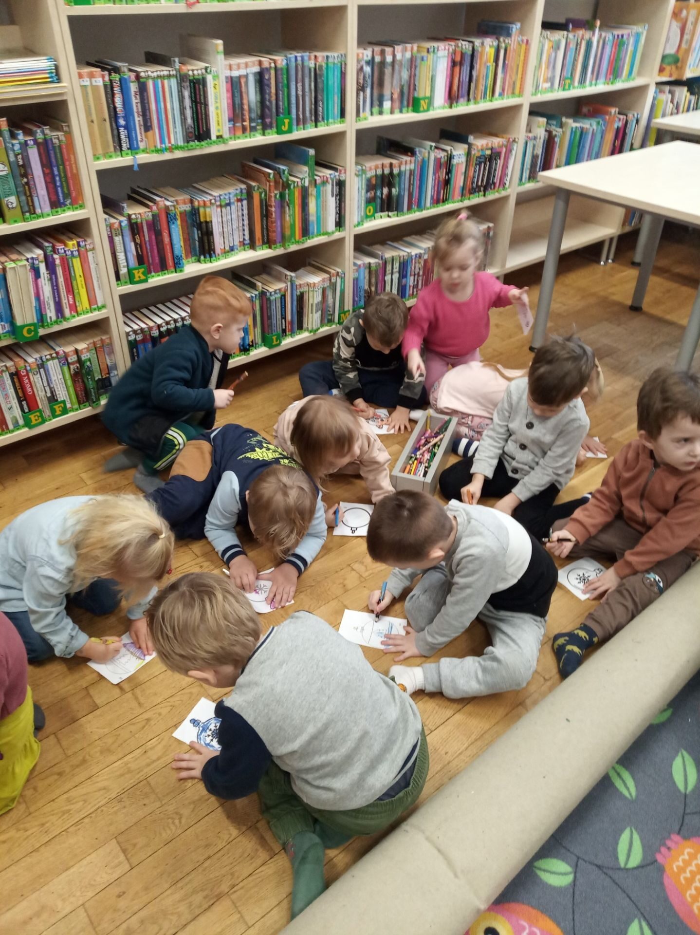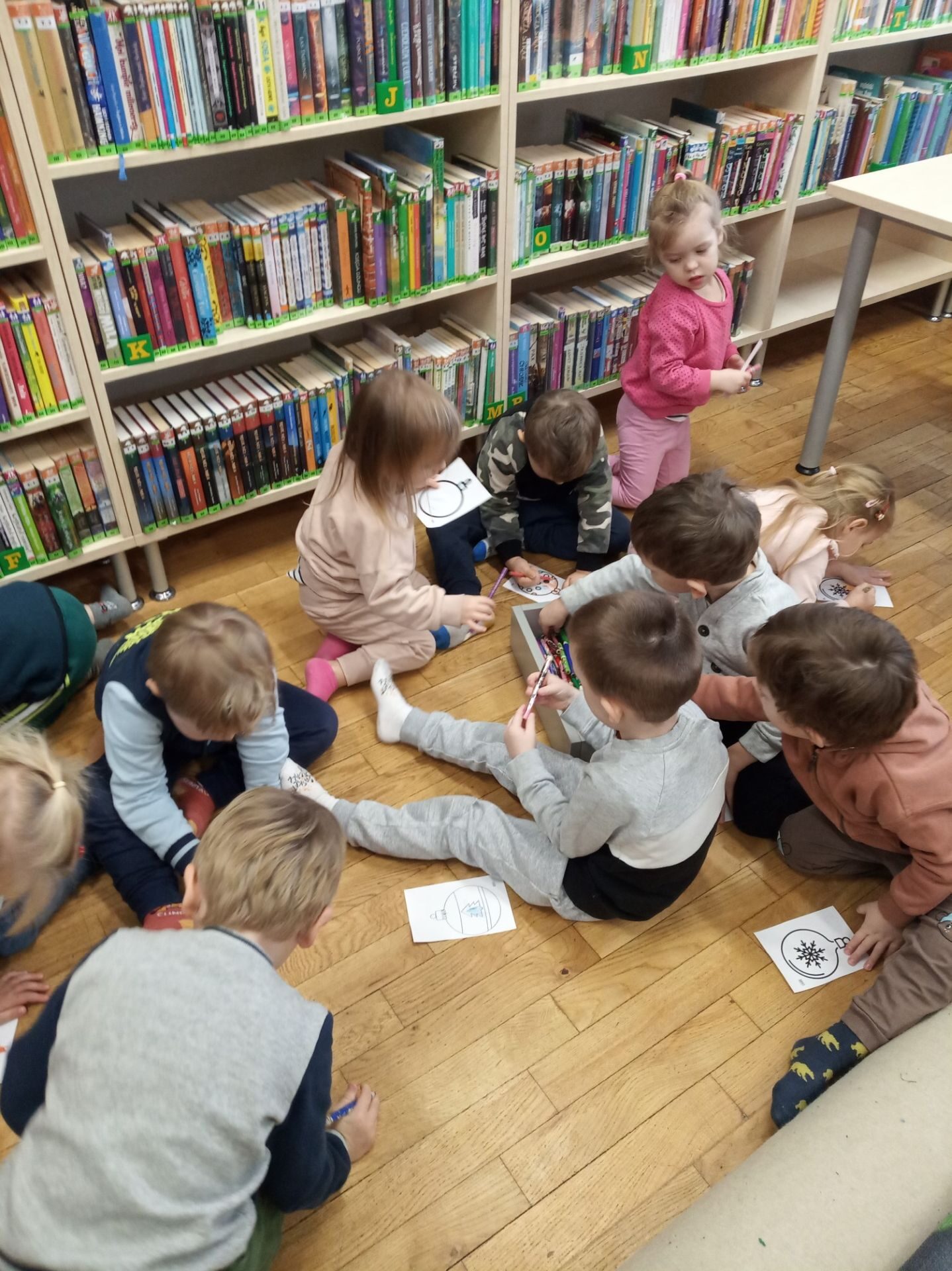 Dnia 8.12.2023r. dzieci z grupy „Kotki” uczestniczyły w zajęciach bibliotecznych poprowadzonych przez Panie z Biblioteki Publicznej w Józefowie. Tematem spotkania była postać, którą dzieci uwielbiają gdy zbliżają się Święta Bożego Narodzenia, a jest nią Święty Mikołaj. Przedszkolaki opisywały wygląd Mikołaja i czym On się zajmuje. Wysłuchały krótkich opowiadań z książki pt.” Boże Narodzenie”. Bawiły się w pieczenie pierniczków- ilustrowały gestem. Dopasowywały obrazki przedstawiające prezenty do odrysowanych kształtów, kolorowały bombki. Ponadto dzieci wręczyły Paniom bibliotekarkom własnoręcznie wykonaną kartę świąteczną. Na zakończenie zajęć przedszkolaki otrzymały słodki upominek w postaci cukierków.