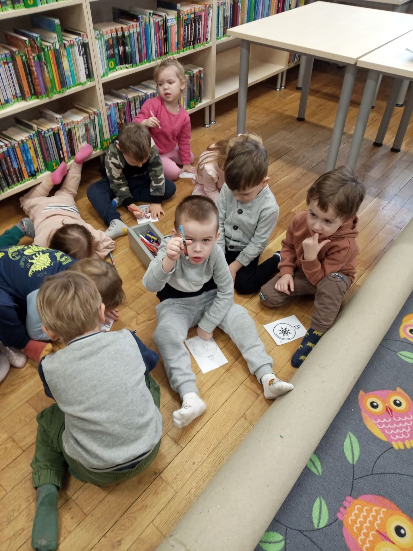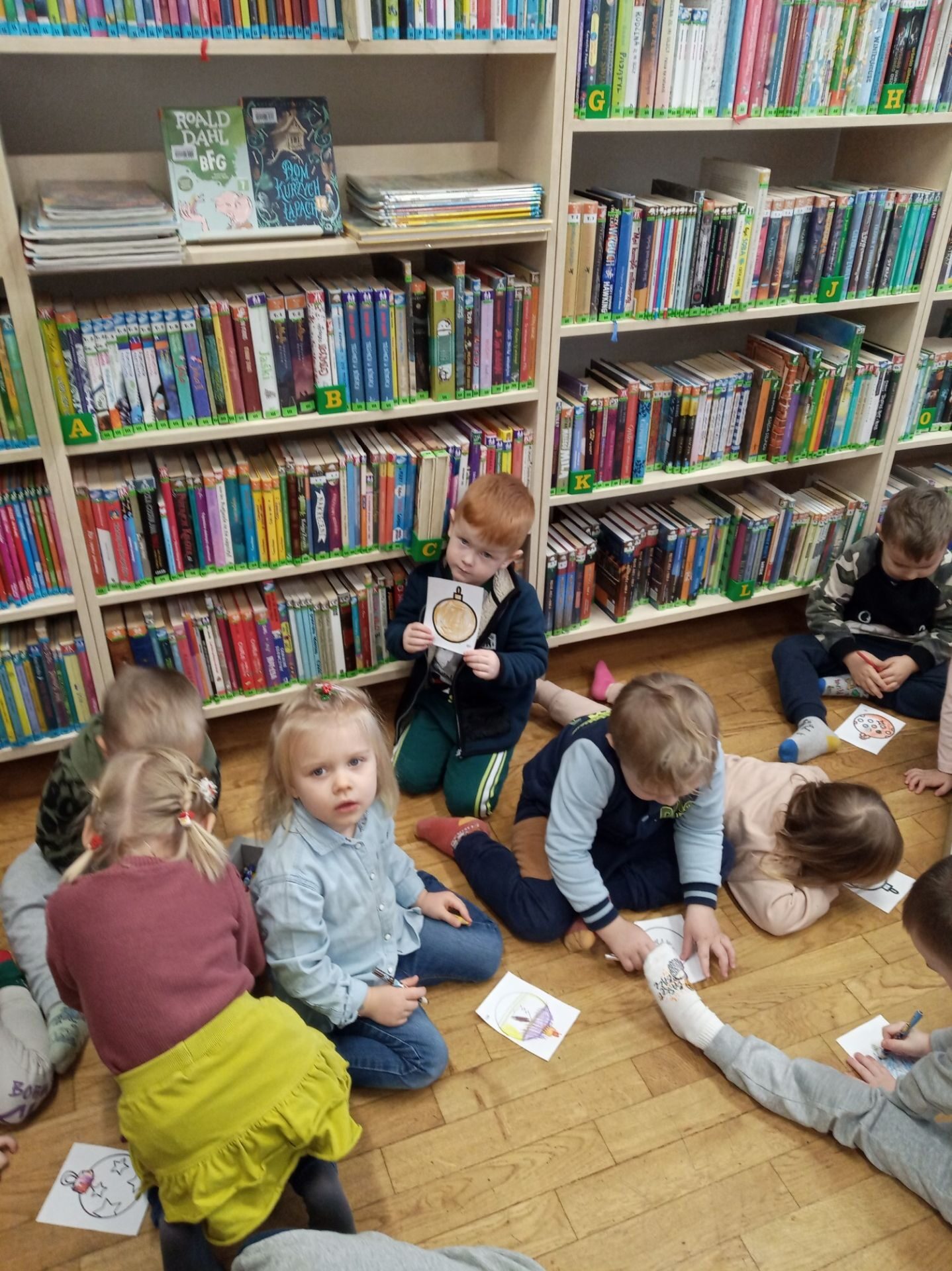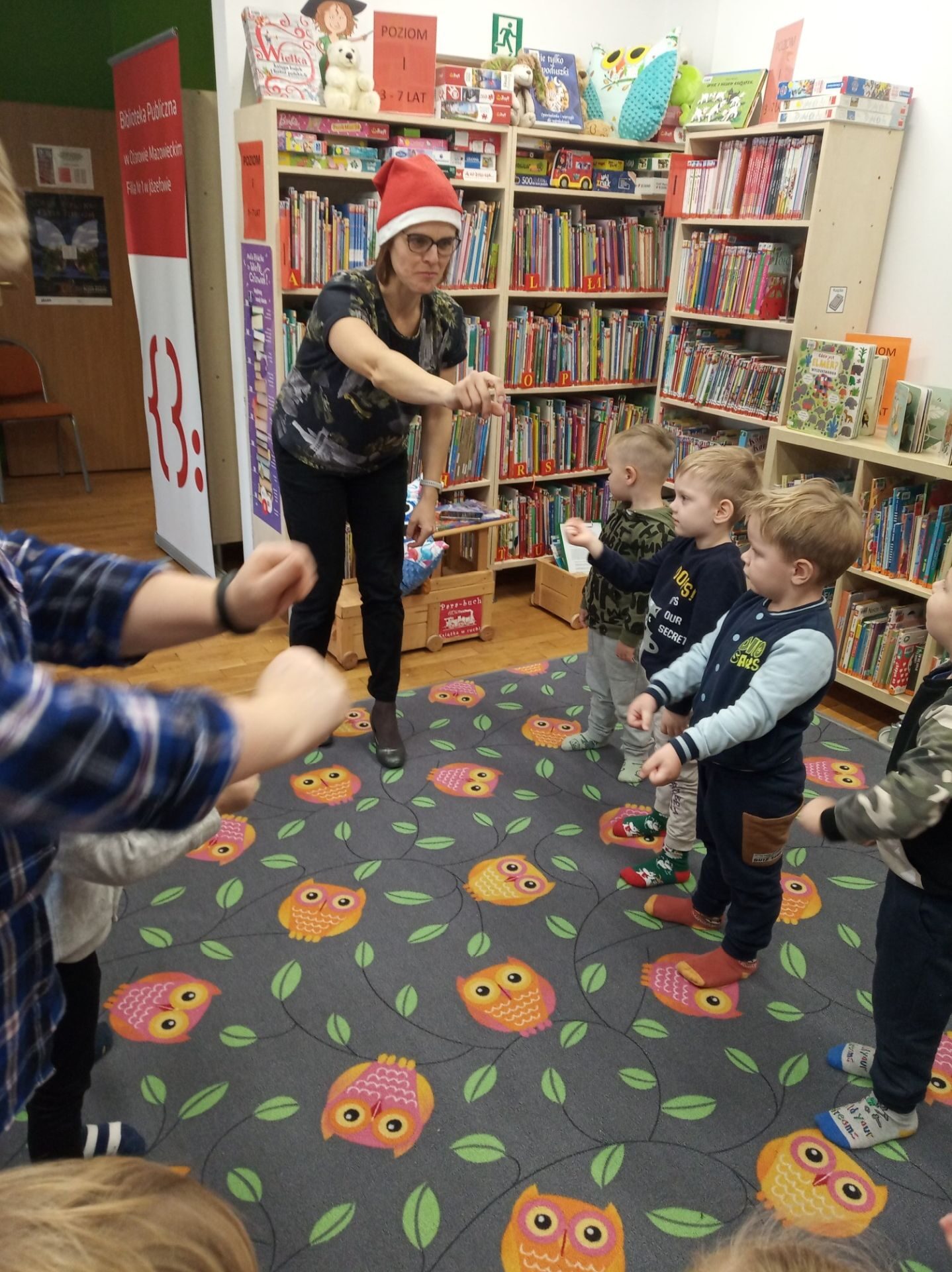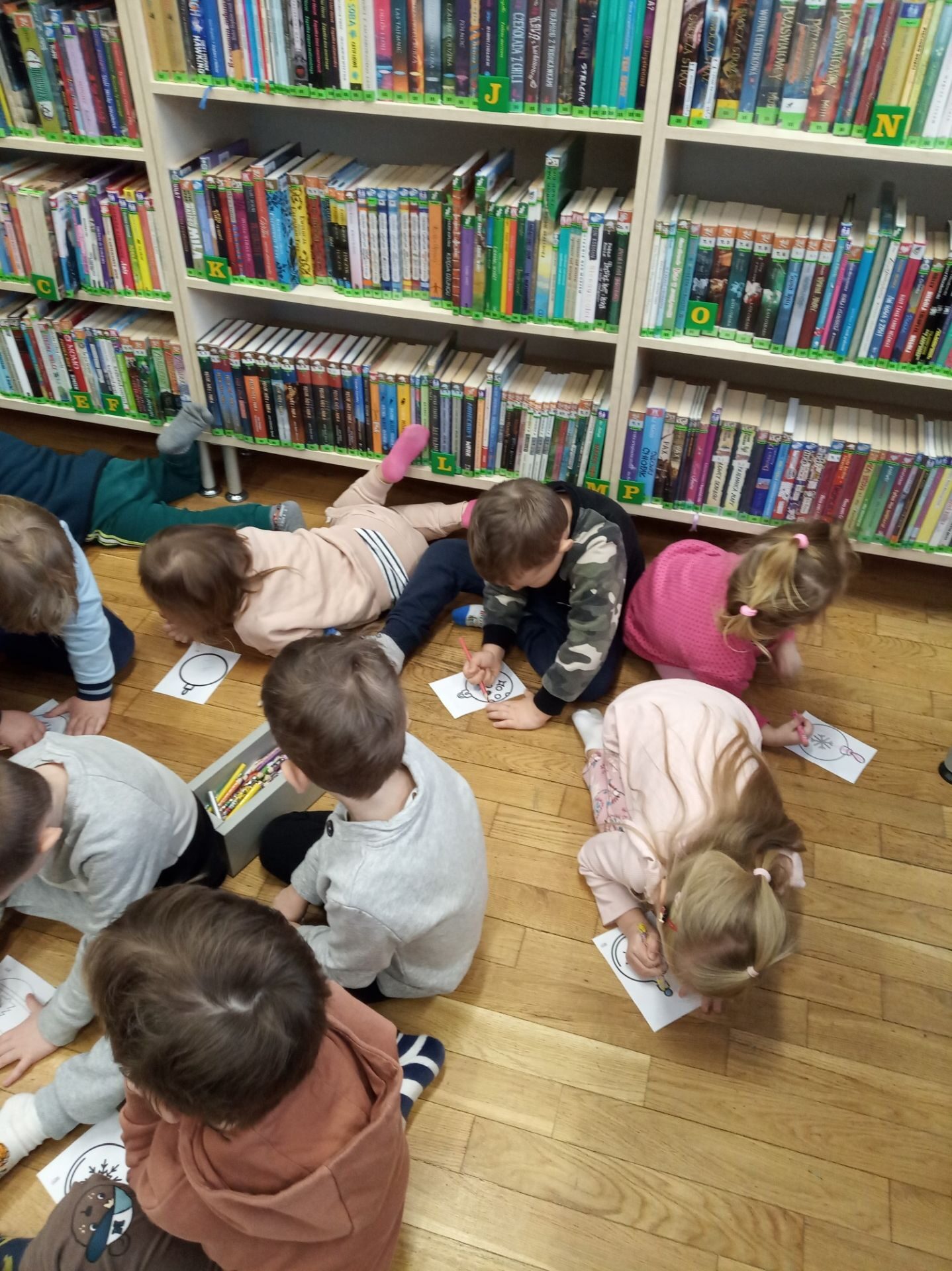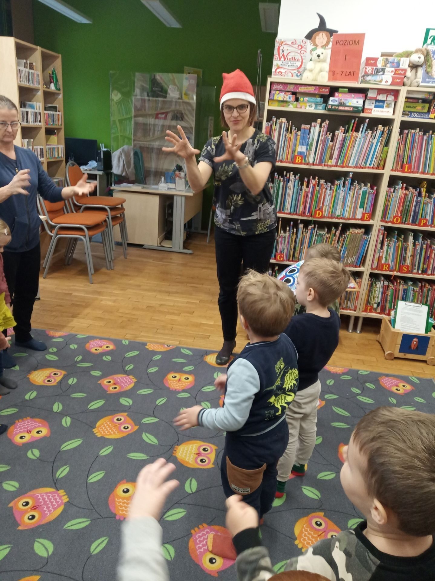 Dnia 8.12.2023r. dzieci z grupy „Kotki” uczestniczyły w zajęciach bibliotecznych poprowadzonych przez Panie z Biblioteki Publicznej w Józefowie. Tematem spotkania była postać, którą dzieci uwielbiają gdy zbliżają się Święta Bożego Narodzenia, a jest nią Święty Mikołaj. Przedszkolaki opisywały wygląd Mikołaja i czym On się zajmuje. Wysłuchały krótkich opowiadań z książki pt.” Boże Narodzenie”. Bawiły się w pieczenie pierniczków- ilustrowały gestem. Dopasowywały obrazki przedstawiające prezenty do odrysowanych kształtów, kolorowały bombki. Ponadto dzieci wręczyły Paniom bibliotekarkom własnoręcznie wykonaną kartę świąteczną. Na zakończenie zajęć przedszkolaki otrzymały słodki upominek w postaci cukierków.