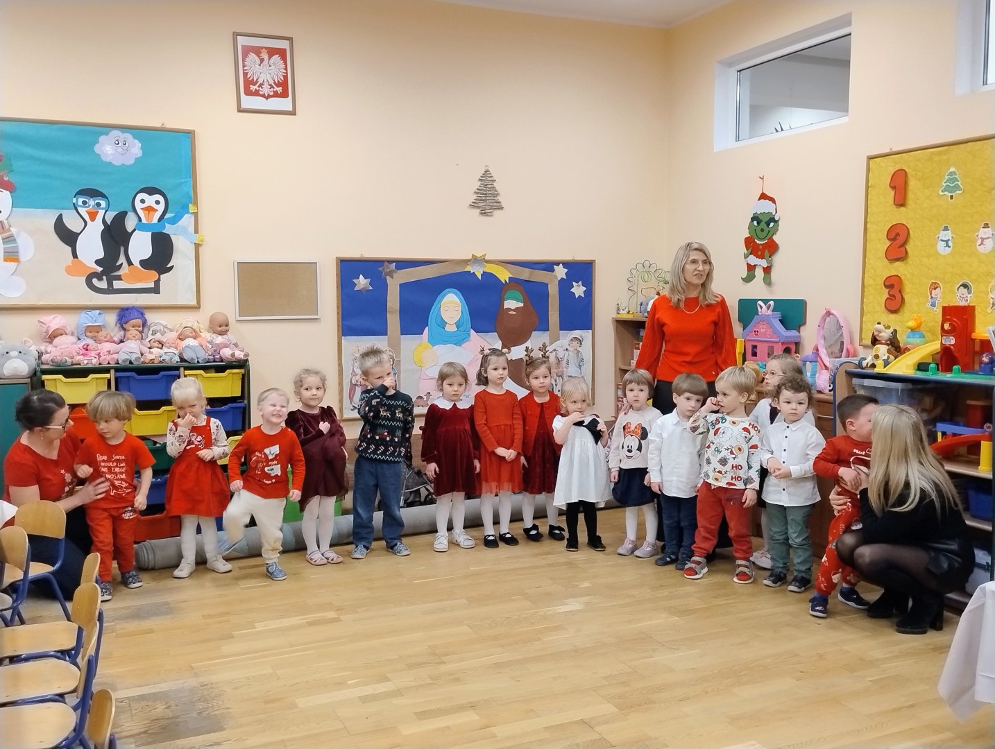 Dnia 17.12.2025r. w grupie “Kotki” odbyło się spotkanie świąteczne połączone z warsztatami. Na początku wychowawczyni przywitała zebranych gości i zapoznała z programem uroczystości. Dzieci zaśpiewały kolędy: “Przybieżeli do Betlejem”, “Gore gwiazda” a następnie zaprezentowały układ taneczny do kolędy “Magicznych tych świąt”.