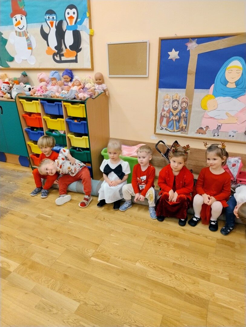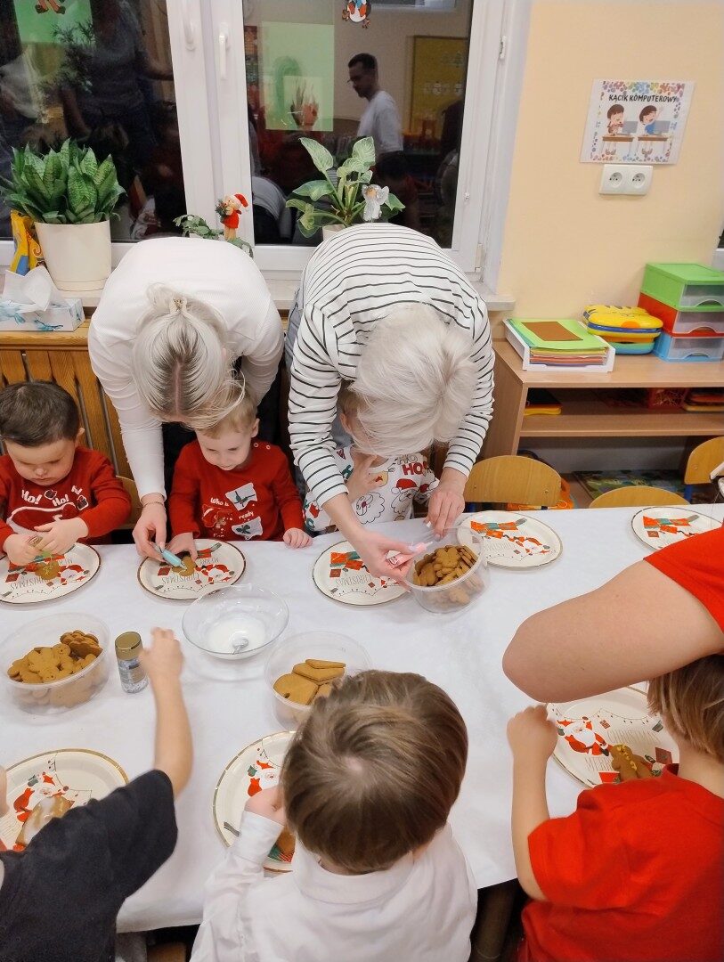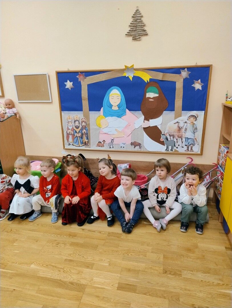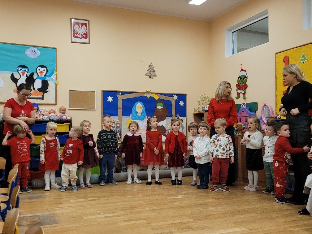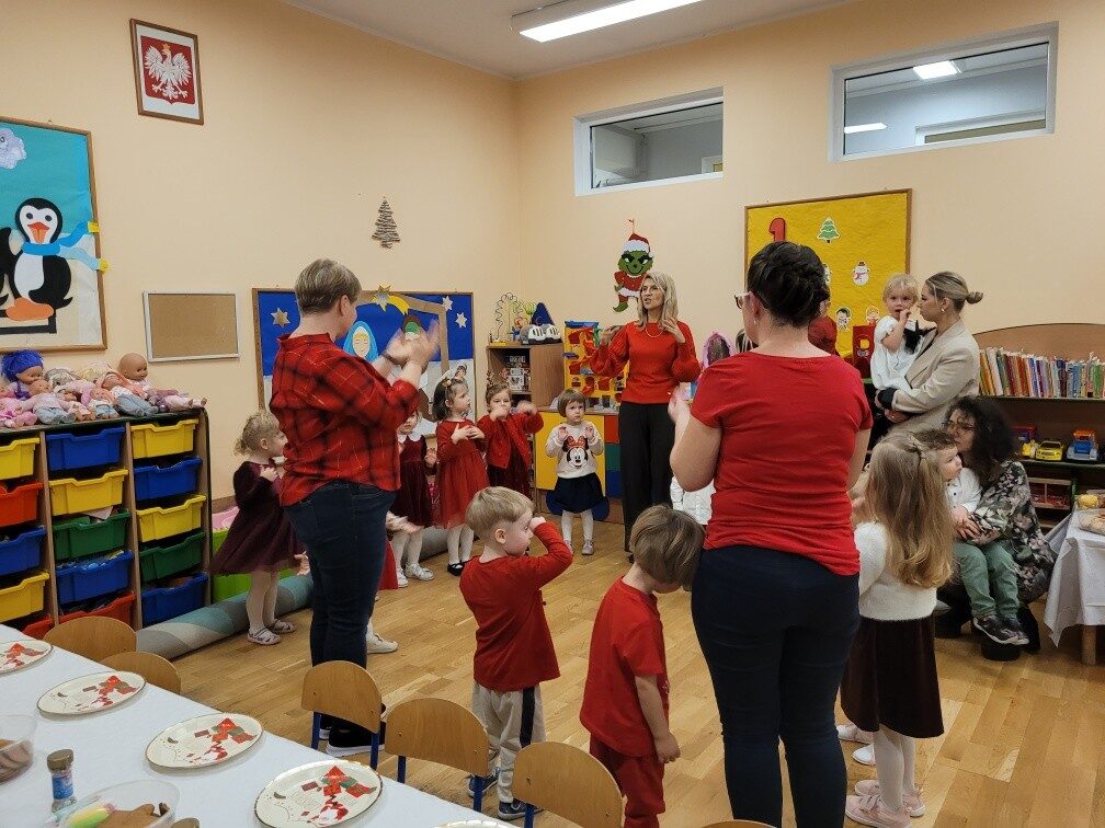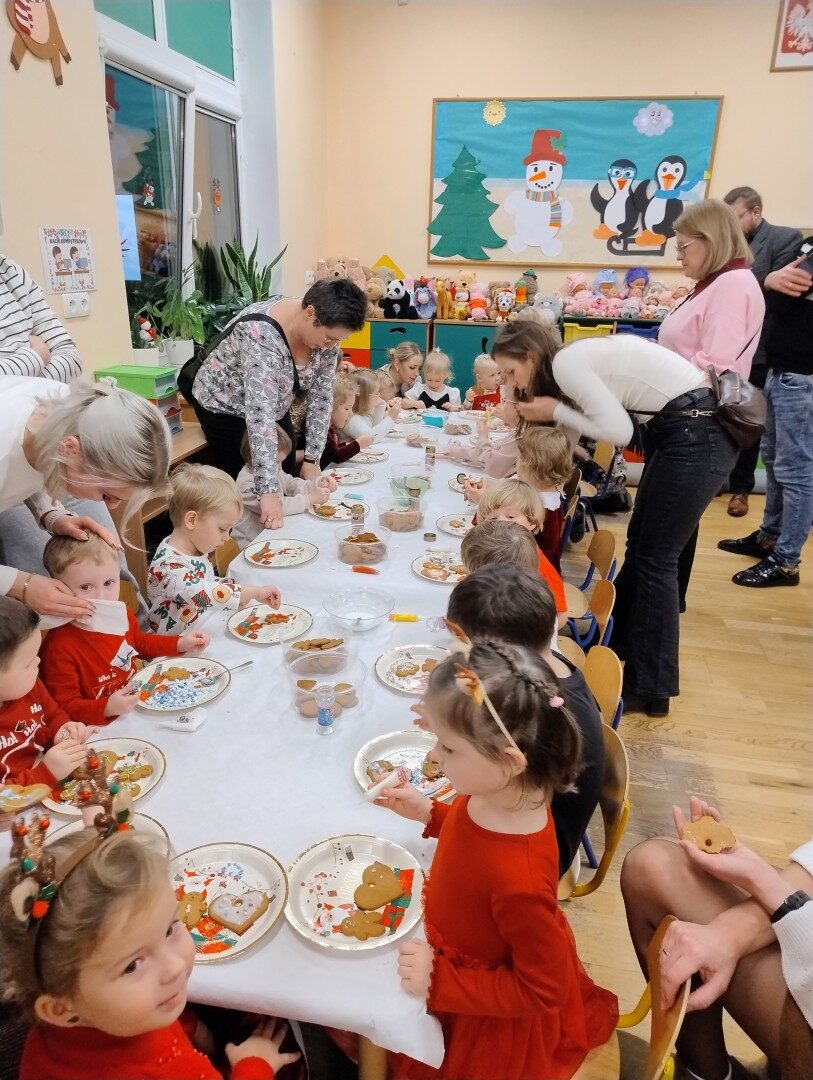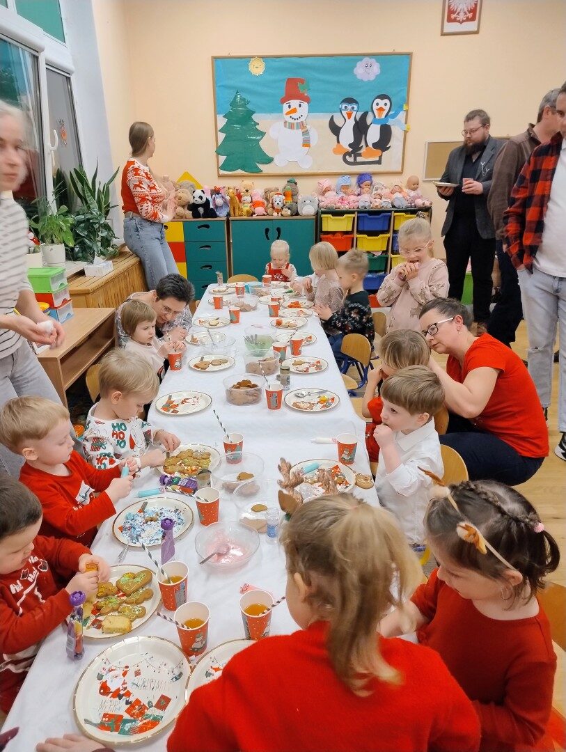 Dnia 17.12.2025r. w grupie “Kotki” odbyło się spotkanie świąteczne połączone z warsztatami. Na początku wychowawczyni przywitała zebranych gości i zapoznała z programem uroczystości. Dzieci zaśpiewały kolędy: “Przybieżeli do Betlejem”, “Gore gwiazda” a następnie zaprezentowały układ taneczny do kolędy “Magicznych tych świąt”.