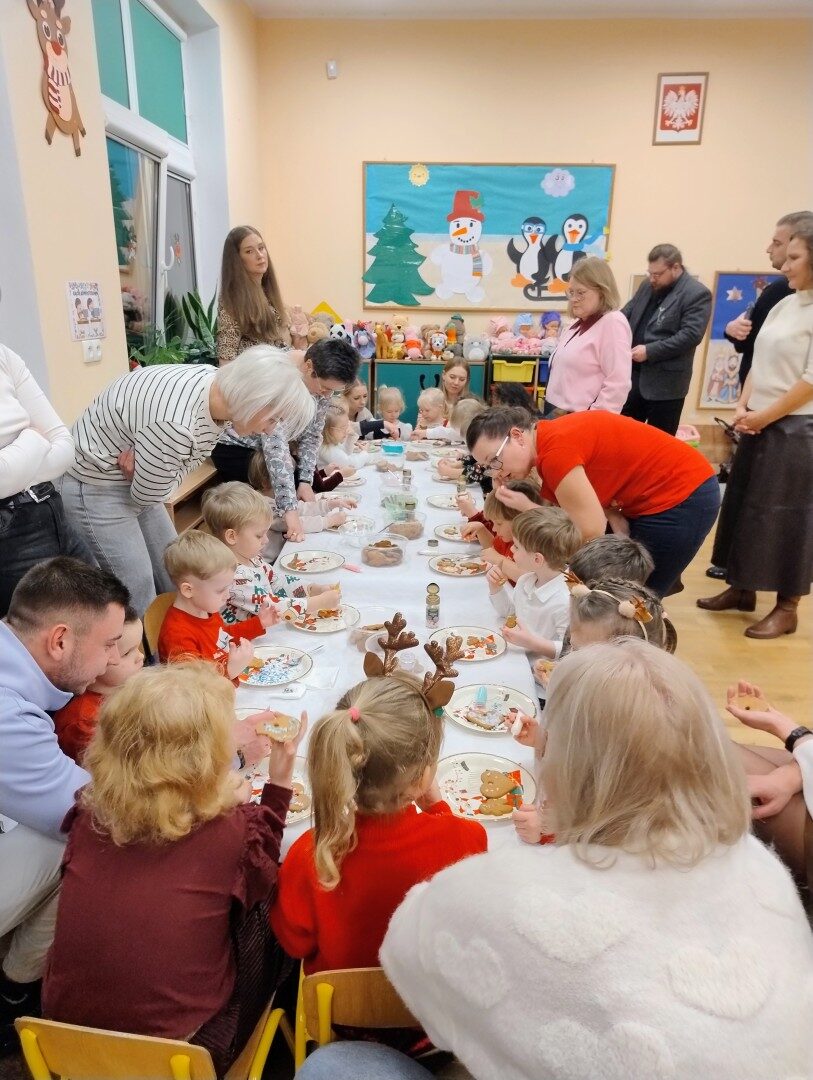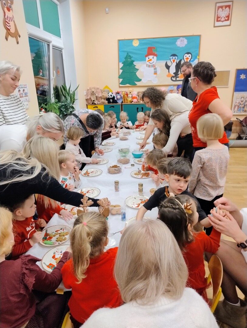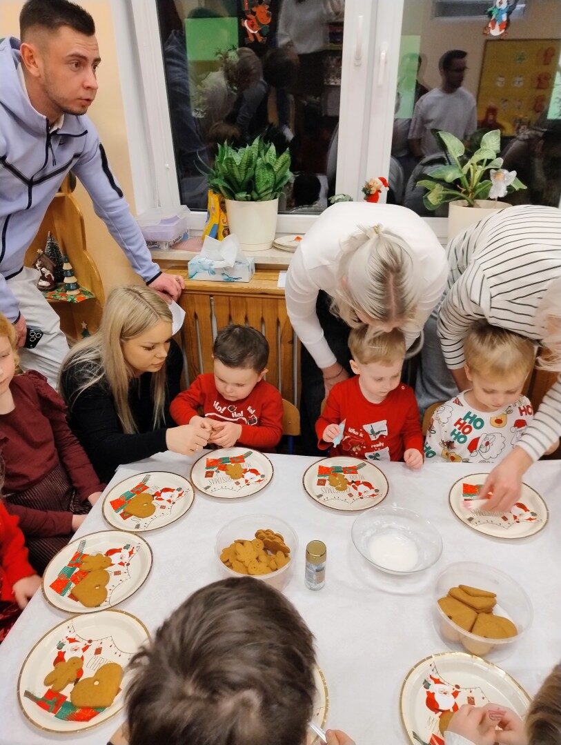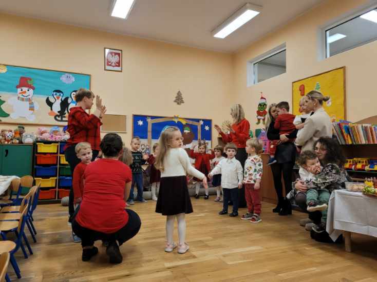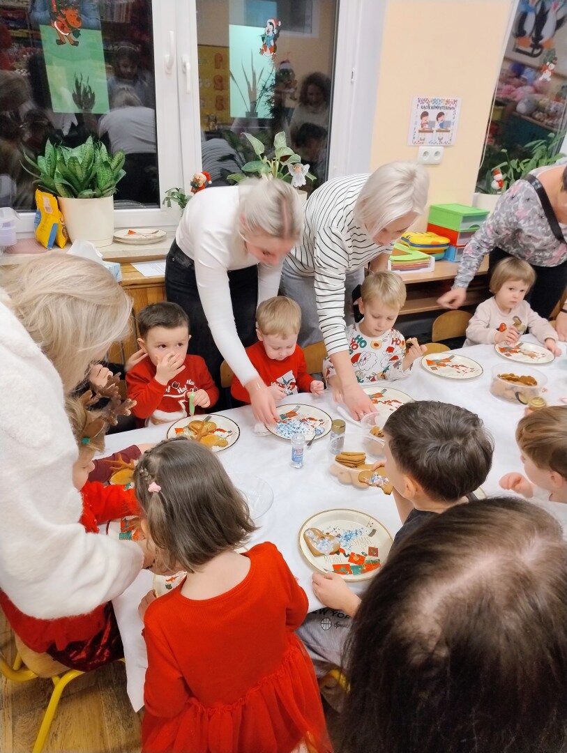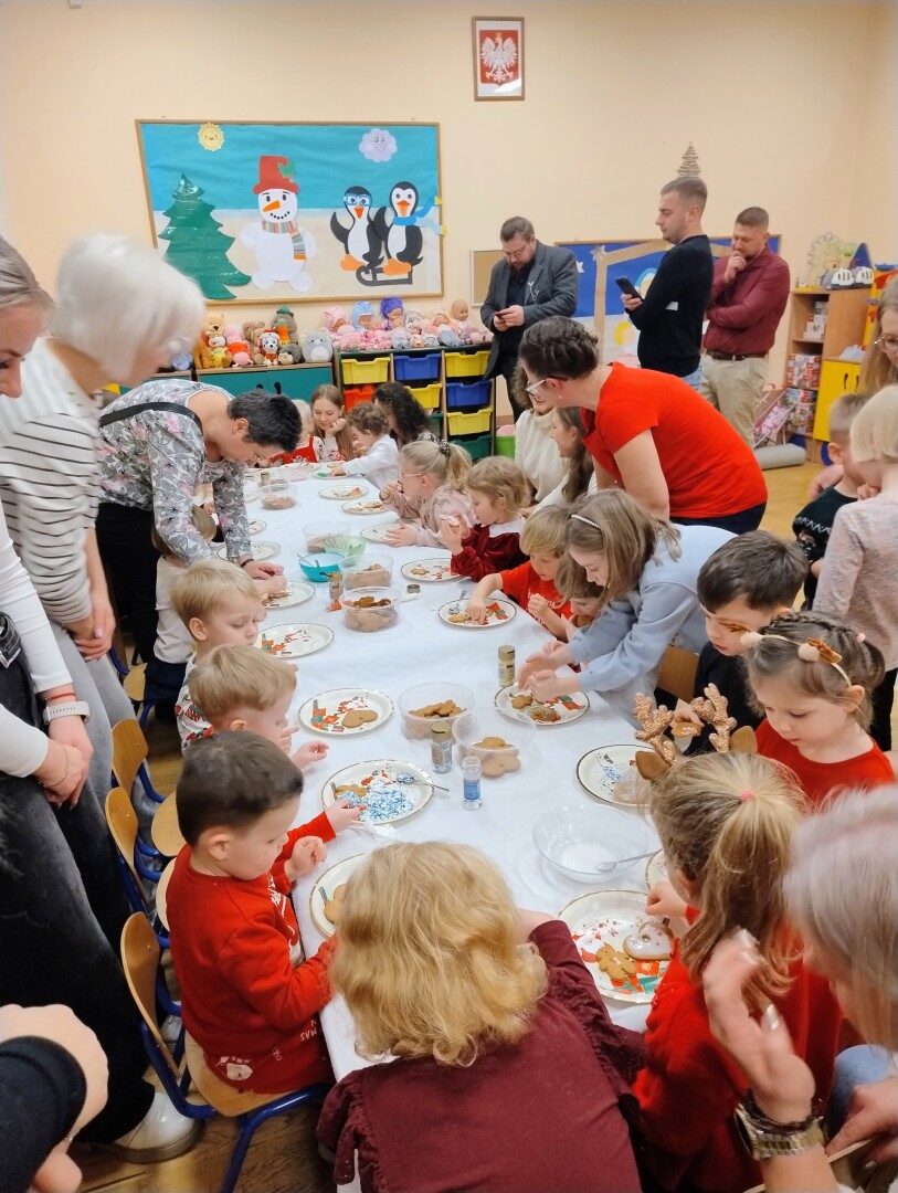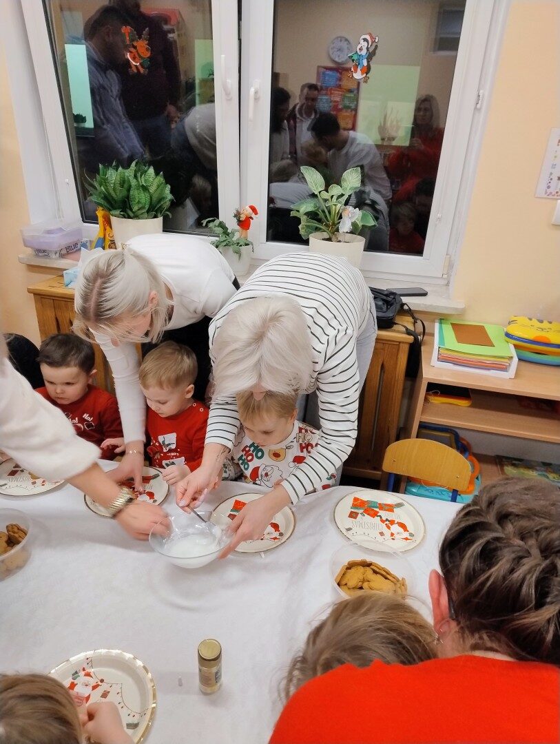 Dnia 17.12.2025r. w grupie “Kotki” odbyło się spotkanie świąteczne połączone z warsztatami. Na początku wychowawczyni przywitała zebranych gości i zapoznała z programem uroczystości. Dzieci zaśpiewały kolędy: “Przybieżeli do Betlejem”, “Gore gwiazda” a następnie zaprezentowały układ taneczny do kolędy “Magicznych tych świąt”.