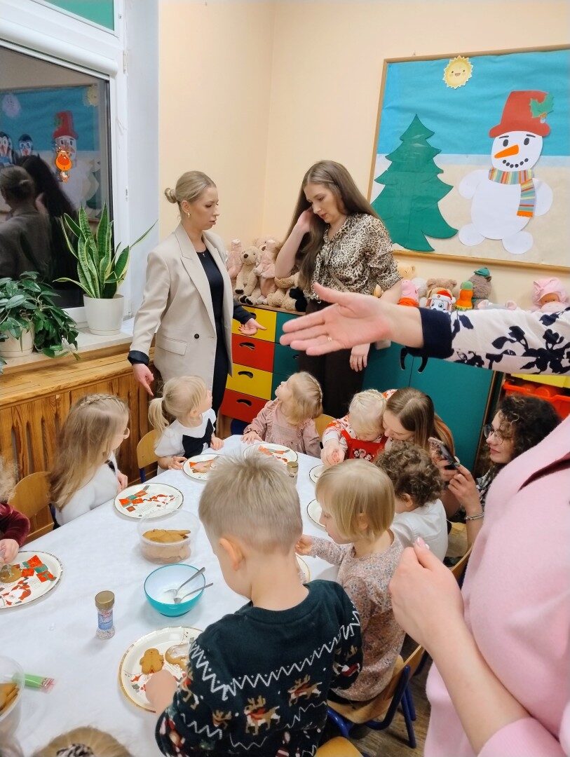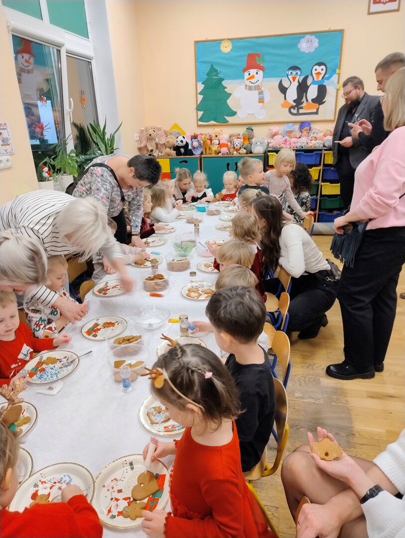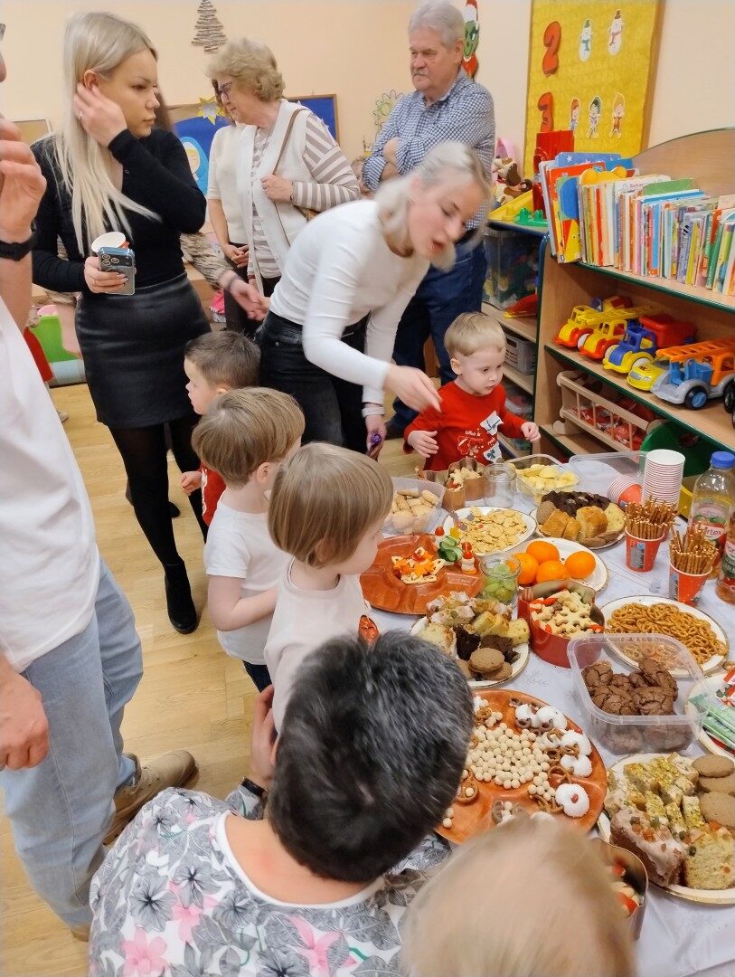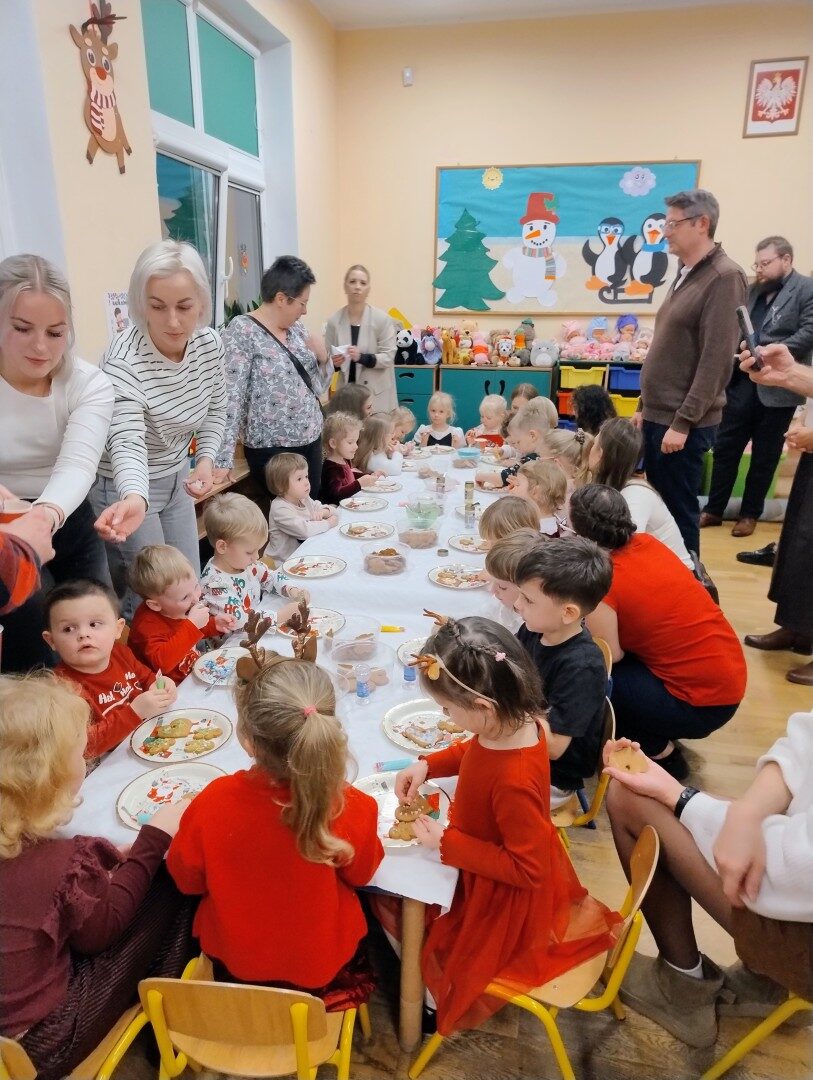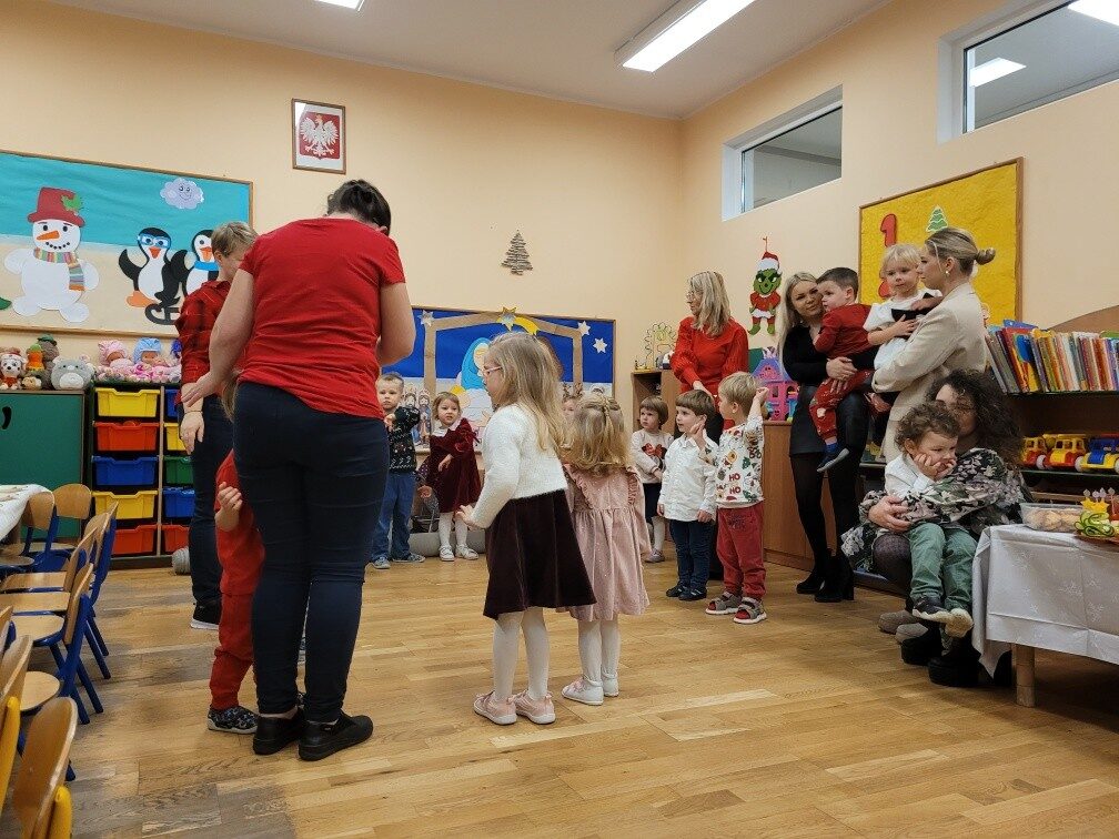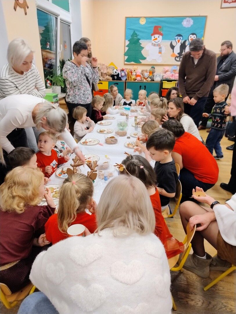 Dnia 17.12.2025r. w grupie “Kotki” odbyło się spotkanie świąteczne połączone z warsztatami. Na początku wychowawczyni przywitała zebranych gości i zapoznała z programem uroczystości. Dzieci zaśpiewały kolędy: “Przybieżeli do Betlejem”, “Gore gwiazda” a następnie zaprezentowały układ taneczny do kolędy “Magicznych tych świąt”.