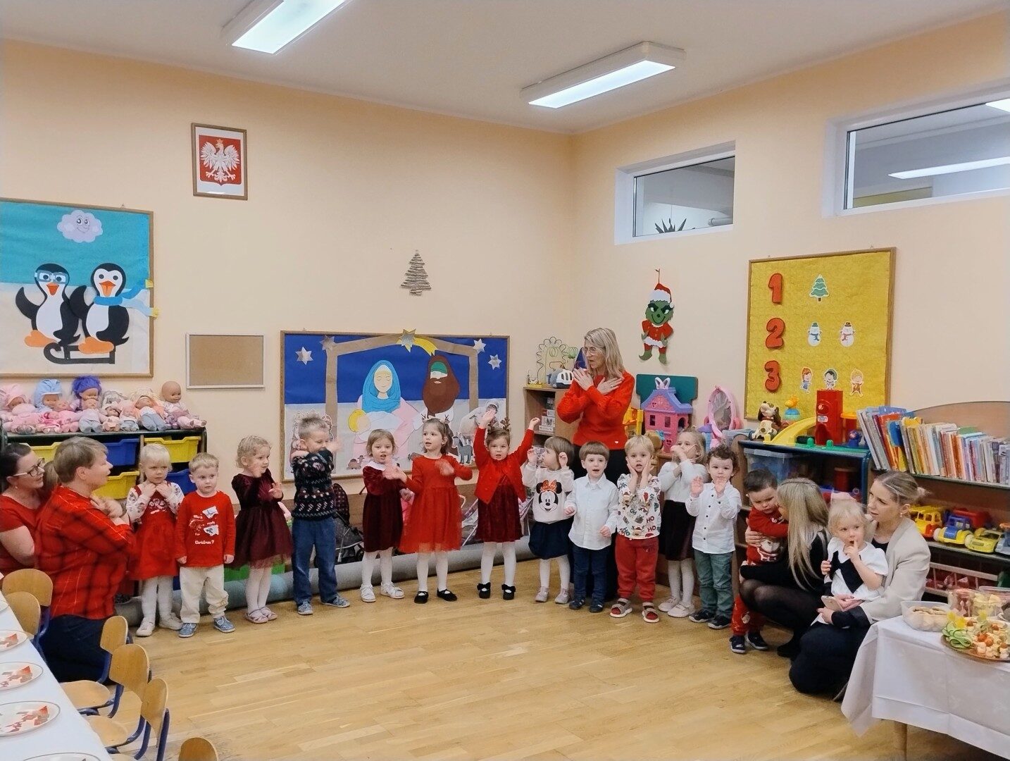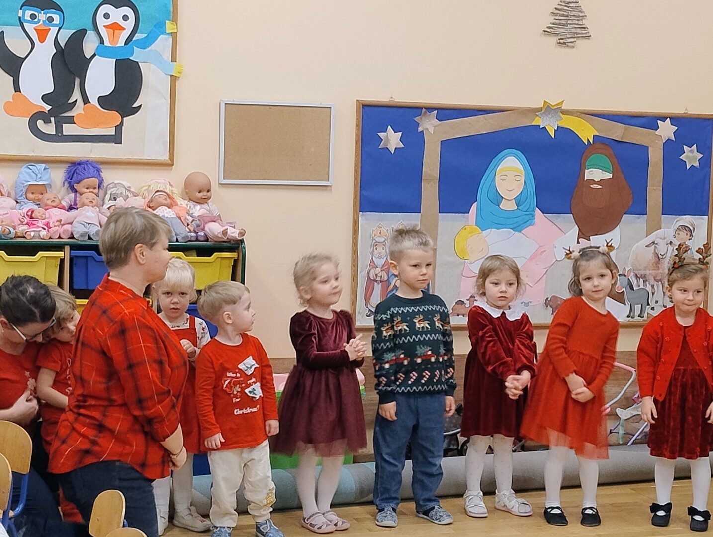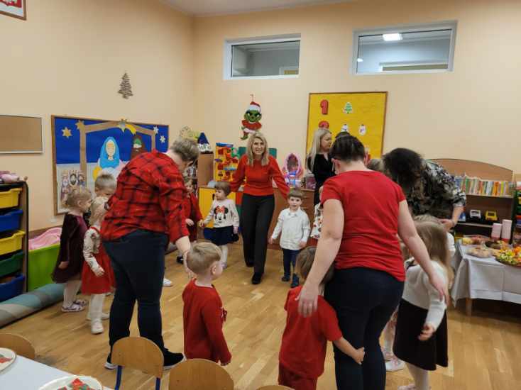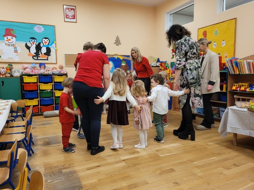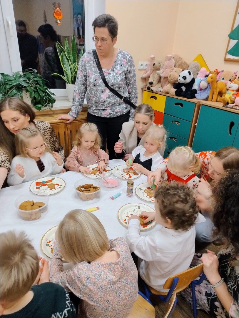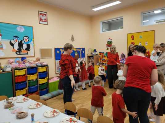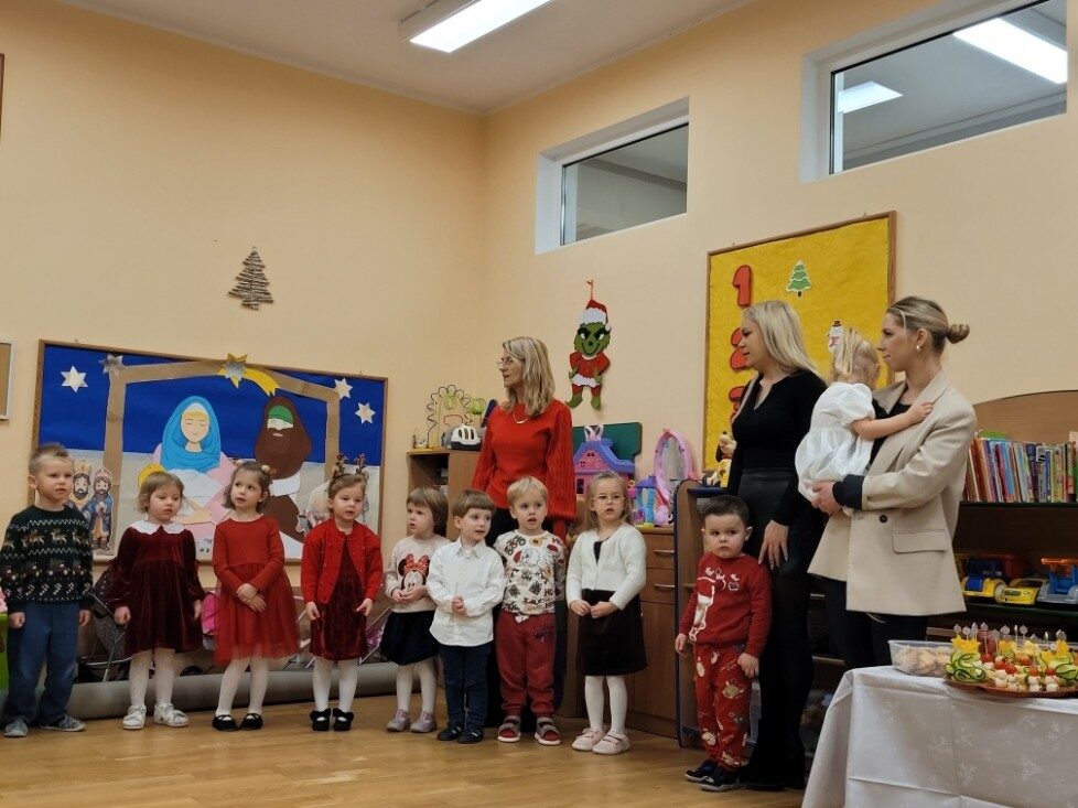 Dnia 17.12.2025r. w grupie “Kotki” odbyło się spotkanie świąteczne połączone z warsztatami. Na początku wychowawczyni przywitała zebranych gości i zapoznała z programem uroczystości. Dzieci zaśpiewały kolędy: “Przybieżeli do Betlejem”, “Gore gwiazda” a następnie zaprezentowały układ taneczny do kolędy “Magicznych tych świąt”.