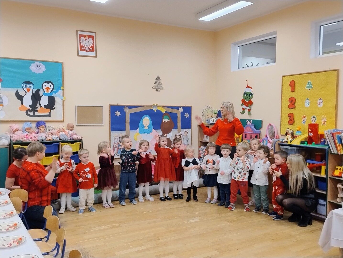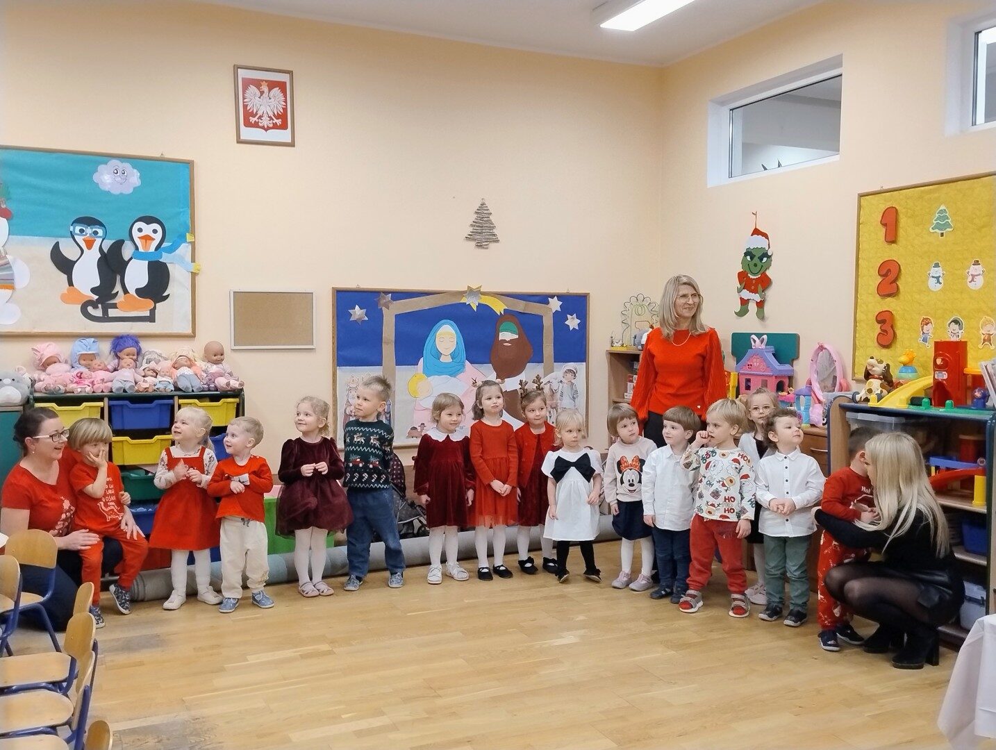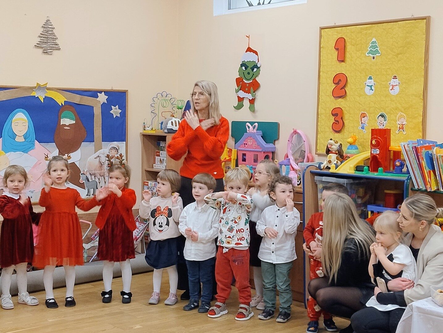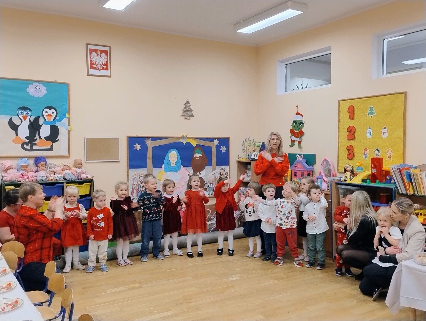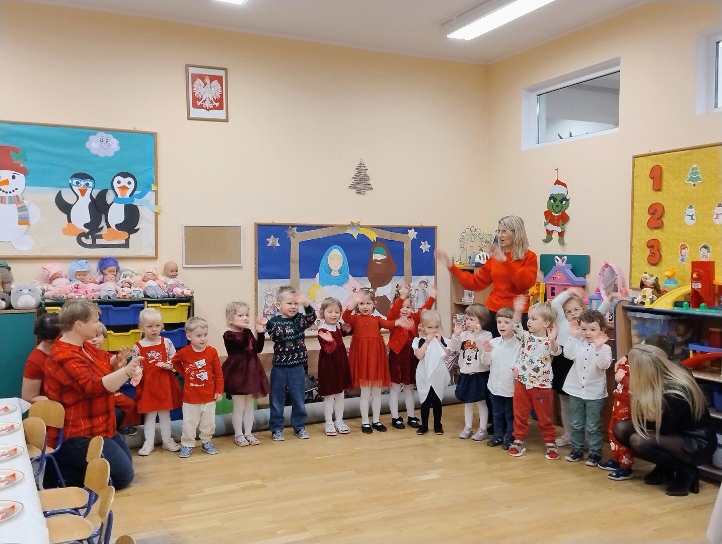 Dnia 17.12.2025r. w grupie “Kotki” odbyło się spotkanie świąteczne połączone z warsztatami. Na początku wychowawczyni przywitała zebranych gości i zapoznała z programem uroczystości. Dzieci zaśpiewały kolędy: “Przybieżeli do Betlejem”, “Gore gwiazda” a następnie zaprezentowały układ taneczny do kolędy “Magicznych tych świąt”.