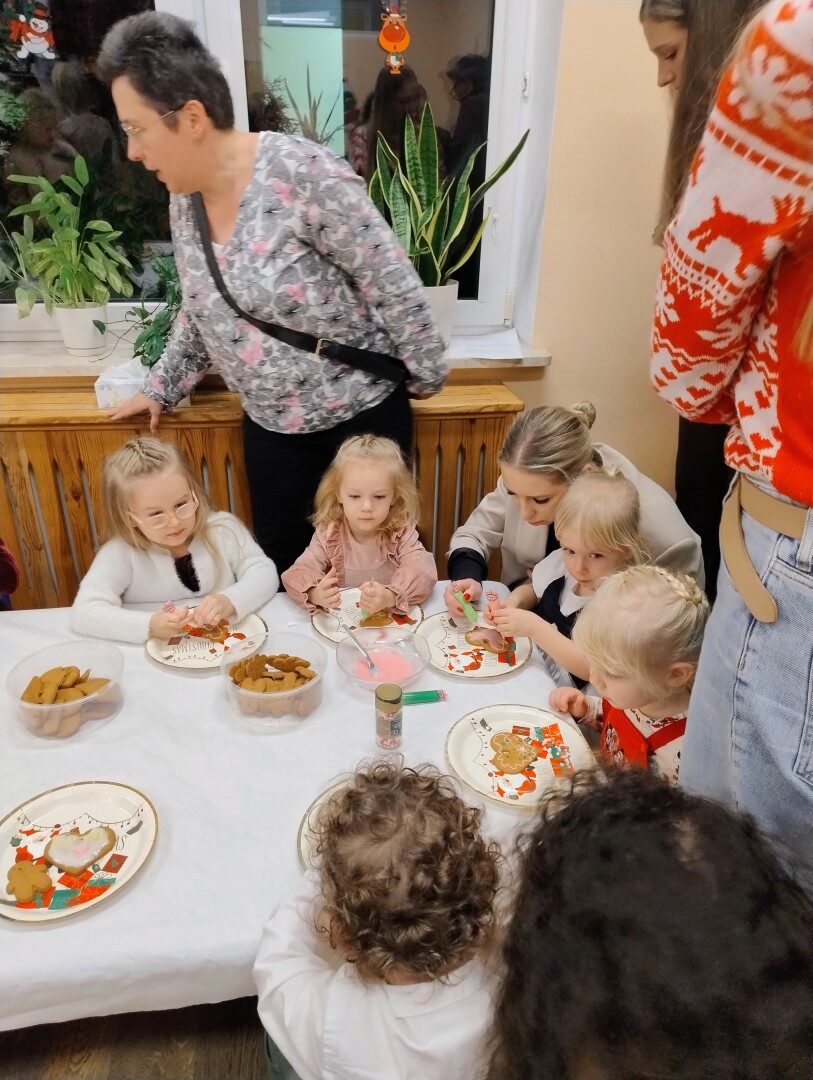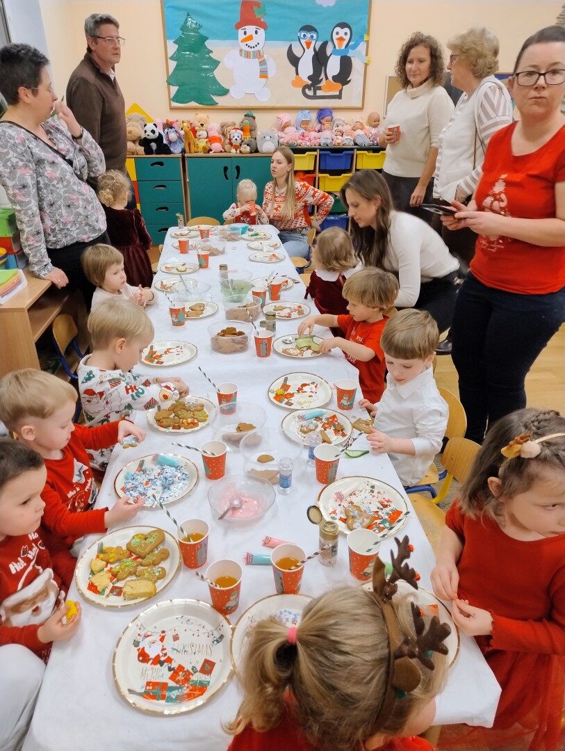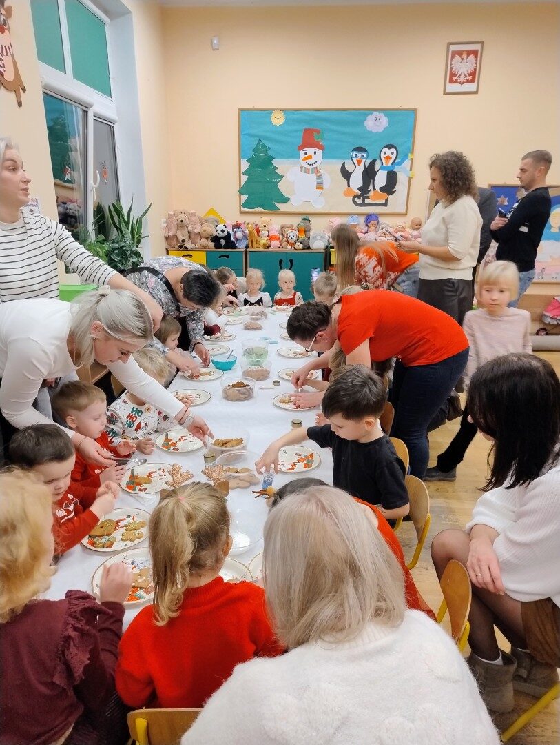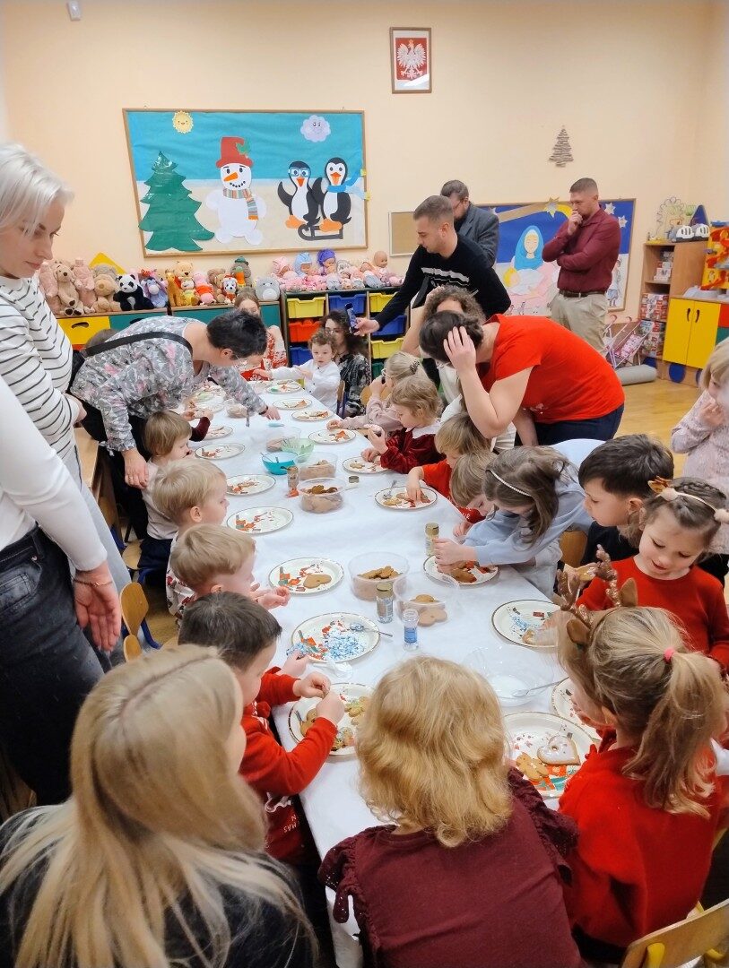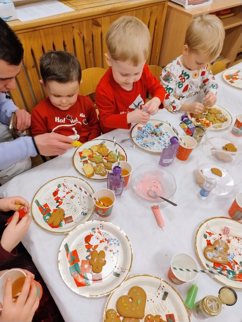 Po części artystycznej przedszkolaki zaczęły ozdabiać pierniki lukrem, kolorowymi pisakami i posypką cukrową. Z wielkim zaangażowaniem, każdy chciał jak najładniej ozdobić swoje ciasteczko. Dzieciom udzieliła się świąteczna i radosna atmosfera. Rodzice przygotowali słodki poczęstunek, na który składały się owoce, napoje, ciasta i ciasteczka.