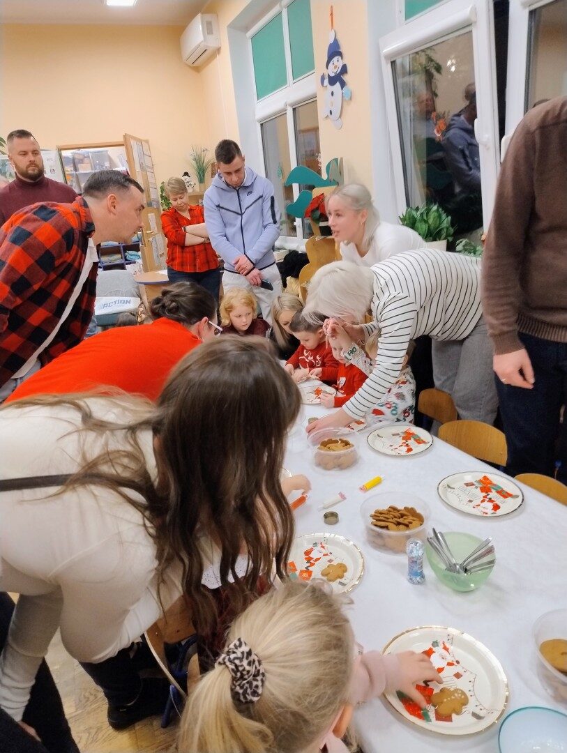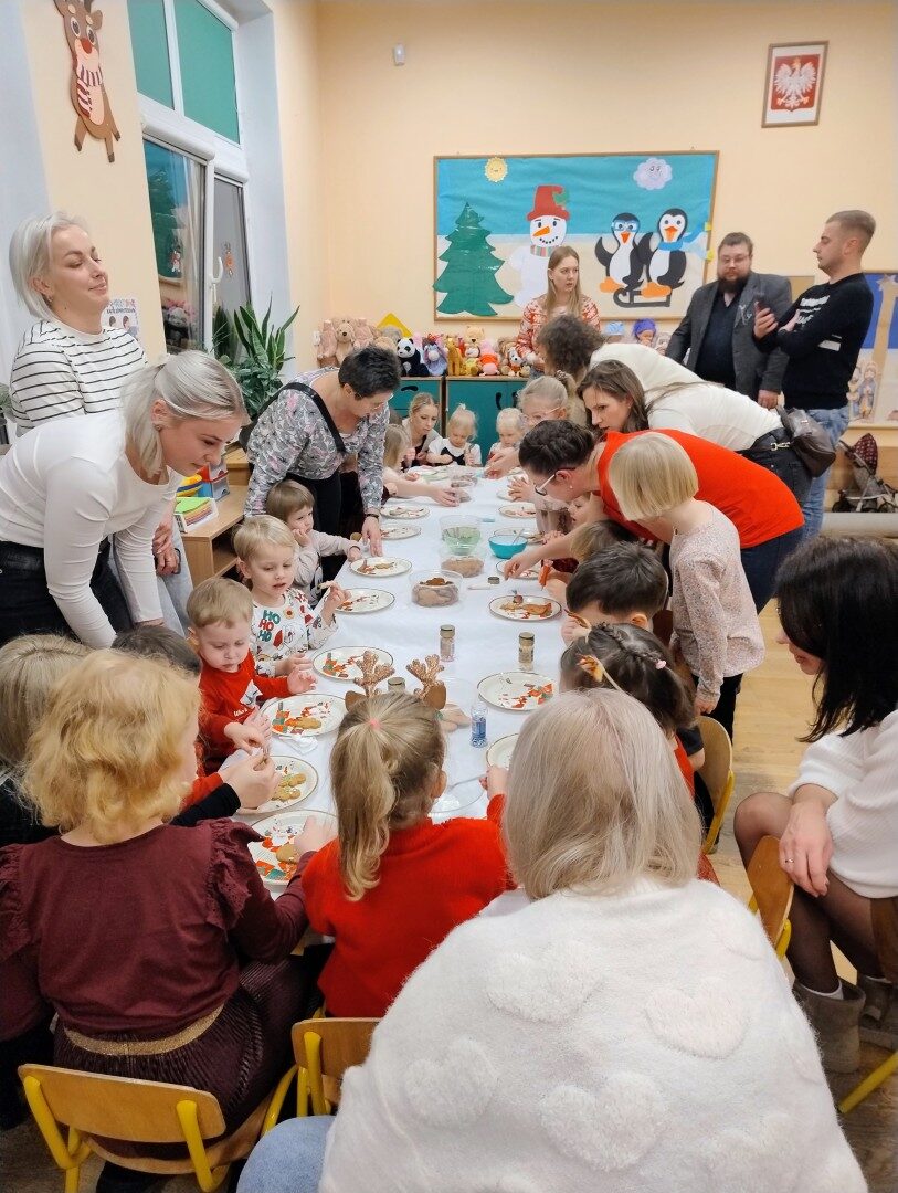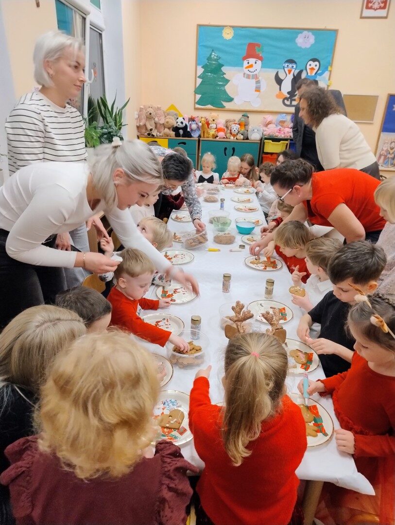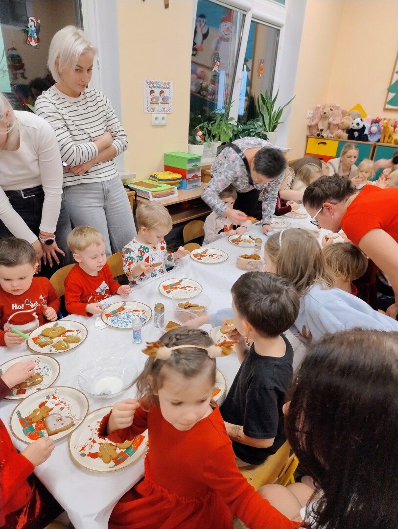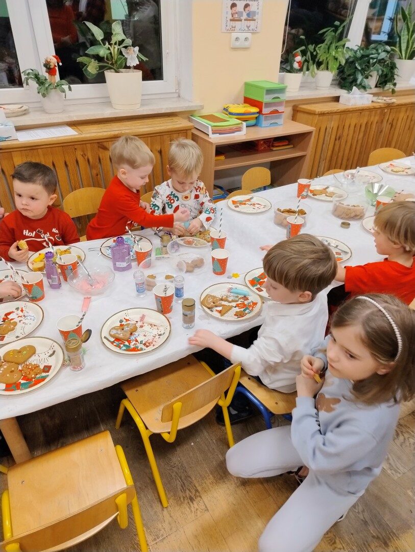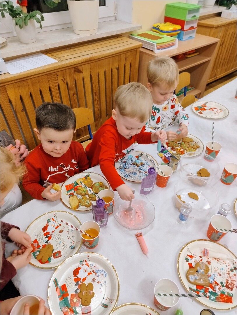 Po części artystycznej przedszkolaki zaczęły ozdabiać pierniki lukrem, kolorowymi pisakami i posypką cukrową. Z wielkim zaangażowaniem, każdy chciał jak najładniej ozdobić swoje ciasteczko. Dzieciom udzieliła się świąteczna i radosna atmosfera. Rodzice przygotowali słodki poczęstunek, na który składały się owoce, napoje, ciasta i ciasteczka.