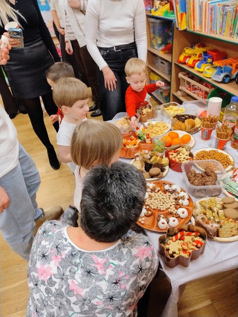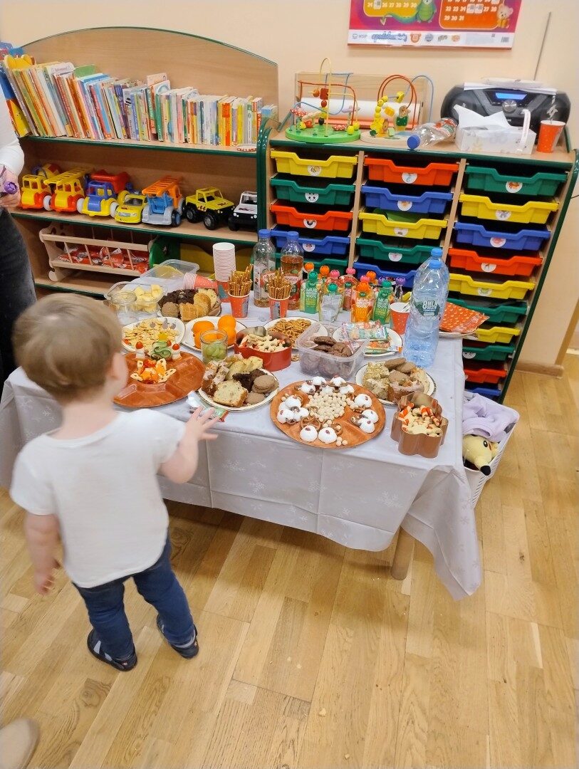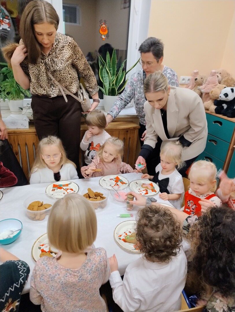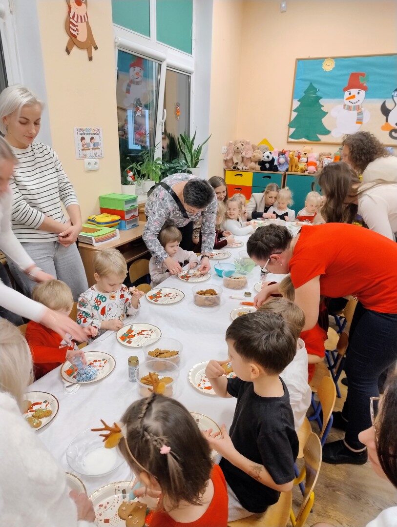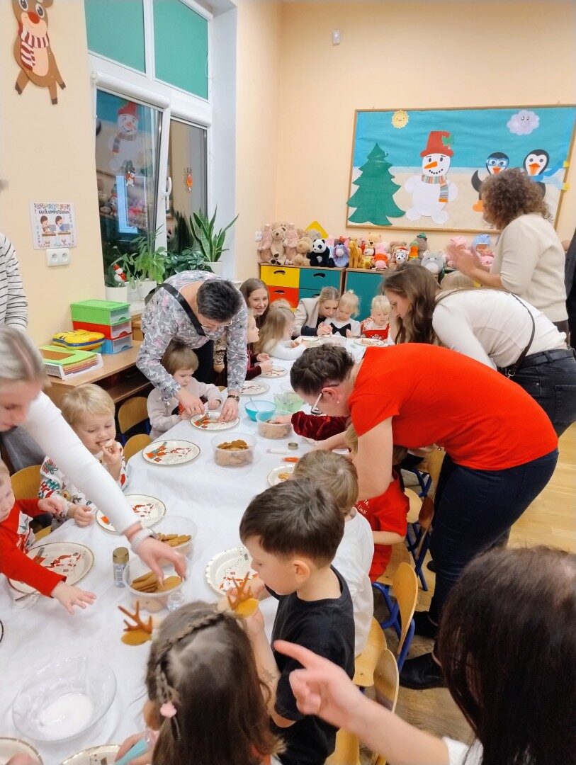 Po części artystycznej przedszkolaki zaczęły ozdabiać pierniki lukrem, kolorowymi pisakami i posypką cukrową. Z wielkim zaangażowaniem, każdy chciał jak najładniej ozdobić swoje ciasteczko. Dzieciom udzieliła się świąteczna i radosna atmosfera. Rodzice przygotowali słodki poczęstunek, na który składały się owoce, napoje, ciasta i ciasteczka.