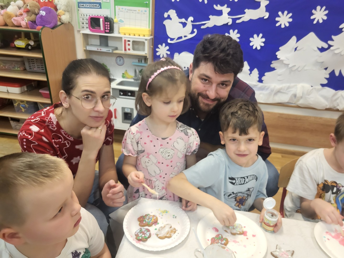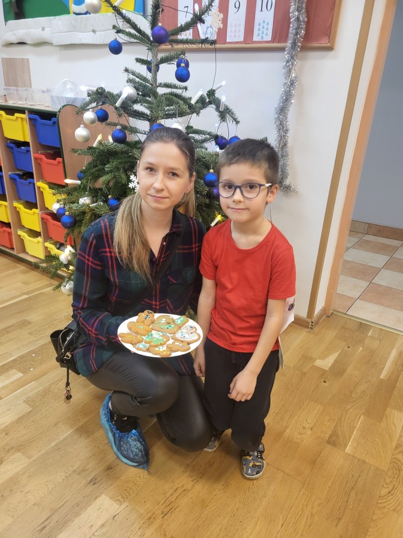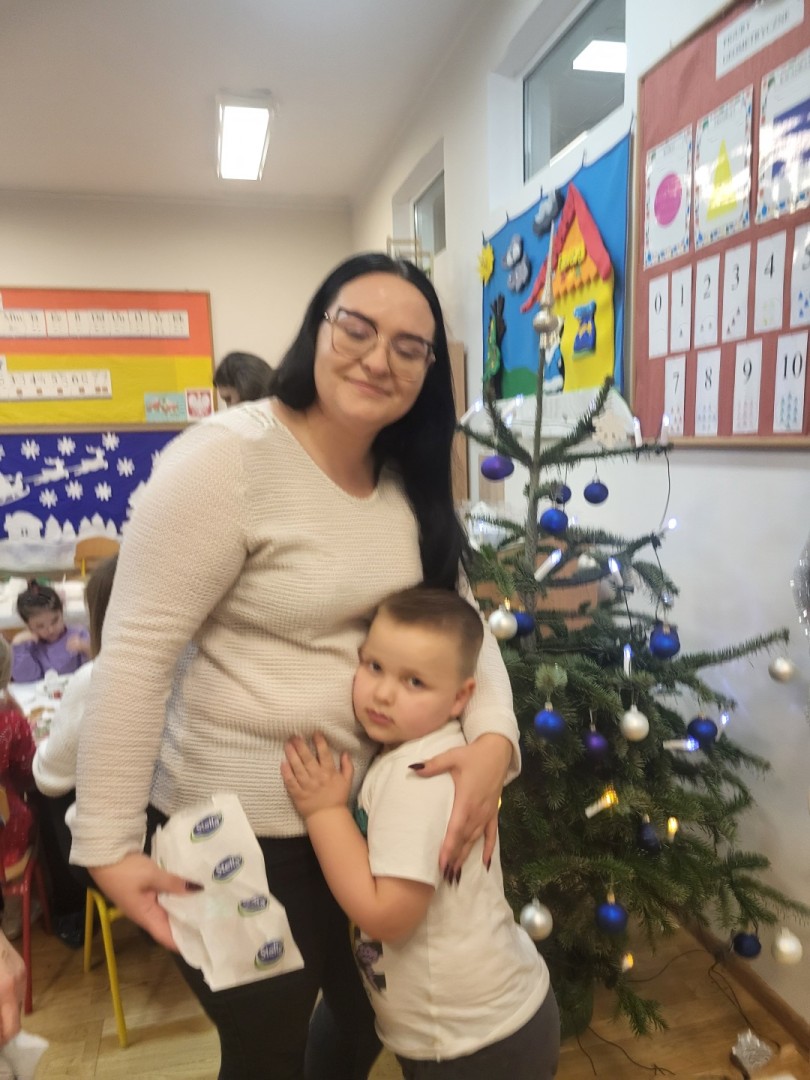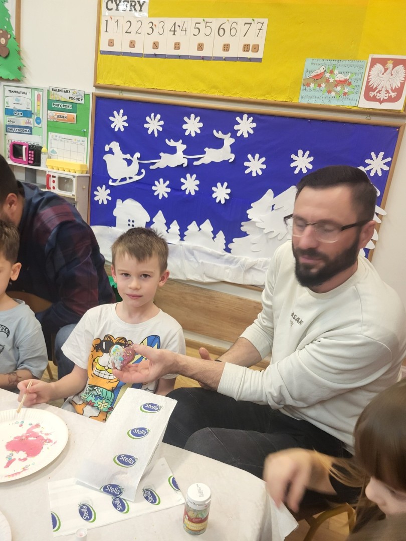 Całe spotkanie odbywało się w ciepłej, rodzinnej atmosferze, przy dźwiękach nastrojowej muzyki świątecznej. Rodzice chętnie angażowali się w działania, a dzieci z dużą radością prezentowały efekty swojej pracy.