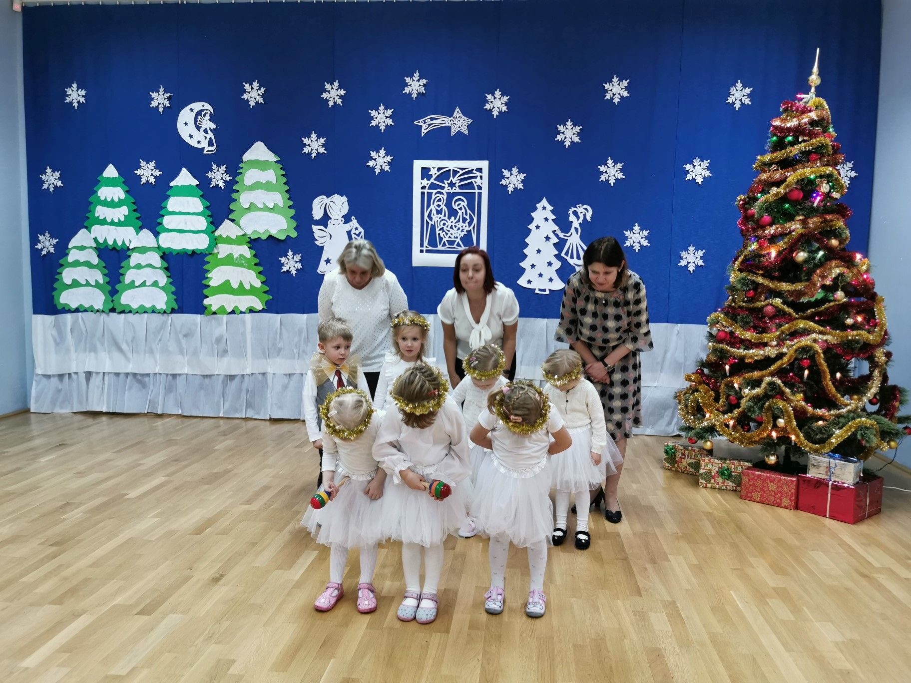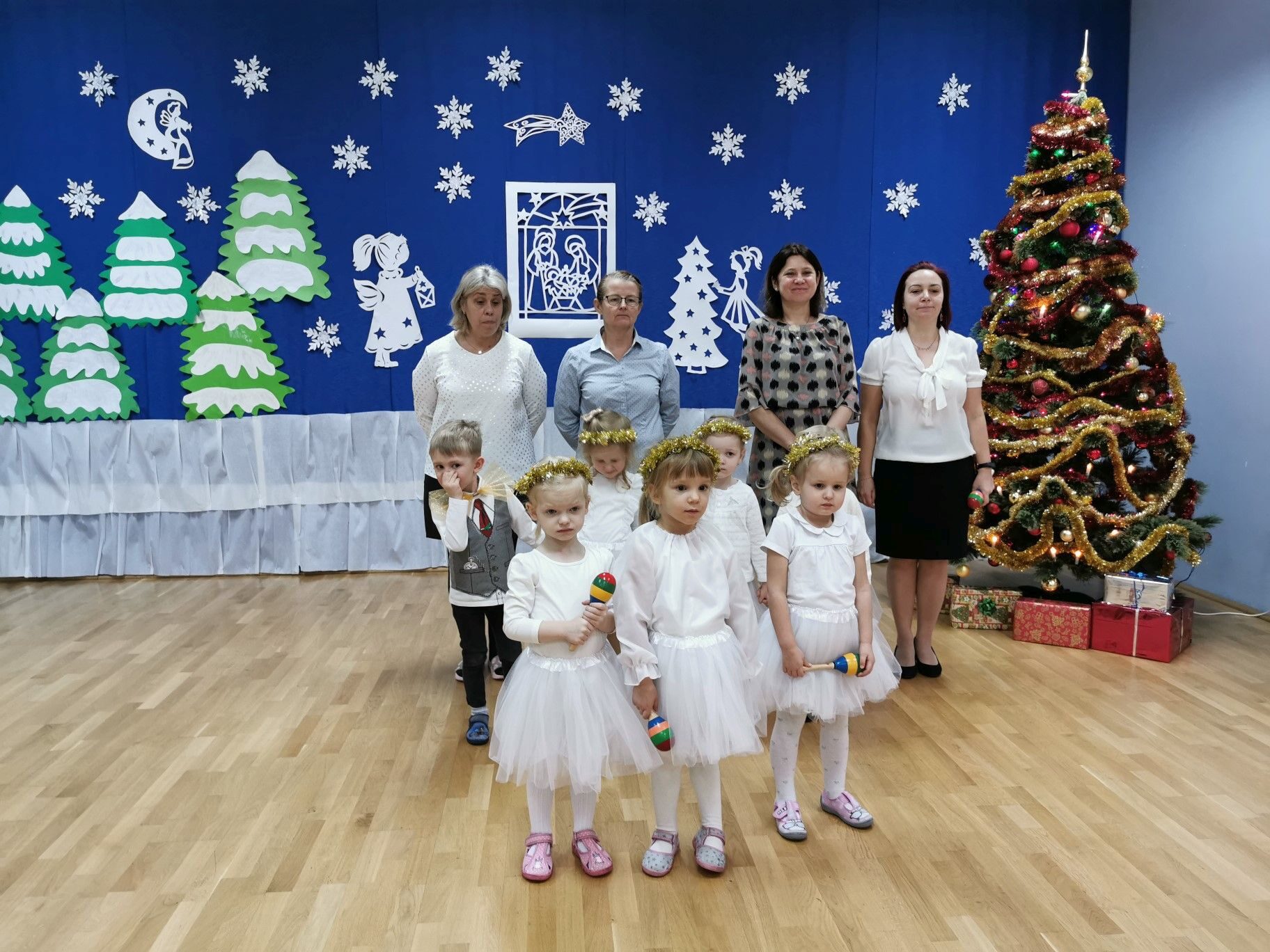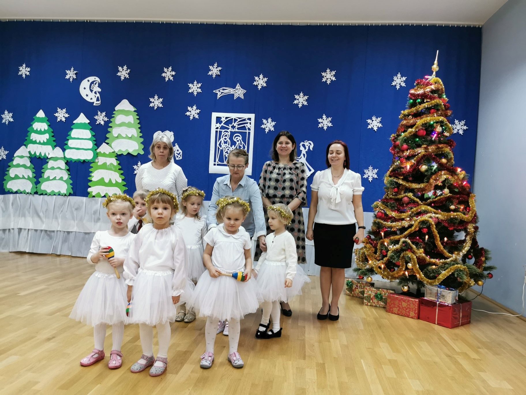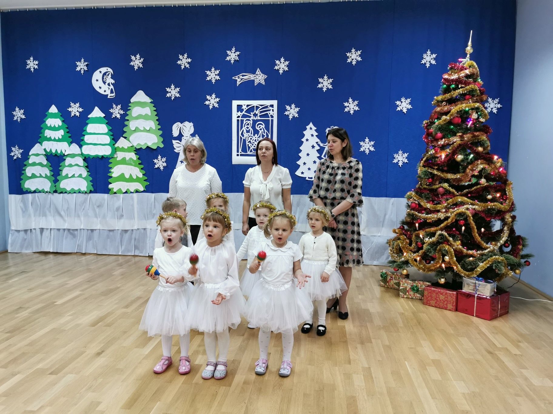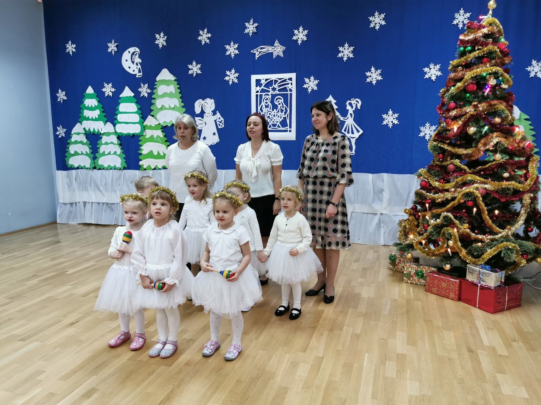 Dnia 16. 12. 2021r. w naszym przedszkolu odbyła się uroczystość związana z obchodzeniem Świąt Bożego Narodzenia. Przedszkolaki w strojach galowych wzięły udział w “Koncercie Kolęd”. Dzieci śpiewały piękne polskie kolędy i pastorałki. Temu wydarzeniu towarzyszyła miła świąteczna atmosfera. Po części artystycznej w swoich salach wysłuchały fragmentu Pisma Świętego o Narodzeniu Pana Jezusa. Ponadto rozdano dzieciom opłatek, złożono im świąteczne życzenia i zaproszono na Wigilijny poczęstunek przygotowany przez rodziców, za który serdecznie rodzicom dziękujemy.