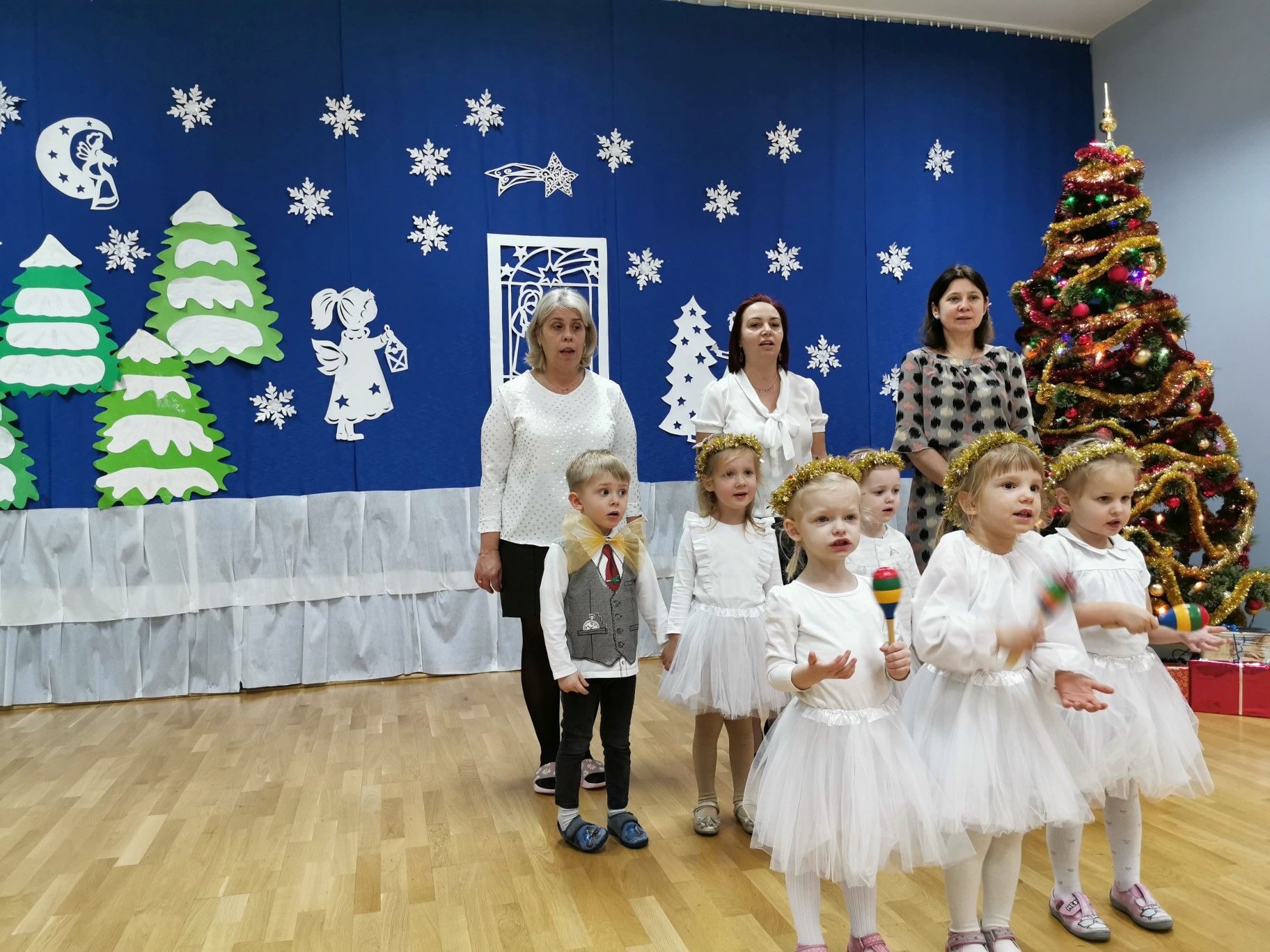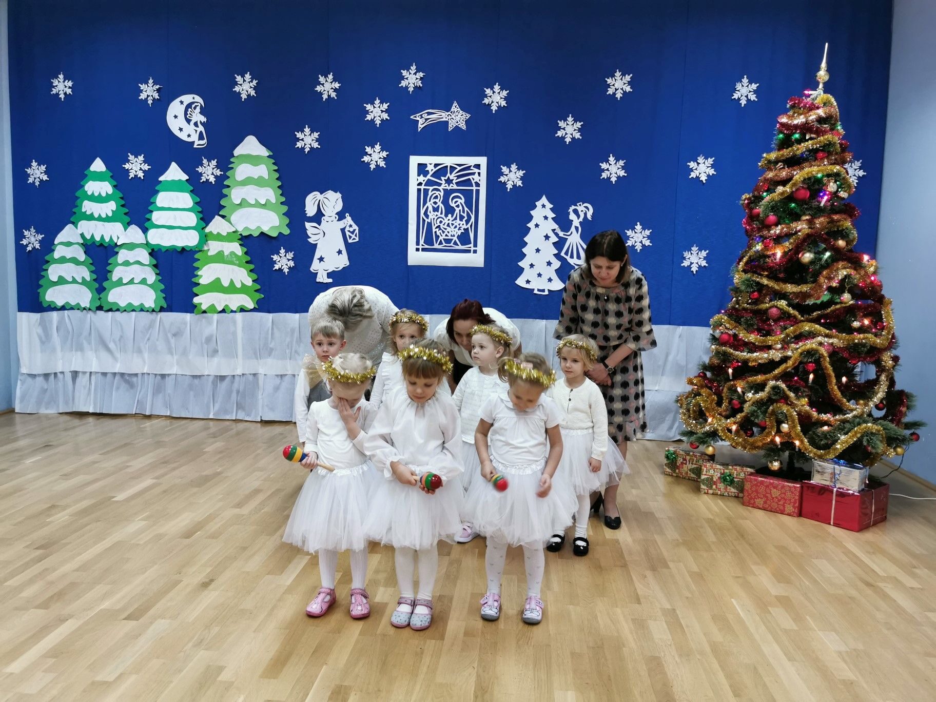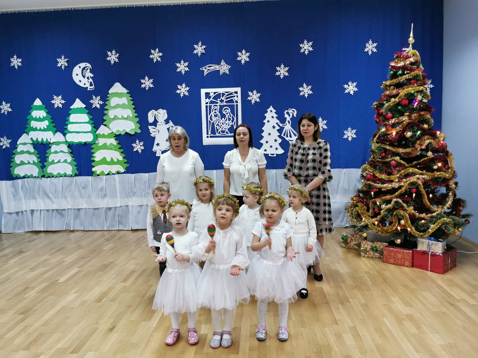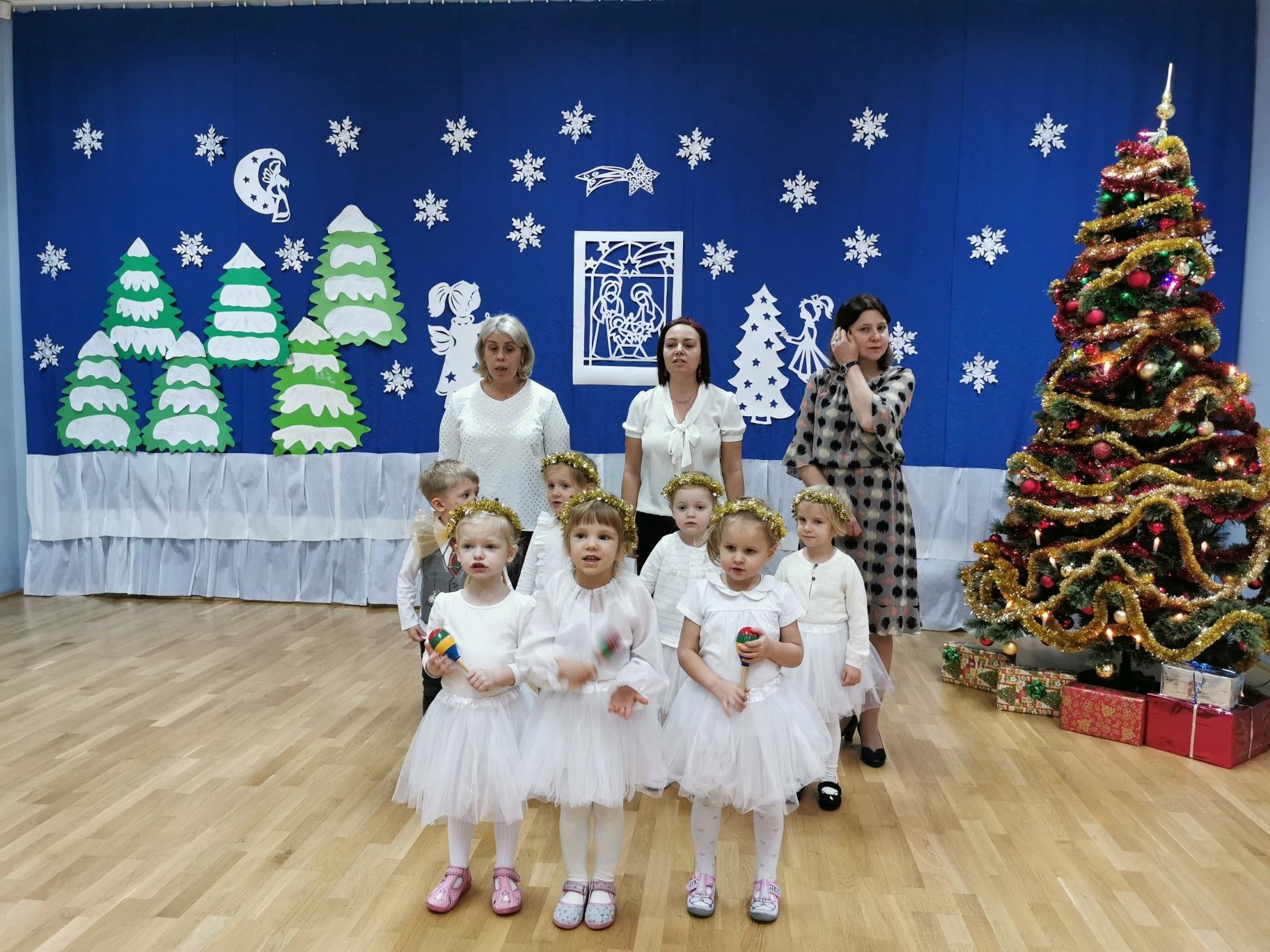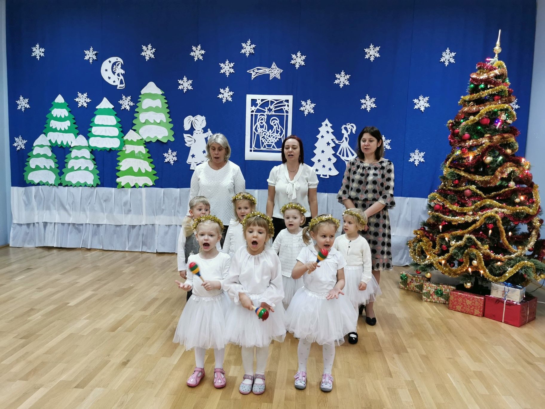 Dnia 16. 12. 2021r. w naszym przedszkolu odbyła się uroczystość związana z obchodzeniem Świąt Bożego Narodzenia. Przedszkolaki w strojach galowych wzięły udział w “Koncercie Kolęd”. Dzieci śpiewały piękne polskie kolędy i pastorałki. Temu wydarzeniu towarzyszyła miła świąteczna atmosfera. Po części artystycznej w swoich salach wysłuchały fragmentu Pisma Świętego o Narodzeniu Pana Jezusa. Ponadto rozdano dzieciom opłatek, złożono im świąteczne życzenia i zaproszono na Wigilijny poczęstunek przygotowany przez rodziców, za który serdecznie rodzicom dziękujemy.