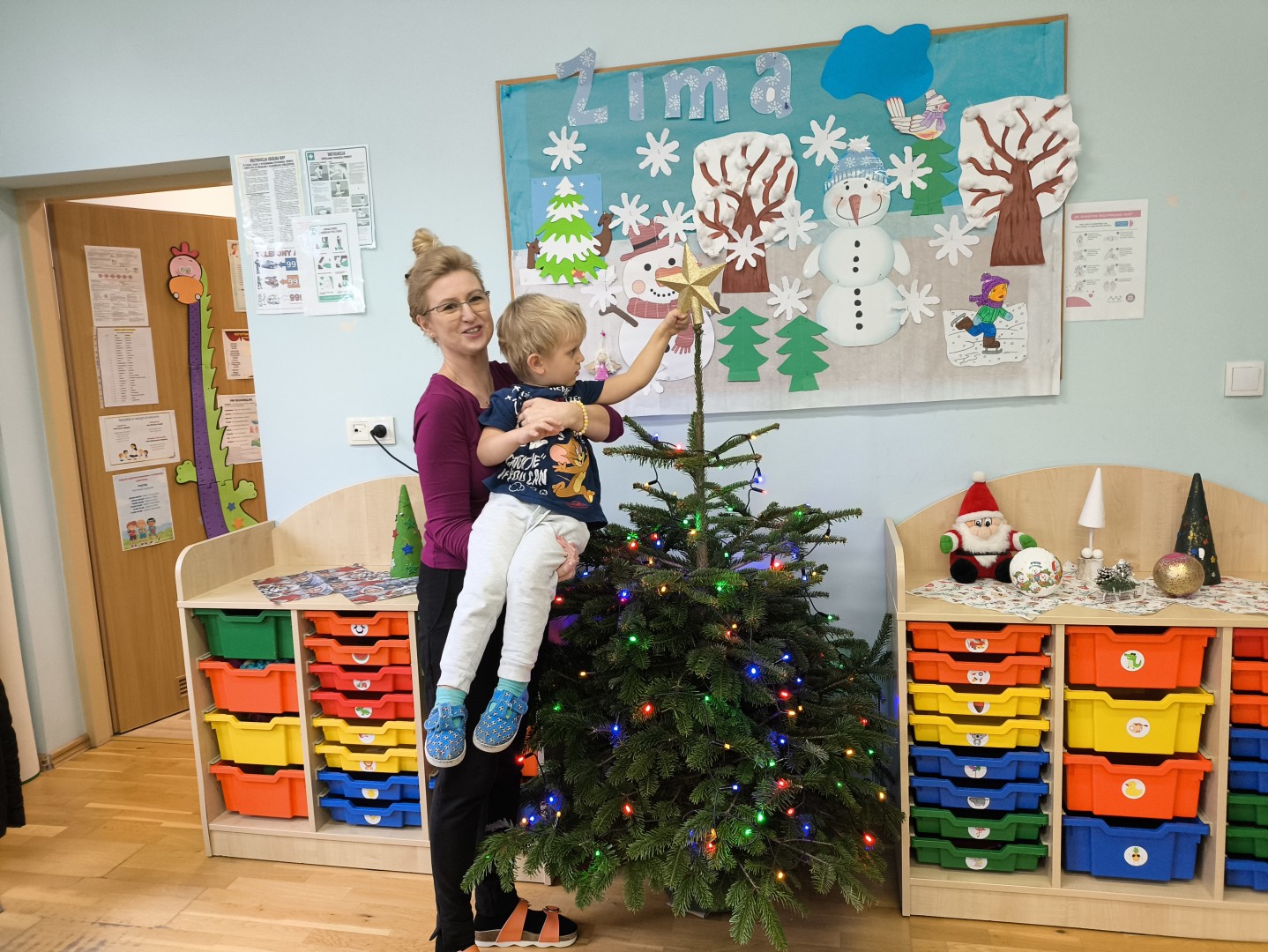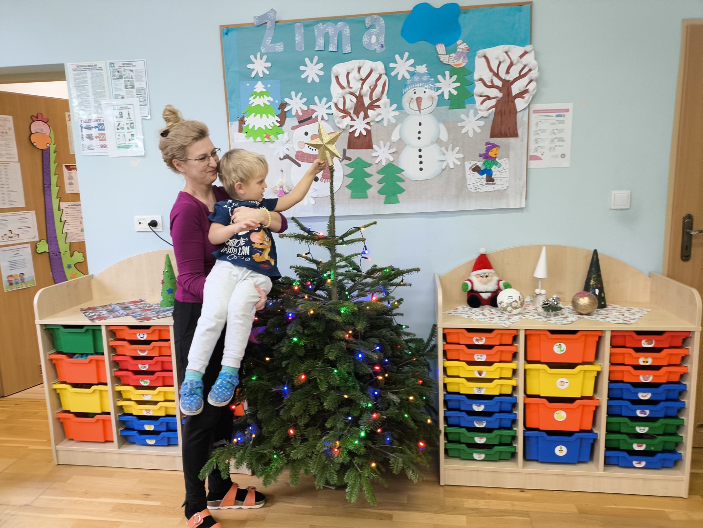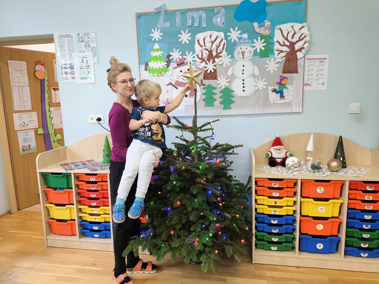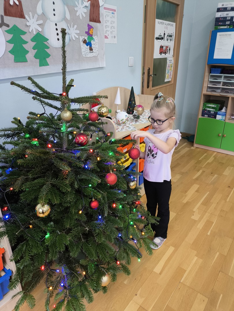 „Ważny dzień w przedszkolu mamy! Dziś choinkę ubieramy. Lampki, łańcuchy i bombki zakładamy. Dużo radości w to zawsze wkładamy!”