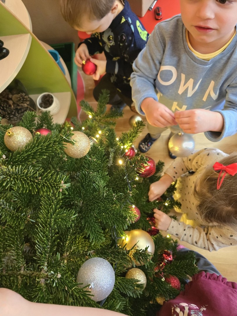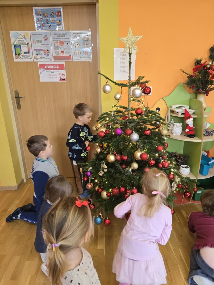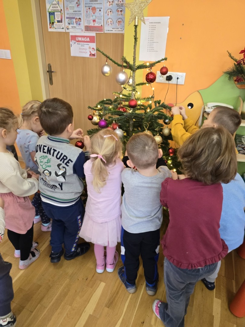 Stało się to już tradycją, że co roku nasze przedszkolaki ubierają przedszkolną choinkę. Tego dnia wszystkie dzieci zebrały się i samodzielnie zawieszały na choince ozdoby. Jak zwykle towarzyszyło temu wydarzeniu wiele zabawy i radości.