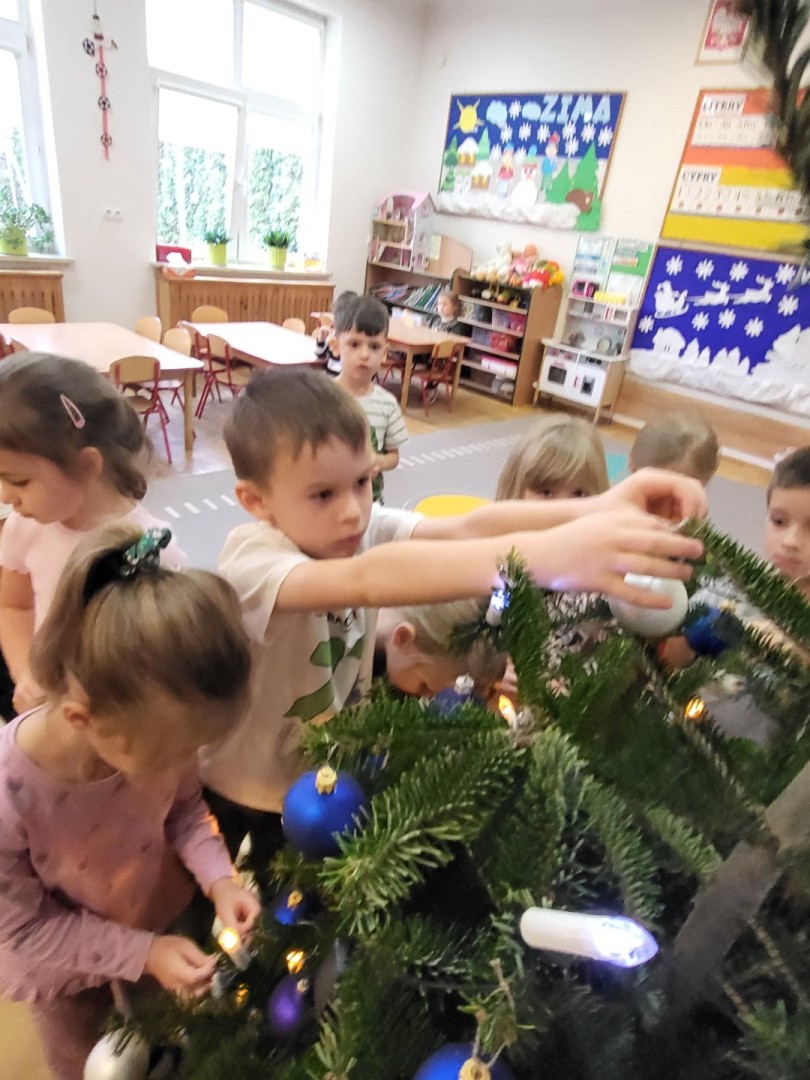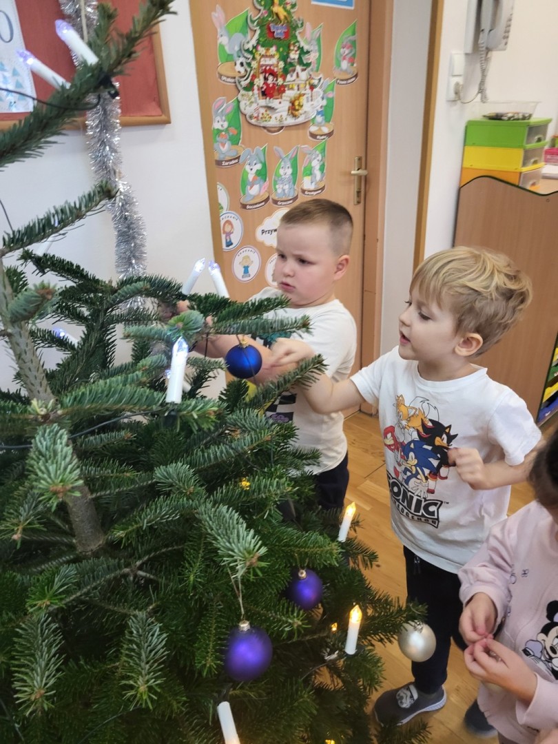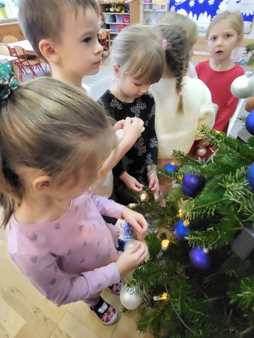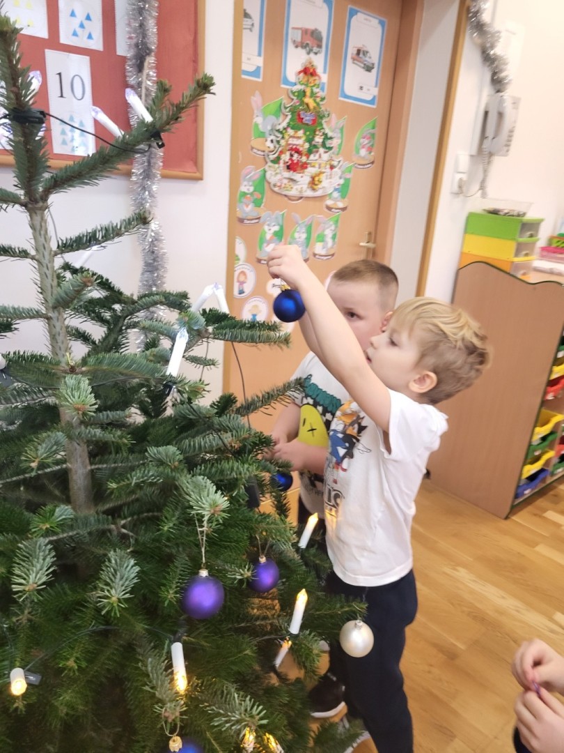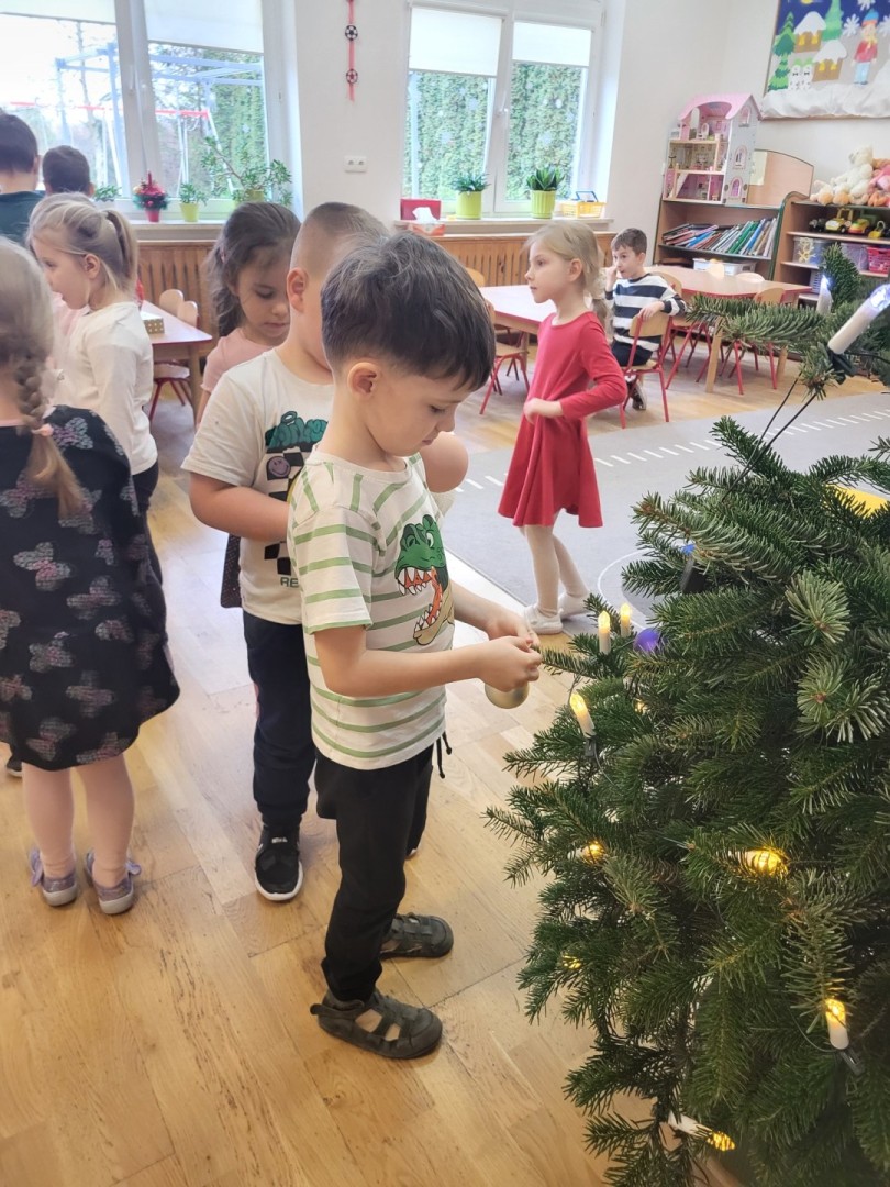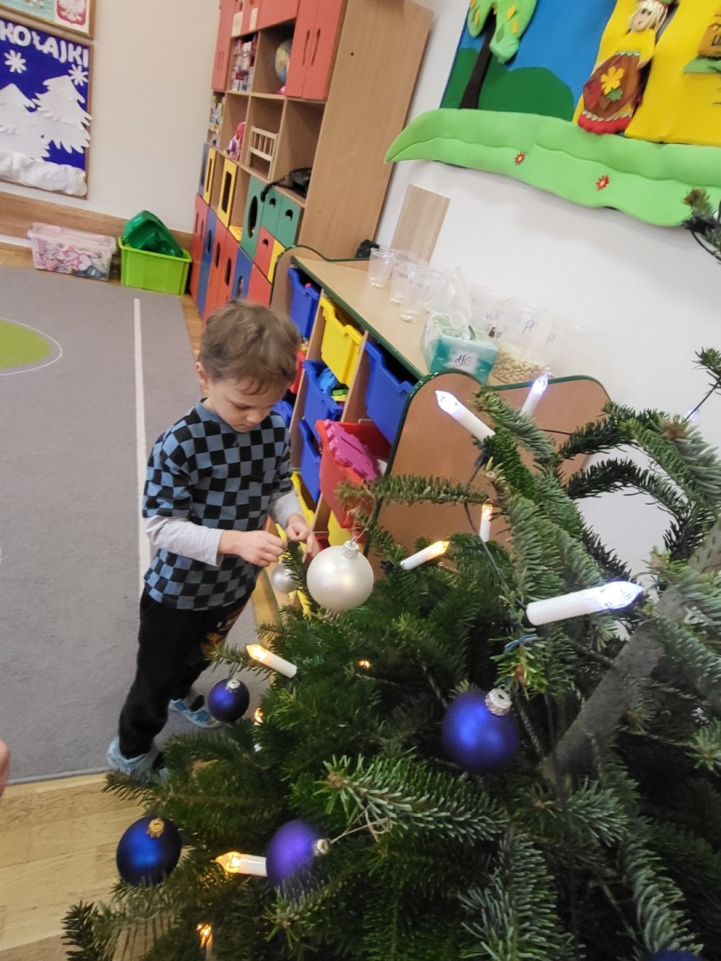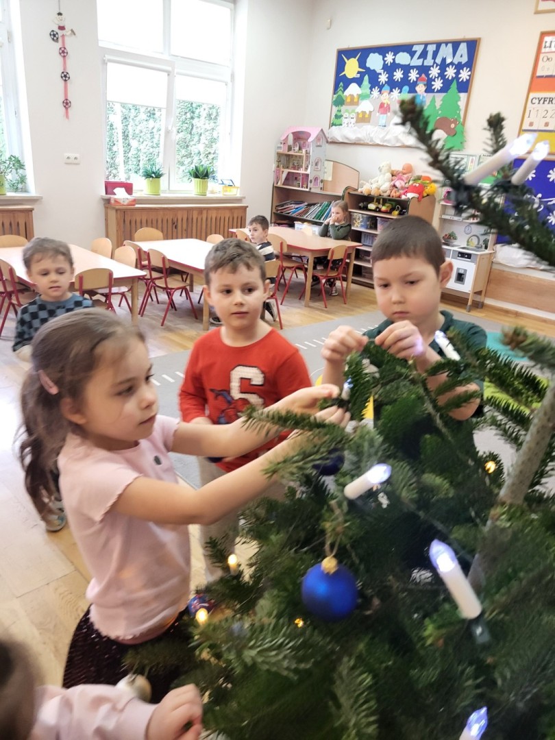 Święta Bożego Narodzenia wiążą się z tradycją ubierania świątecznego drzewka. W grupie Zajączki również nie mogło zabraknąć tego rytuału. Dzień ubierania choinki w przedszkolu jest dniem wyjątkowym. Dzieci z wielkim zaangażowaniem zawieszały choinkowe ozdoby. Ileż było radości wśród dzieci a w grupie od razu zrobiło się świątecznie. Drzewko zostało przystrojone bardzo szybko, wygląda wyjątkowo i przypomina nam, że Święta Bożego Narodzenia już tuż, tuż… Wszystkie dzieci jednogłośnie stwierdziły, ze choinka jest prześliczna, a na koniec nie mogło obejść się bez grupowego zdjęcia z świątecznym drzewkiem.