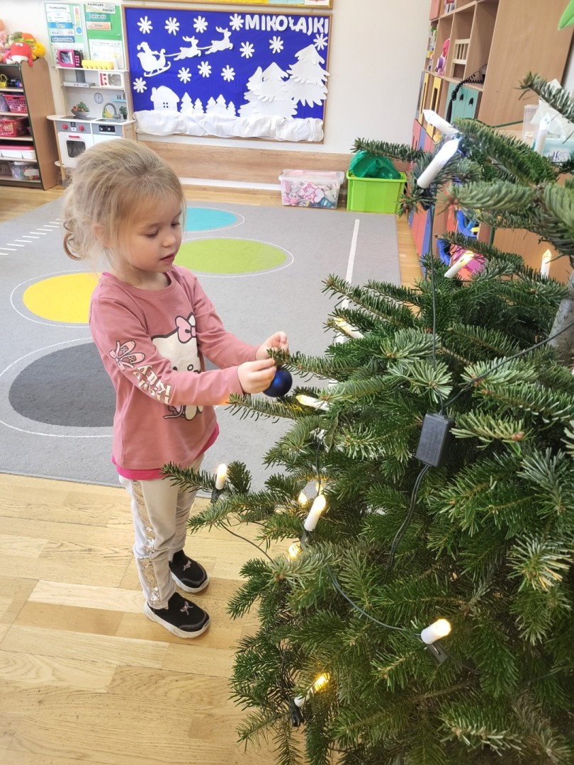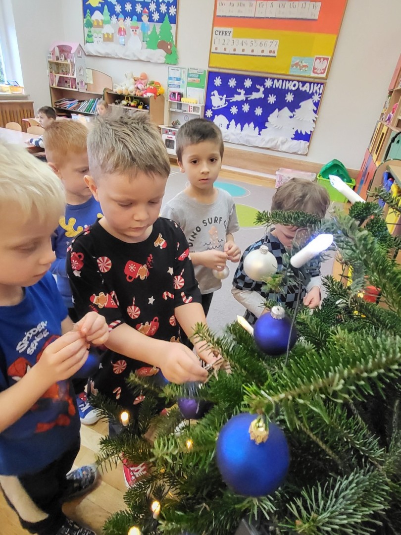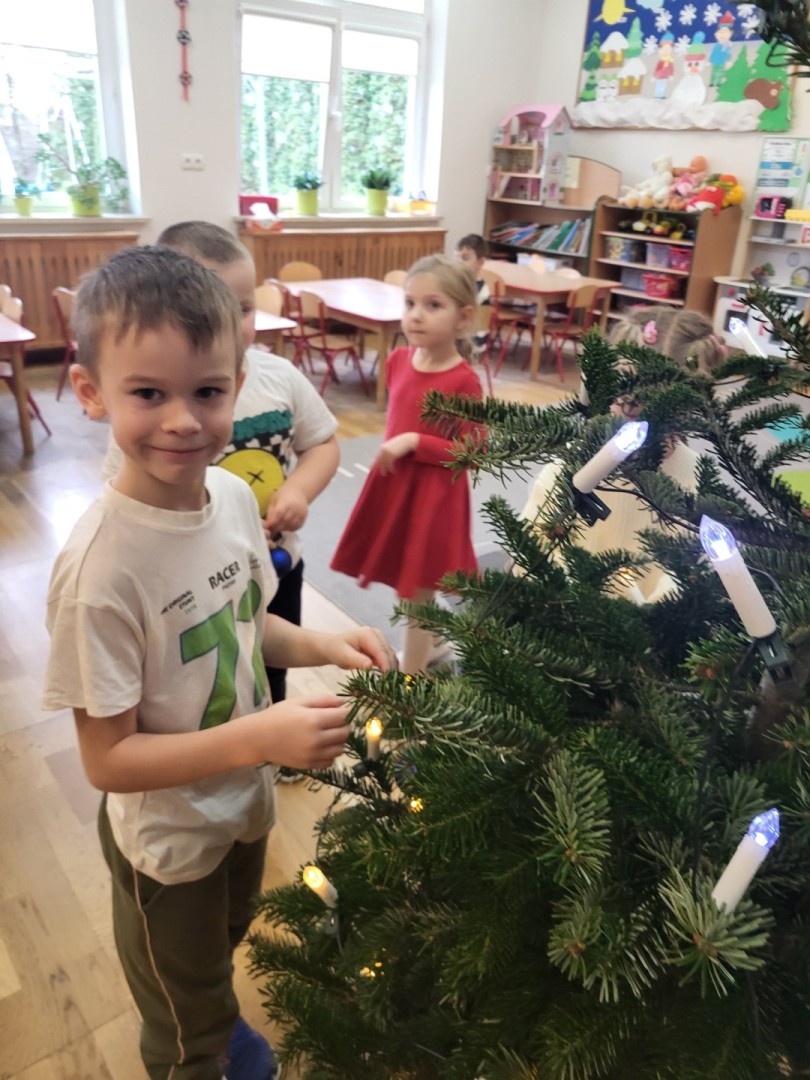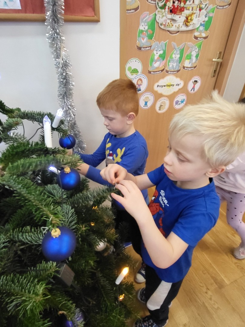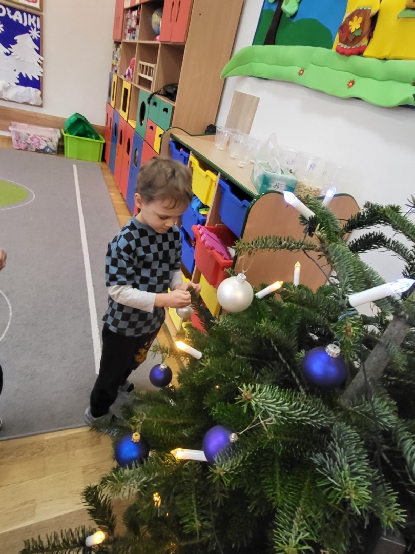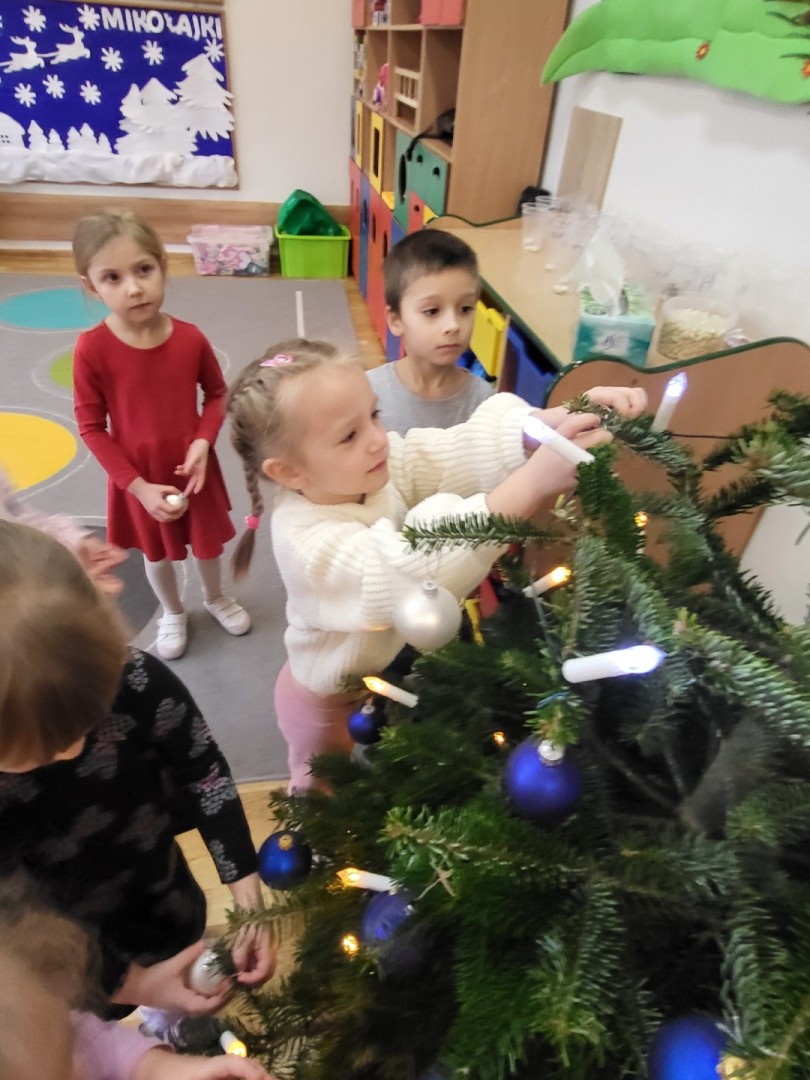 Święta Bożego Narodzenia wiążą się z tradycją ubierania świątecznego drzewka. W grupie Zajączki również nie mogło zabraknąć tego rytuału. Dzień ubierania choinki w przedszkolu jest dniem wyjątkowym. Dzieci z wielkim zaangażowaniem zawieszały choinkowe ozdoby. Ileż było radości wśród dzieci a w grupie od razu zrobiło się świątecznie. Drzewko zostało przystrojone bardzo szybko, wygląda wyjątkowo i przypomina nam, że Święta Bożego Narodzenia już tuż, tuż… Wszystkie dzieci jednogłośnie stwierdziły, ze choinka jest prześliczna, a na koniec nie mogło obejść się bez grupowego zdjęcia z świątecznym drzewkiem.