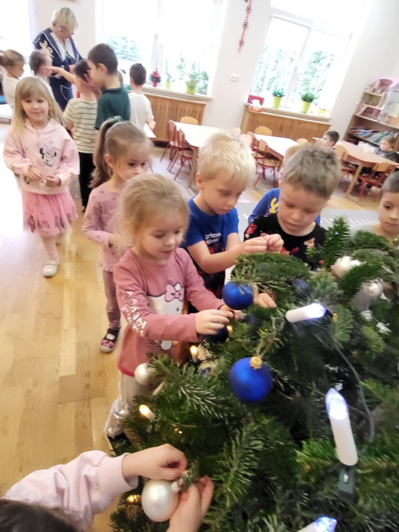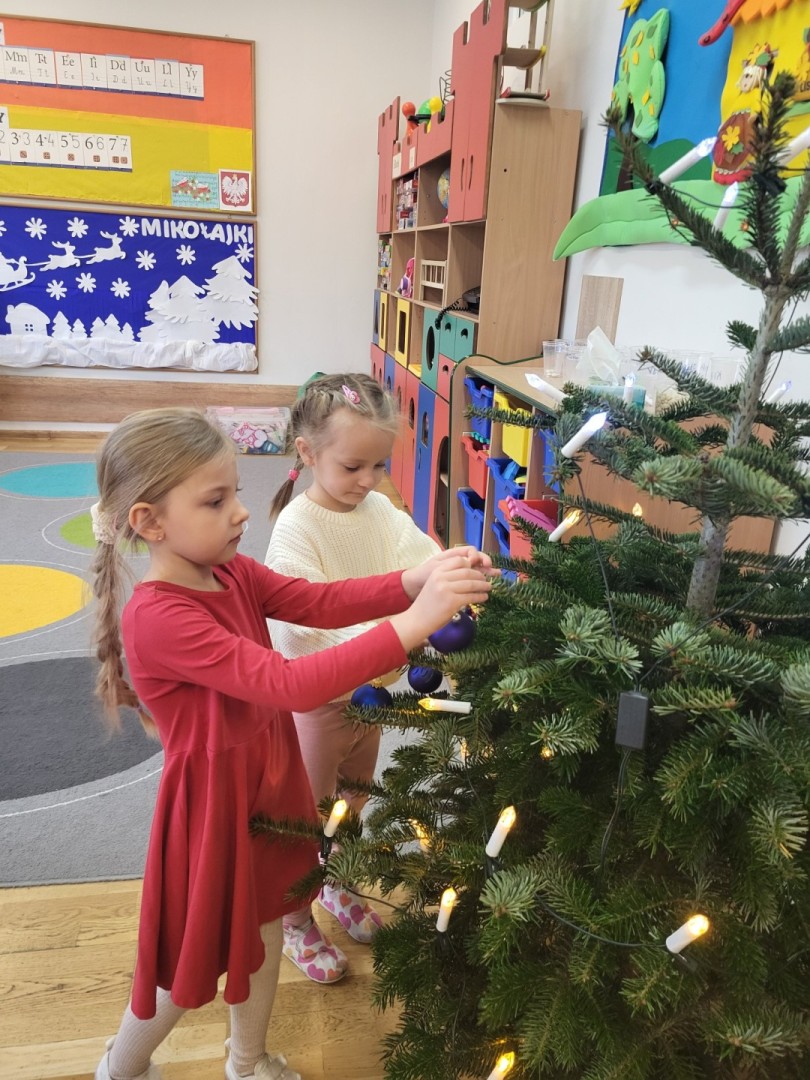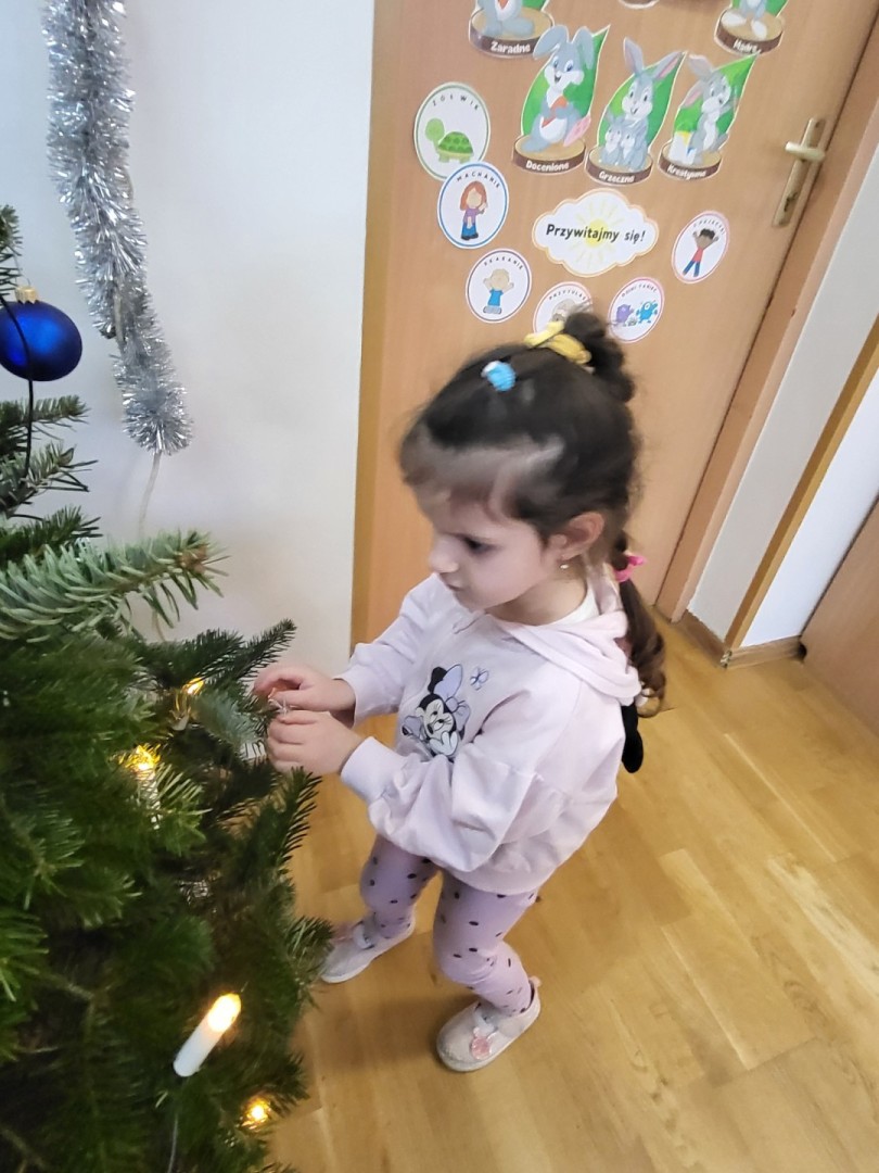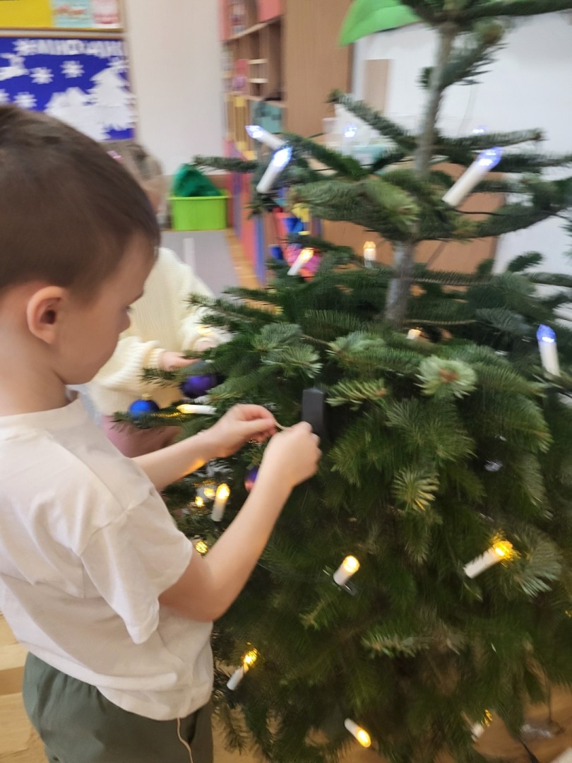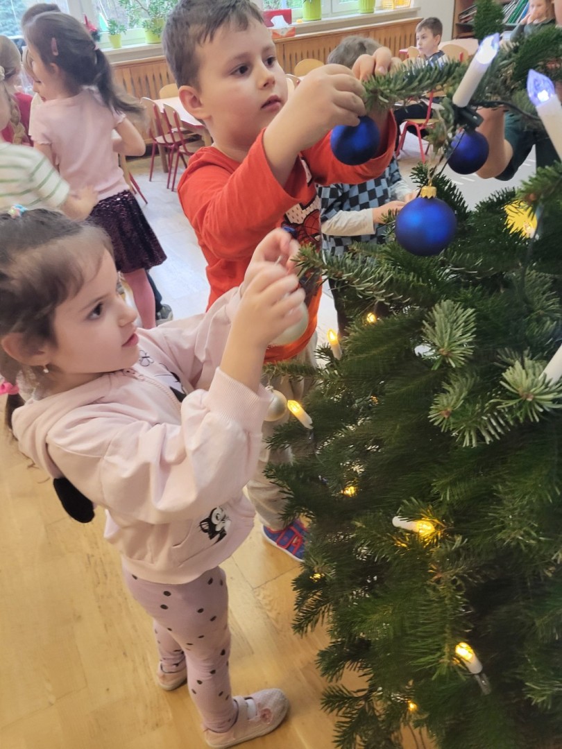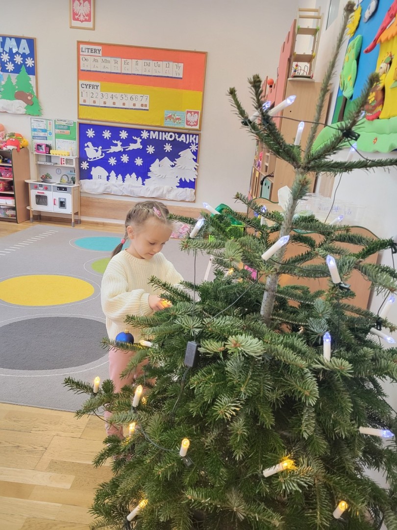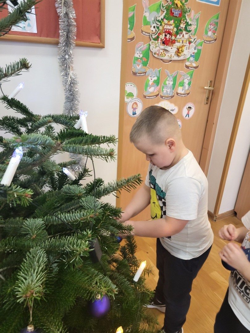 Święta Bożego Narodzenia wiążą się z tradycją ubierania świątecznego drzewka. W grupie Zajączki również nie mogło zabraknąć tego rytuału. Dzień ubierania choinki w przedszkolu jest dniem wyjątkowym. Dzieci z wielkim zaangażowaniem zawieszały choinkowe ozdoby. Ileż było radości wśród dzieci a w grupie od razu zrobiło się świątecznie. Drzewko zostało przystrojone bardzo szybko, wygląda wyjątkowo i przypomina nam, że Święta Bożego Narodzenia już tuż, tuż… Wszystkie dzieci jednogłośnie stwierdziły, ze choinka jest prześliczna, a na koniec nie mogło obejść się bez grupowego zdjęcia z świątecznym drzewkiem.