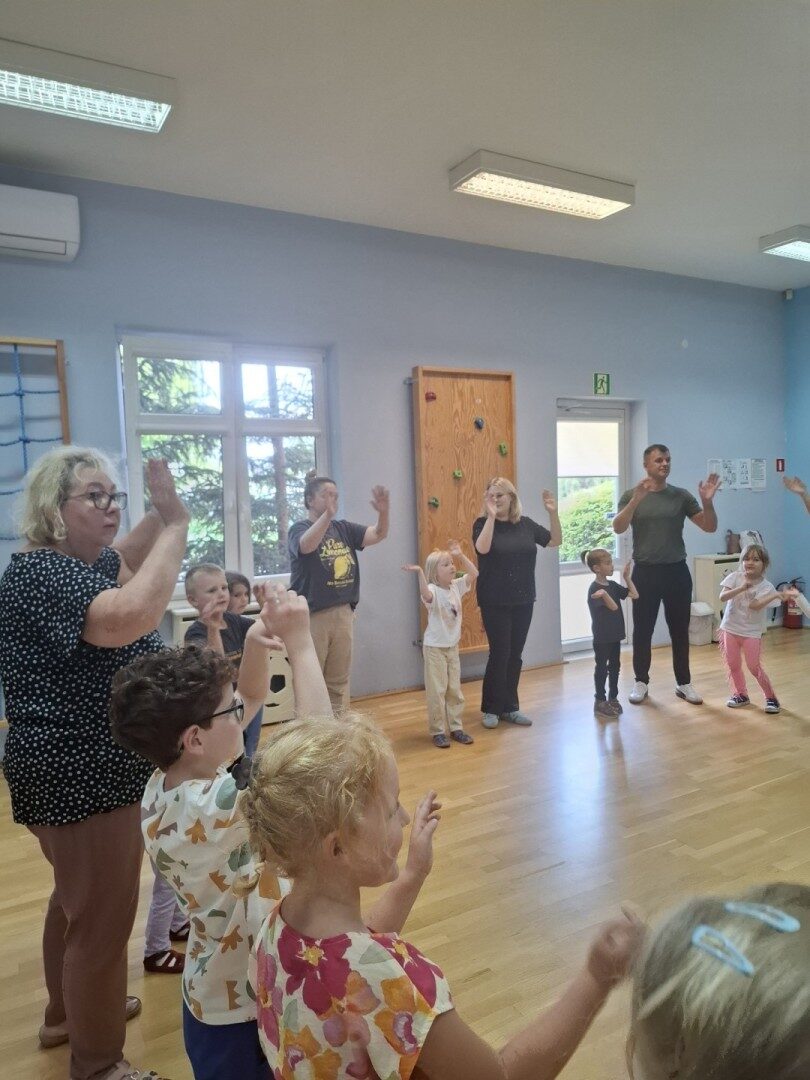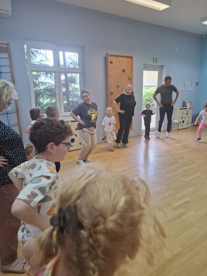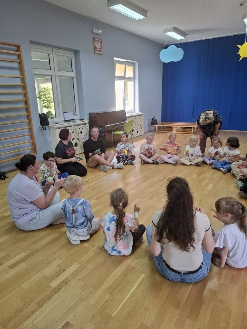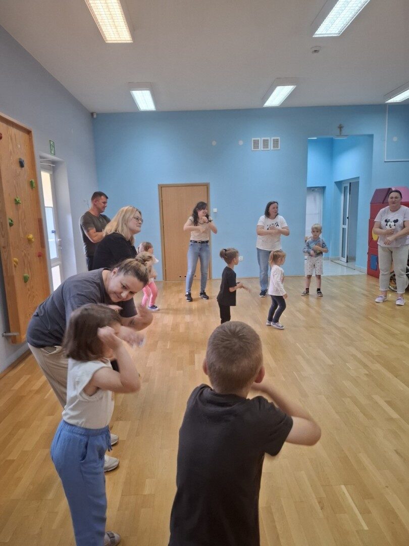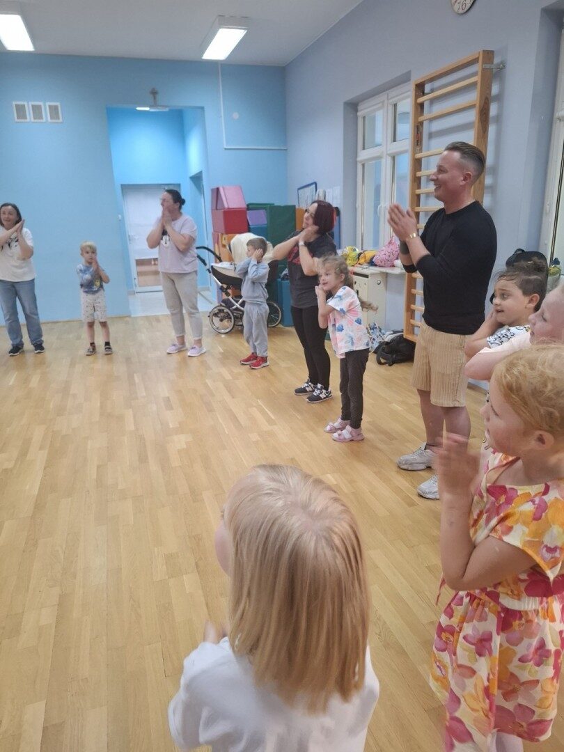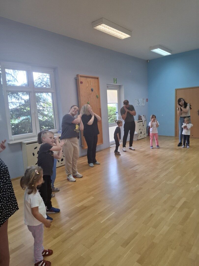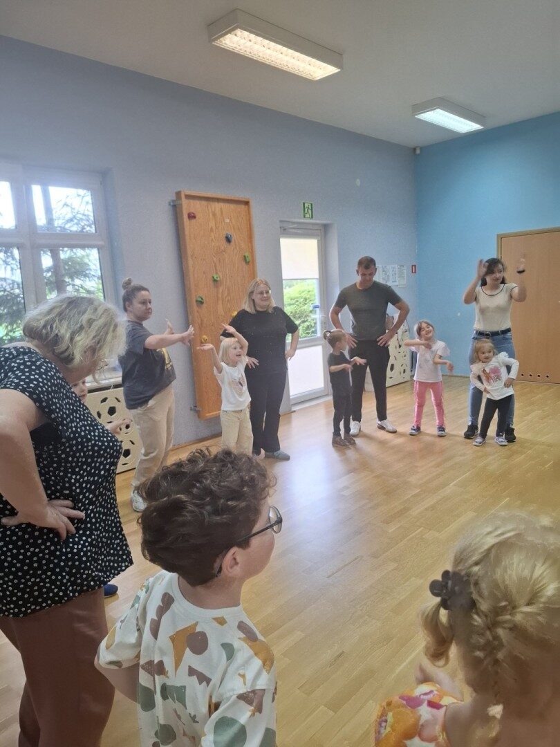 Dnia 12.06.2025r. w grupie „ŻABKI” odbyło się spotkanie integracyjne rodziców i dzieci. Podczas warsztatów przedszkolaki z rodzicami miały możliwość spędzenia wspólnie czasu doskonale bawiąc się podczas zabaw muzyczno- ruchowych. Spotkanie rozpoczęliśmy od zaśpiewania piosenki pt „Hej witam Was” , która towarzyszy nam zawsze przed rozpoczęciem zajęć. Następnie wykonaliśmy rozgrzewkę wykorzystując znane dzieciom zabawy muzyczno-ruchowe takie jak „Body Perfection” czy „A ram zam zam”. Następnie bawiliśmy się z wykorzystaniem Sigumy, woreczków gimnastycznych oraz obręczy. Kolejną aktywnością była joga prowadzona w ramach innowacji pedagogicznej. Dzieci wspólnie z rodzicami wykonały rozgrzewkę, następnie pokazały dzieciom ich ulubione asany takie jak: drzewo, kobra, lew, krzesło, żaba bocian, kwiat lotosu, pies z głową w górze, pies z głową w dół, kwiat lotosu itp. Na zakończenie rodzice wykonali masaż dzieciom wykorzystując w tym celu piłki sensoryczne po czym nastąpiła zamiana i to dzieci robiły masaż swoim rodzicom. Podczas warsztatów zarówno rodzice jak i dzieci wykazali się twórczą kreatywnością. Na koniec wykonaliśmy ćwiczenia relaksacyjne. Tego typu spotkanie dało możliwość twórczego spędzenia czasu z dziećmi. Spotkanie przebiegało w miłej i serdecznej atmosferze.
