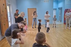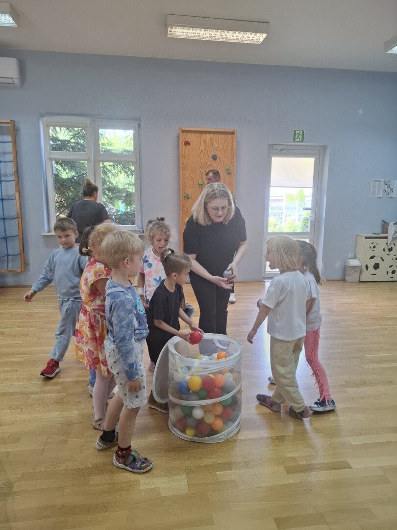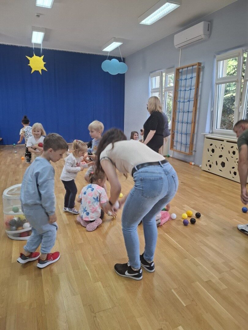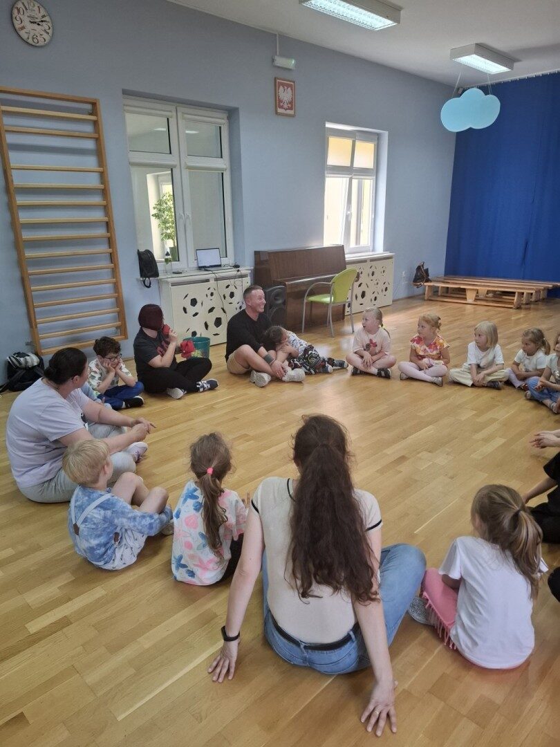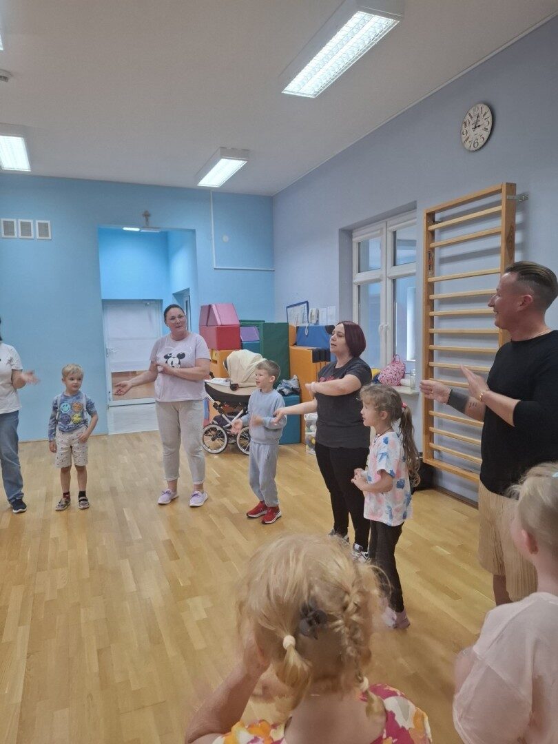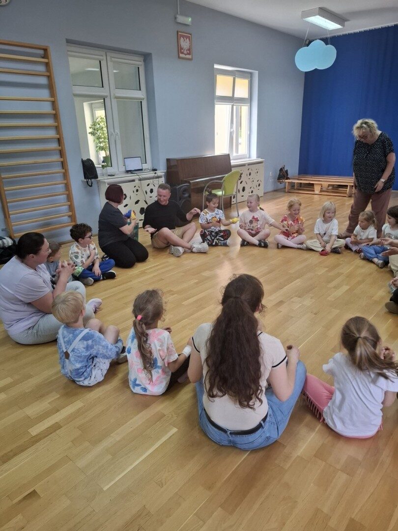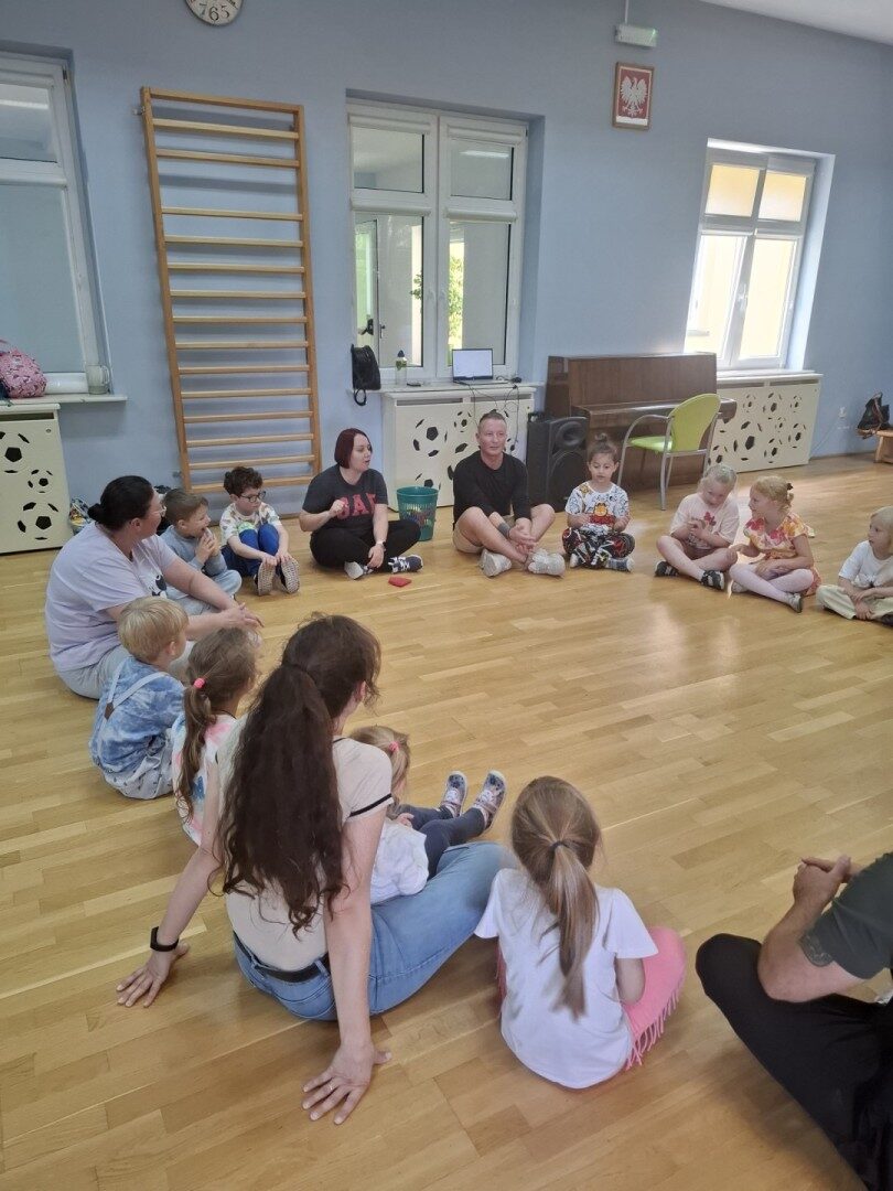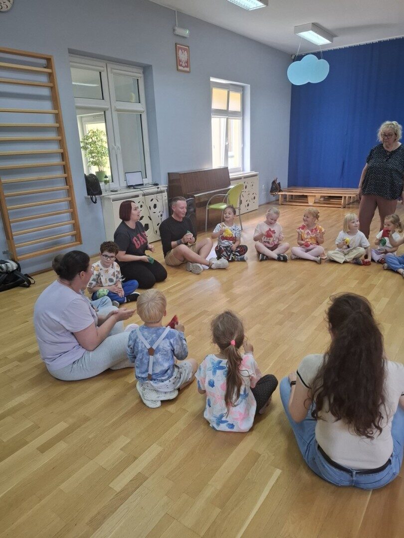 Dnia 12.06.2025r. w grupie „ŻABKI” odbyło się spotkanie integracyjne rodziców i dzieci. Podczas warsztatów przedszkolaki z rodzicami miały możliwość spędzenia wspólnie czasu doskonale bawiąc się podczas zabaw muzyczno- ruchowych. Spotkanie rozpoczęliśmy od zaśpiewania piosenki pt „Hej witam Was” , która towarzyszy nam zawsze przed rozpoczęciem zajęć. Następnie wykonaliśmy rozgrzewkę wykorzystując znane dzieciom zabawy muzyczno-ruchowe takie jak „Body Perfection” czy „A ram zam zam”. Następnie bawiliśmy się z wykorzystaniem Sigumy, woreczków gimnastycznych oraz obręczy. Kolejną aktywnością była joga prowadzona w ramach innowacji pedagogicznej. Dzieci wspólnie z rodzicami wykonały rozgrzewkę, następnie pokazały dzieciom ich ulubione asany takie jak: drzewo, kobra, lew, krzesło, żaba bocian, kwiat lotosu, pies z głową w górze, pies z głową w dół, kwiat lotosu itp. Na zakończenie rodzice wykonali masaż dzieciom wykorzystując w tym celu piłki sensoryczne po czym nastąpiła zamiana i to dzieci robiły masaż swoim rodzicom. Podczas warsztatów zarówno rodzice jak i dzieci wykazali się twórczą kreatywnością. Na koniec wykonaliśmy ćwiczenia relaksacyjne. Tego typu spotkanie dało możliwość twórczego spędzenia czasu z dziećmi. Spotkanie przebiegało w miłej i serdecznej atmosferze.